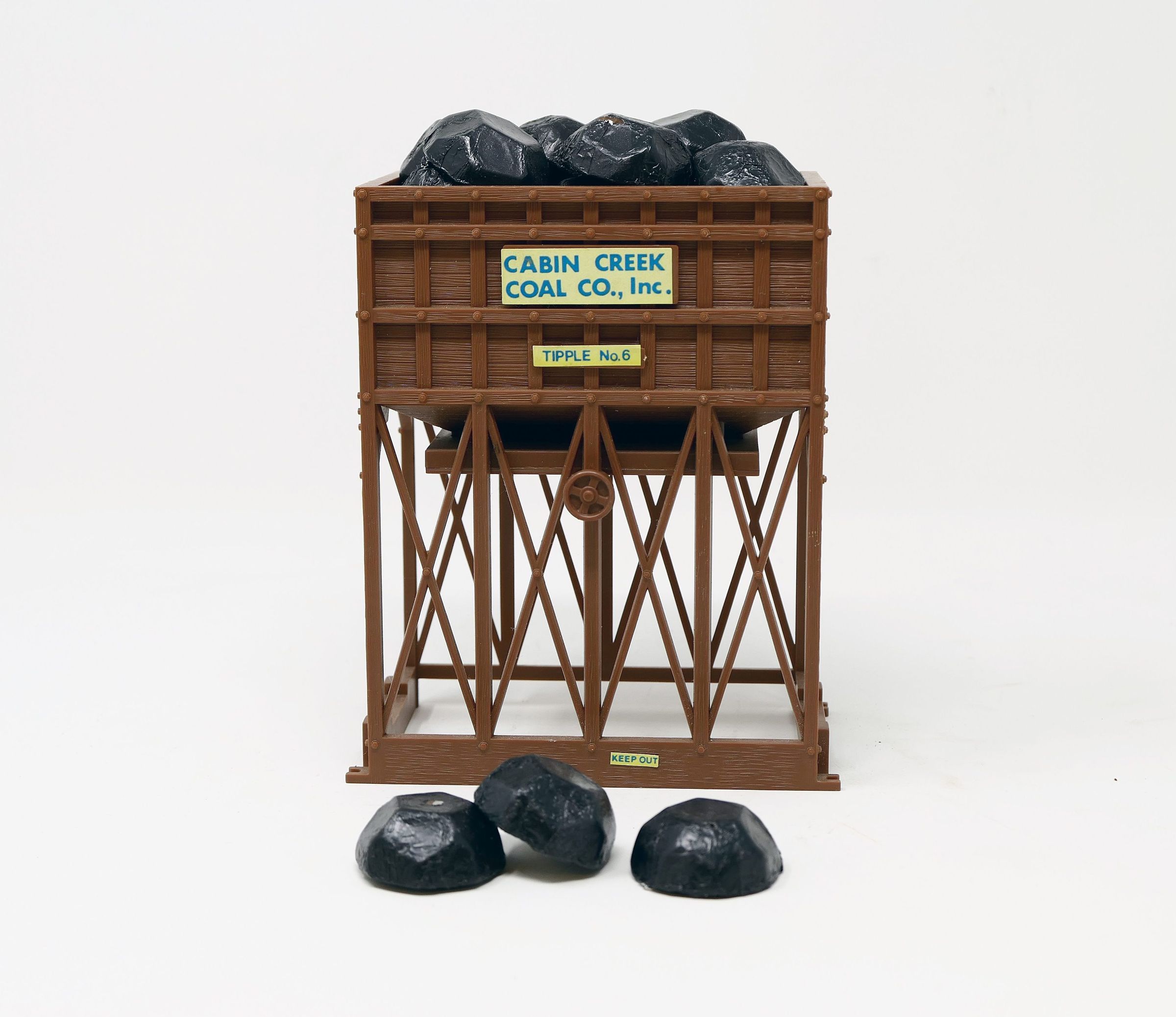 Plastic model of a coal tipple, of the type used to load railroad hopper cars, filled with black foil-wrapped chocolates imitating coal.Context