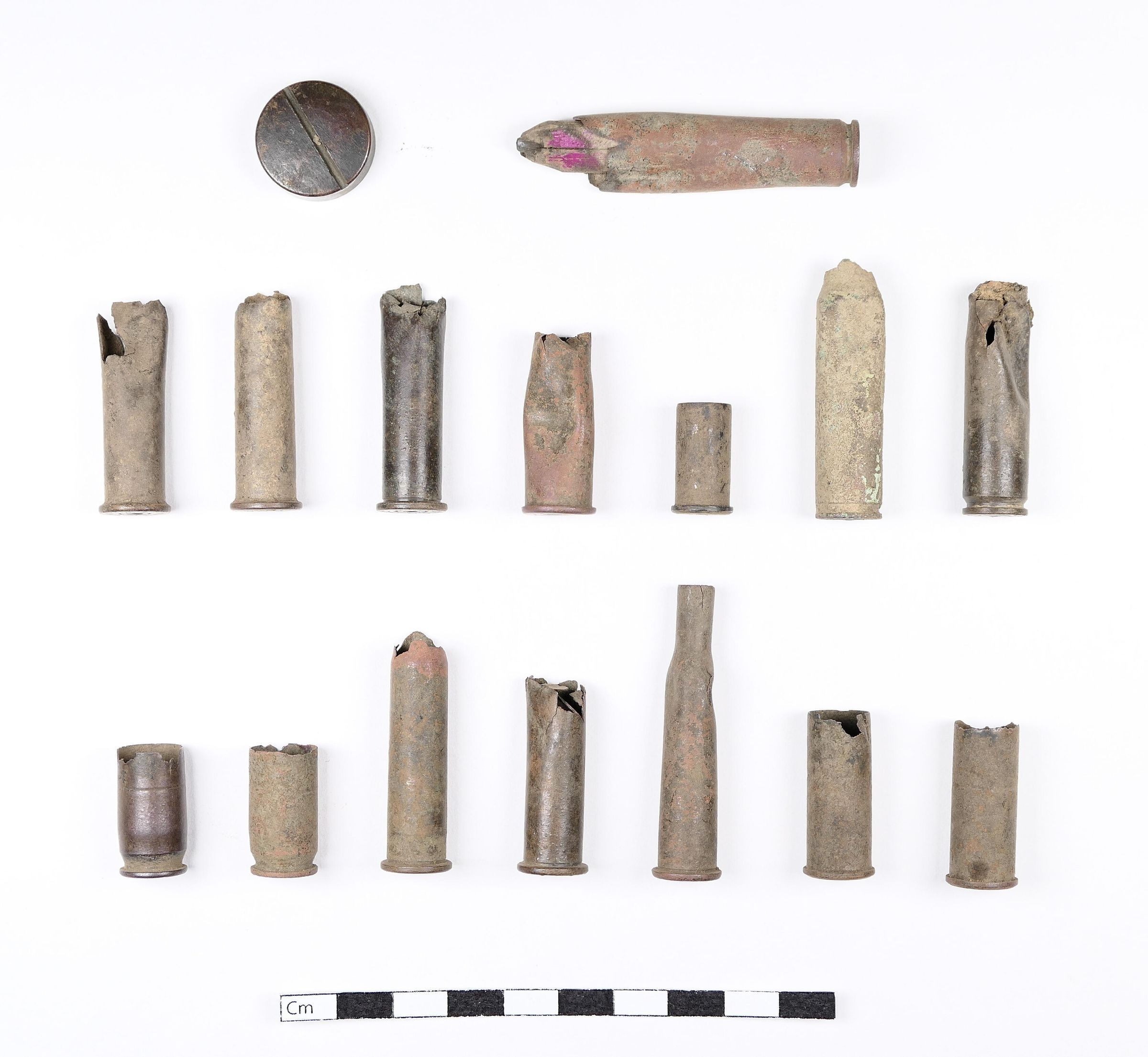 Eighteen (18) 30.06 casings of various makes, suggesting rifle loads rather than machine gun fire.