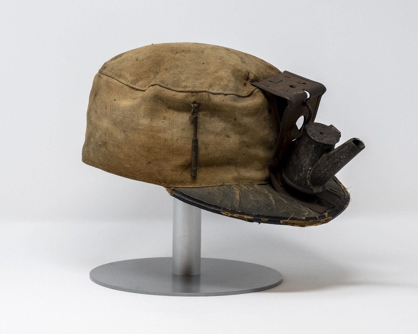 Cloth miner's cap with leatherette brim and attached oil wick "teapot" lamp. Wire cleaning brush is attached to one side of the hat with a wire stitch.Context