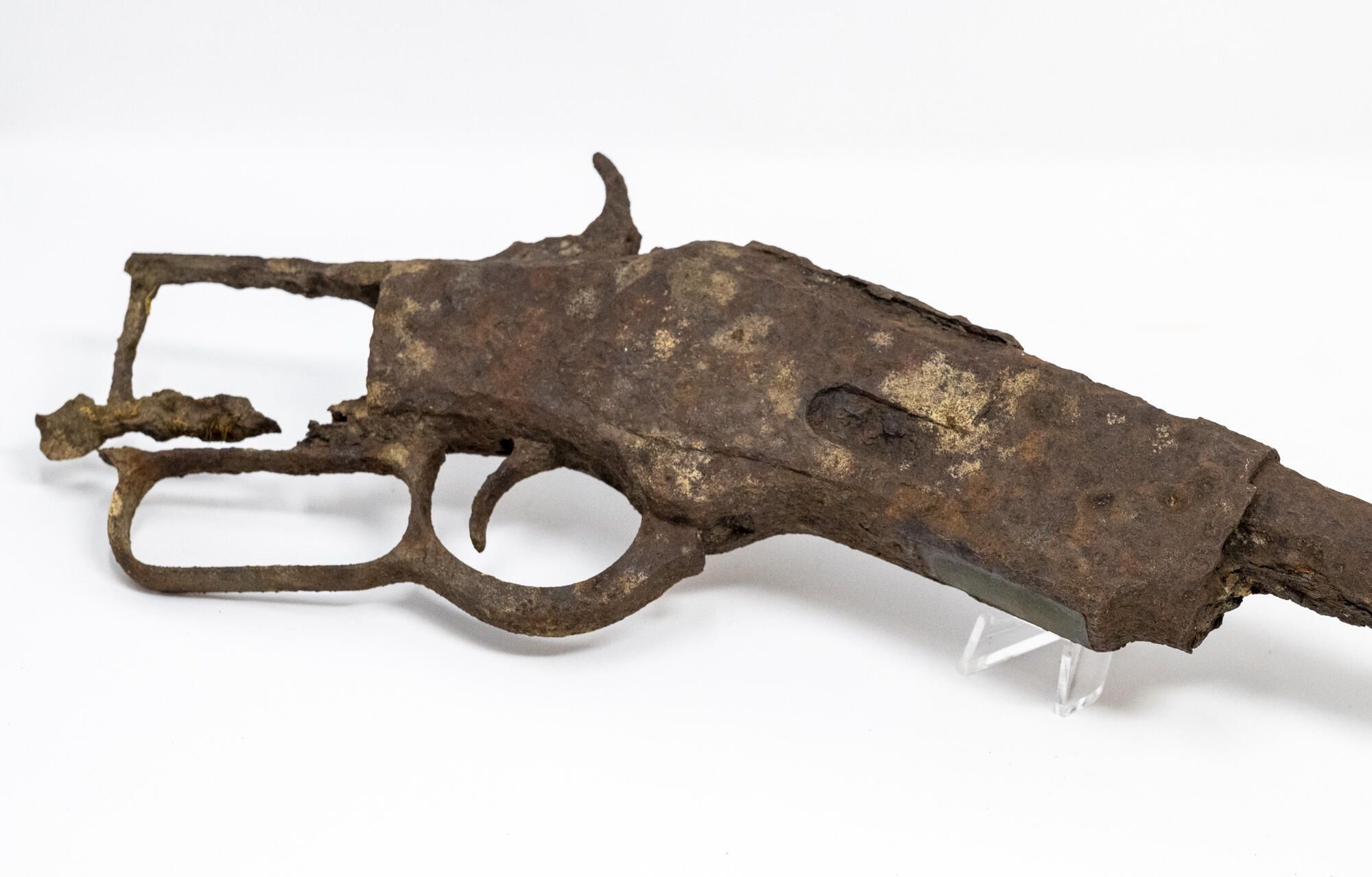 Fully rusted-over Winchester lever-action repeater rifle, wooden stock has rotted away completely. Chambered for .44-40 cartridge, this rifle was found loaded with eight rounds in the magazine.Firearm Type