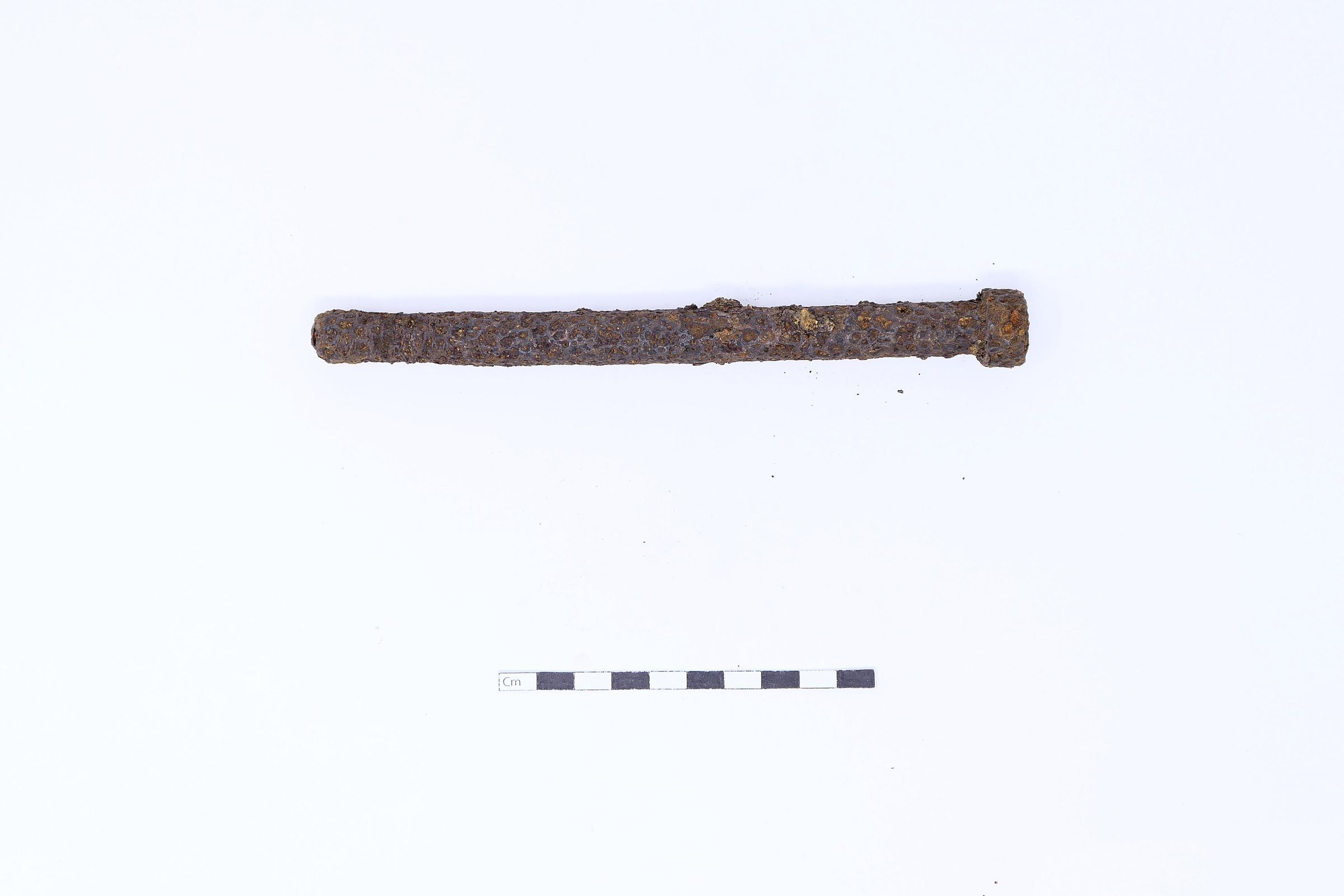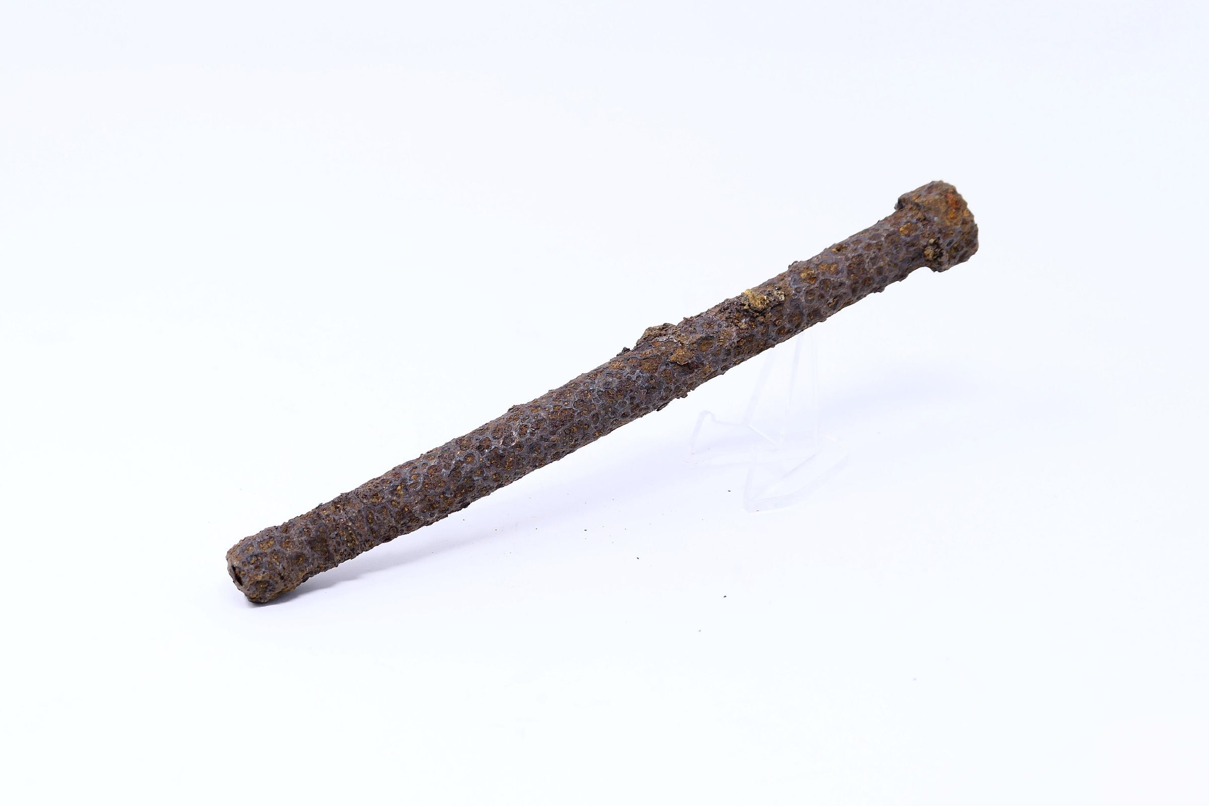 One (1) heavily corroded steel bolt or fastener from archaeological dig in a midden at Whites Trace Branch Site #3 in Nov.2009 (day unrecorded).Collection