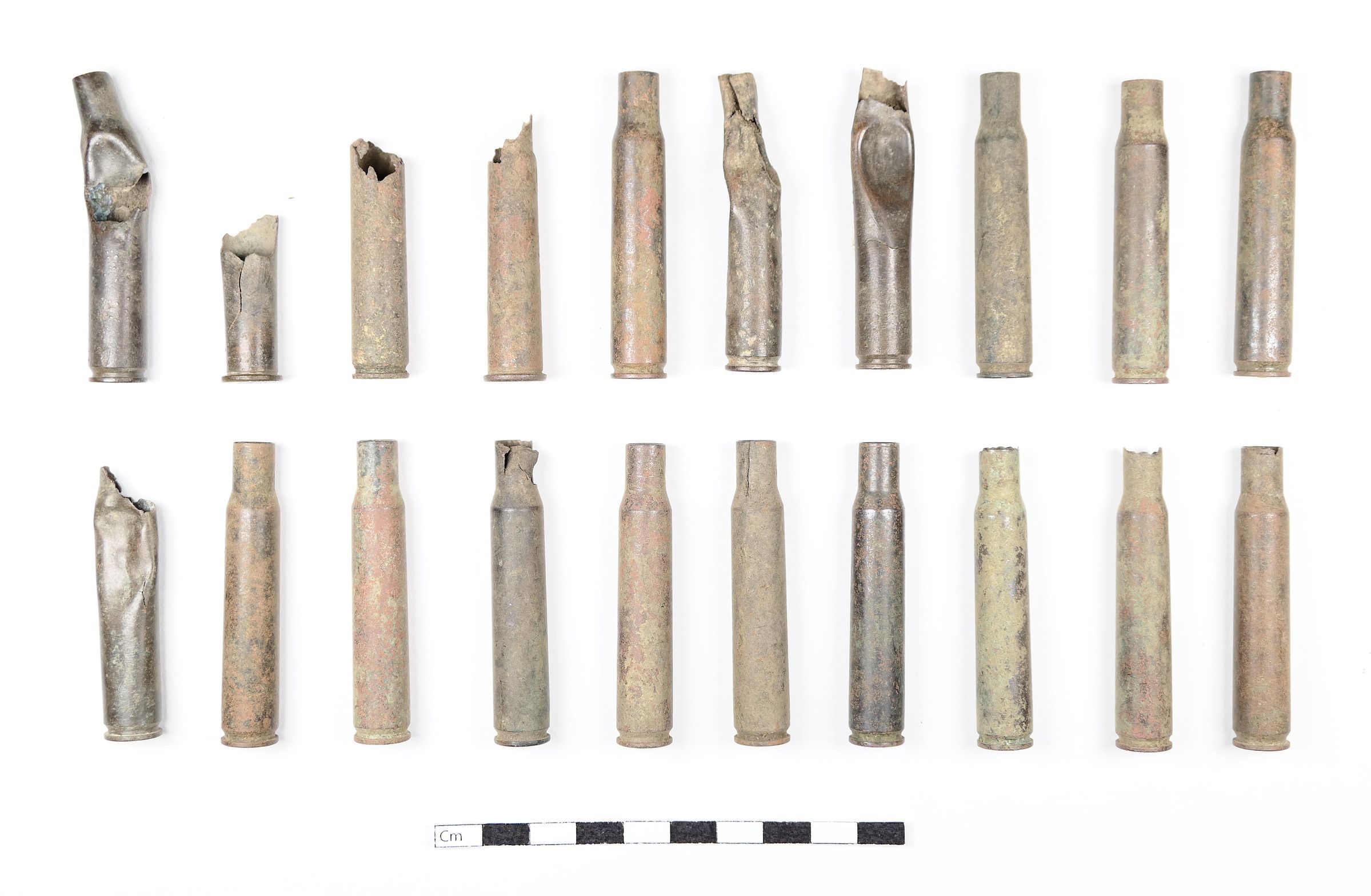 Eighteen (18) 30.06 casings of various makes, suggesting rifle loads rather than machine gun fire.