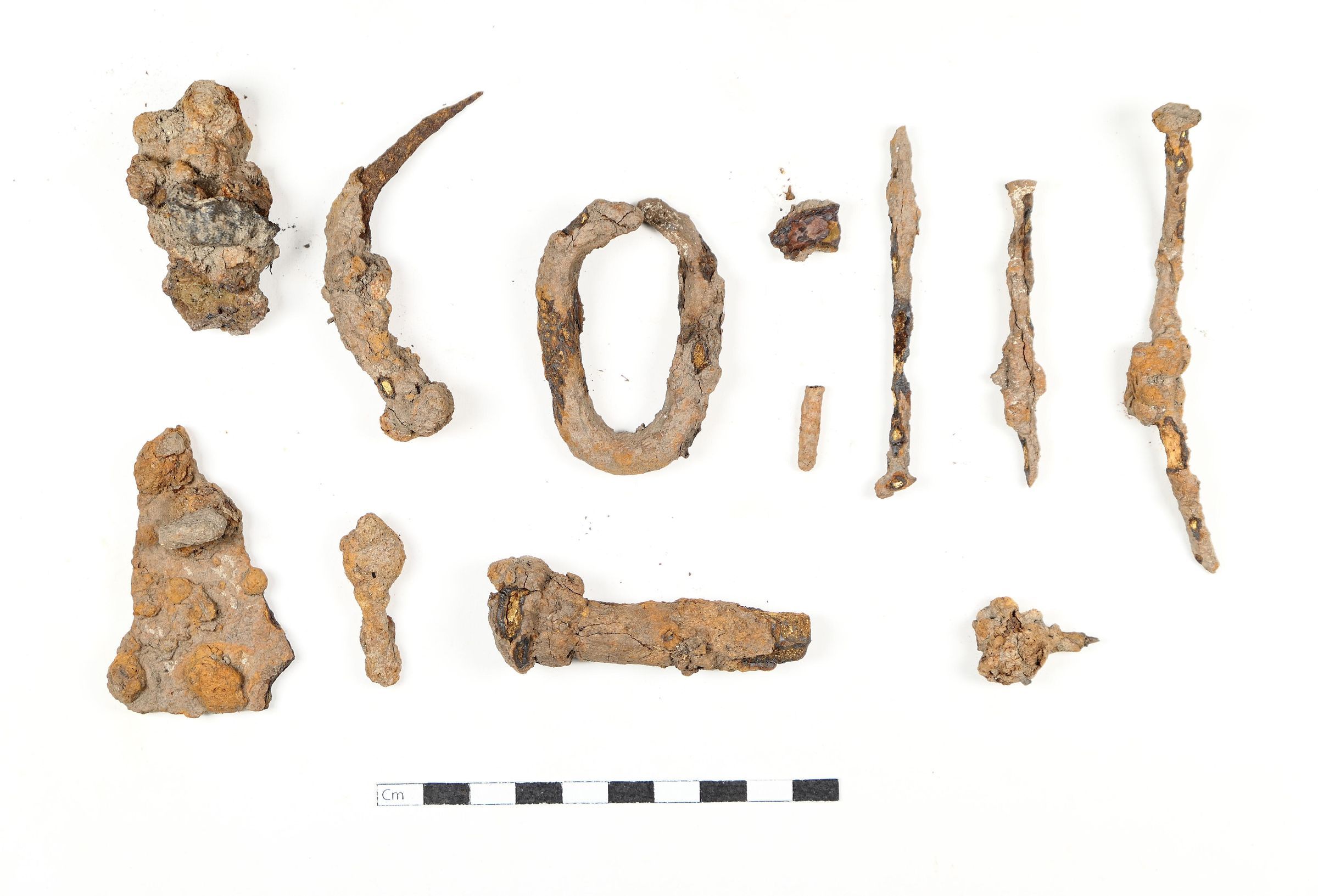 six (6) more various iron hardware + multiple trace pieces of likely-related rusted metal