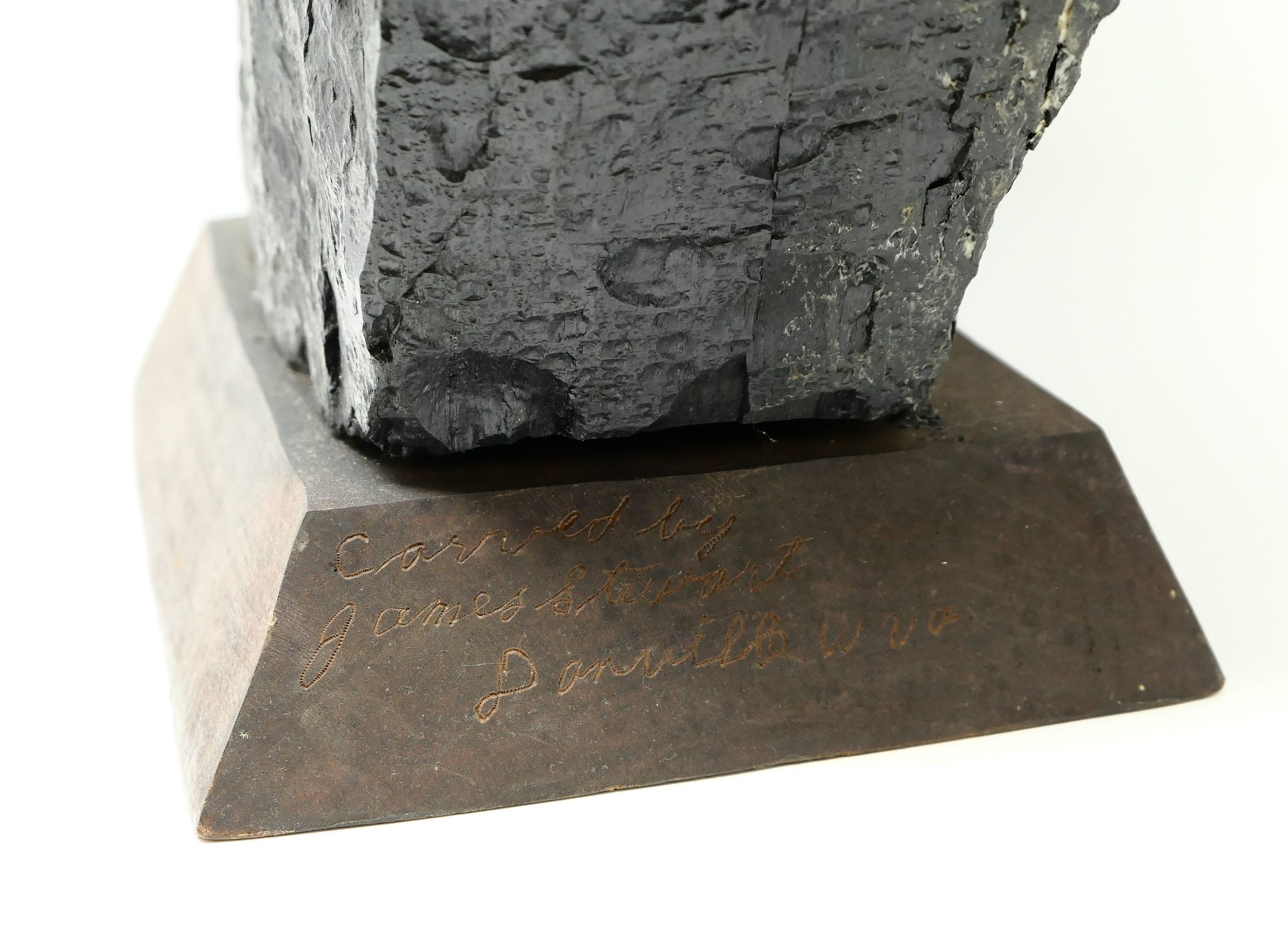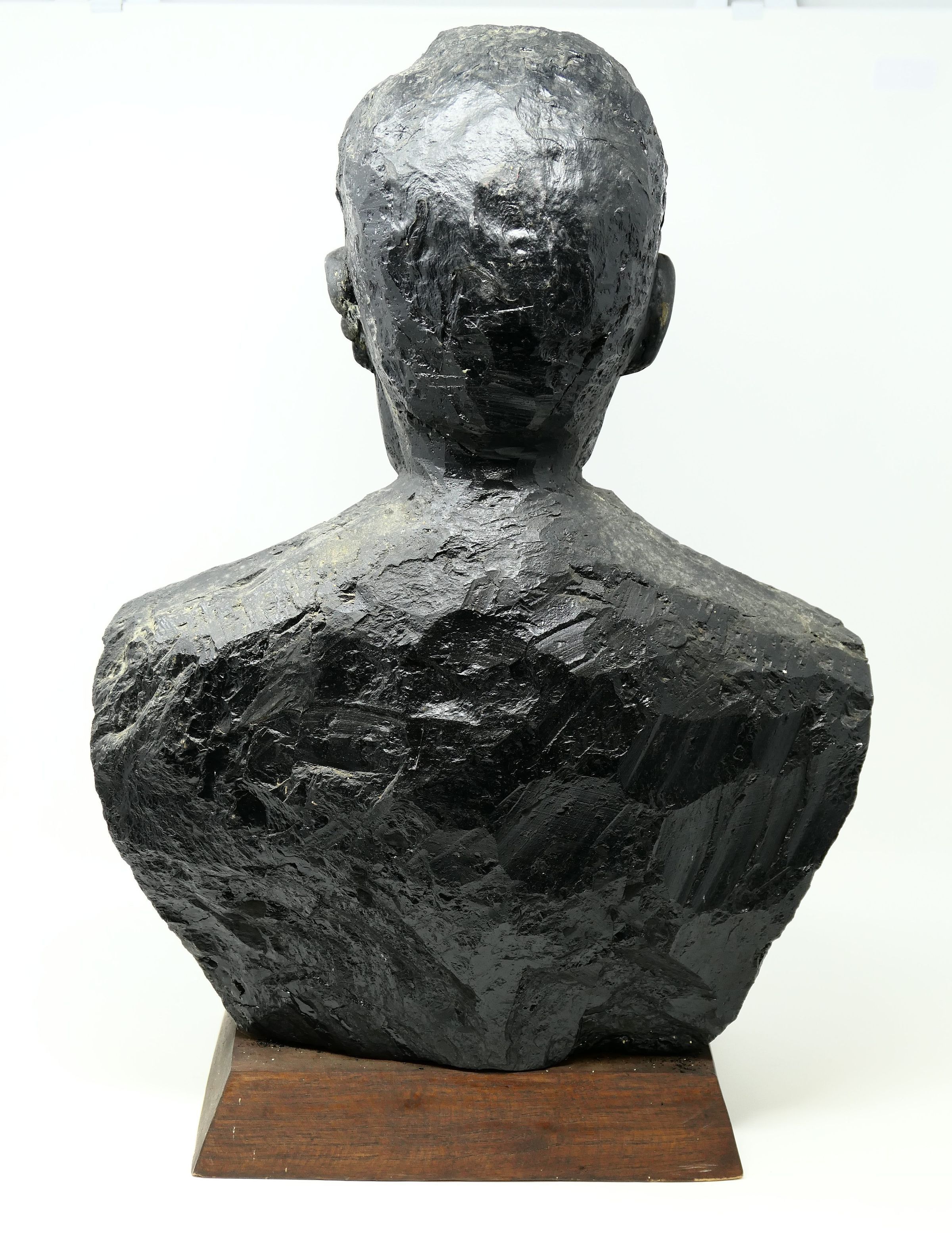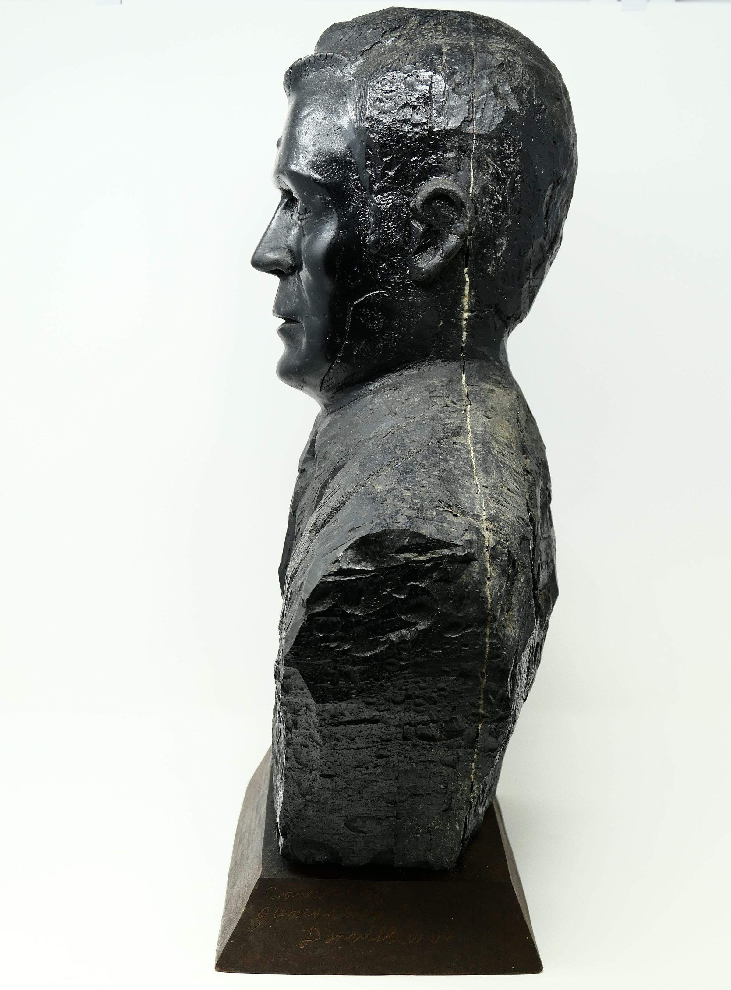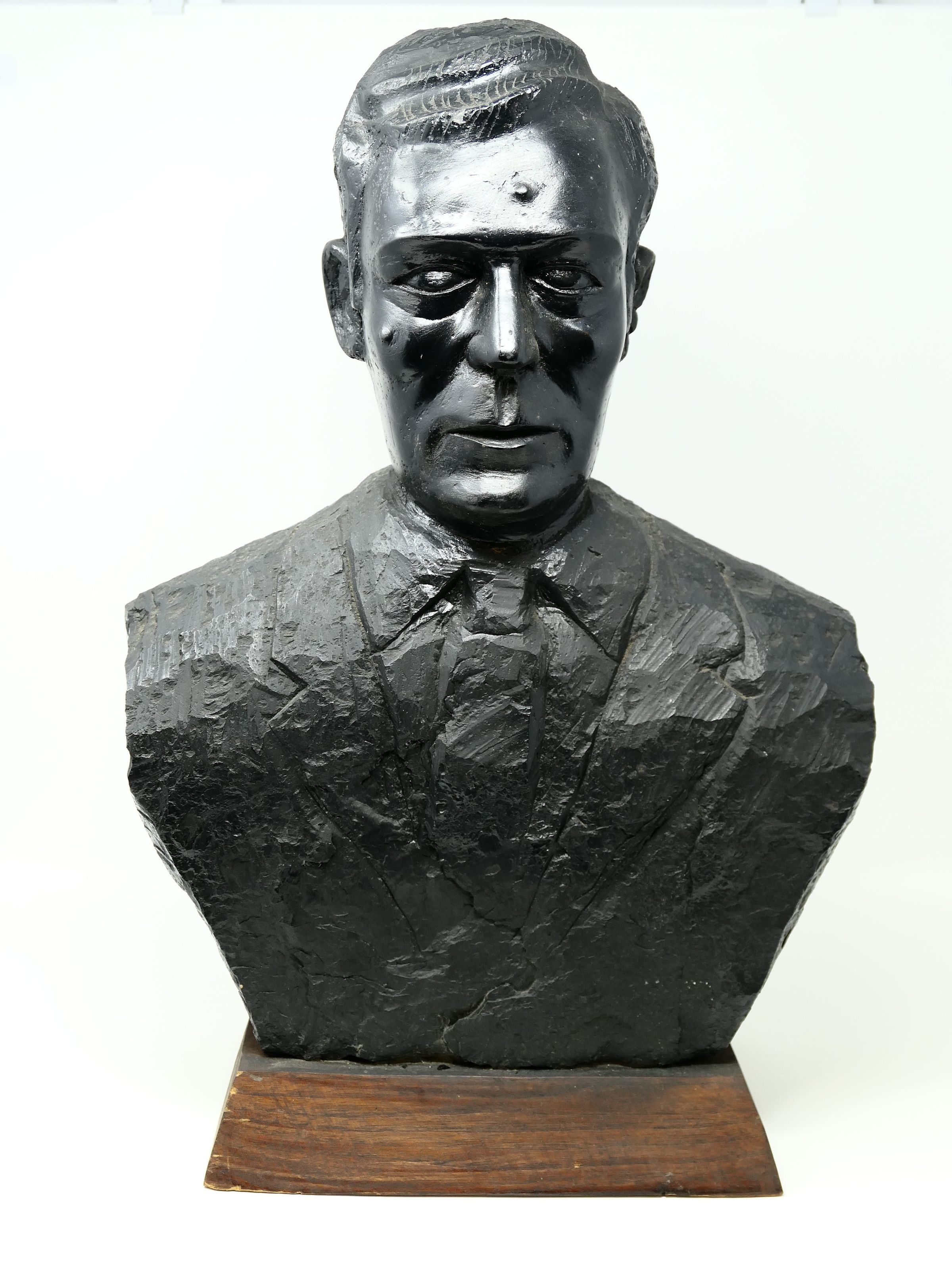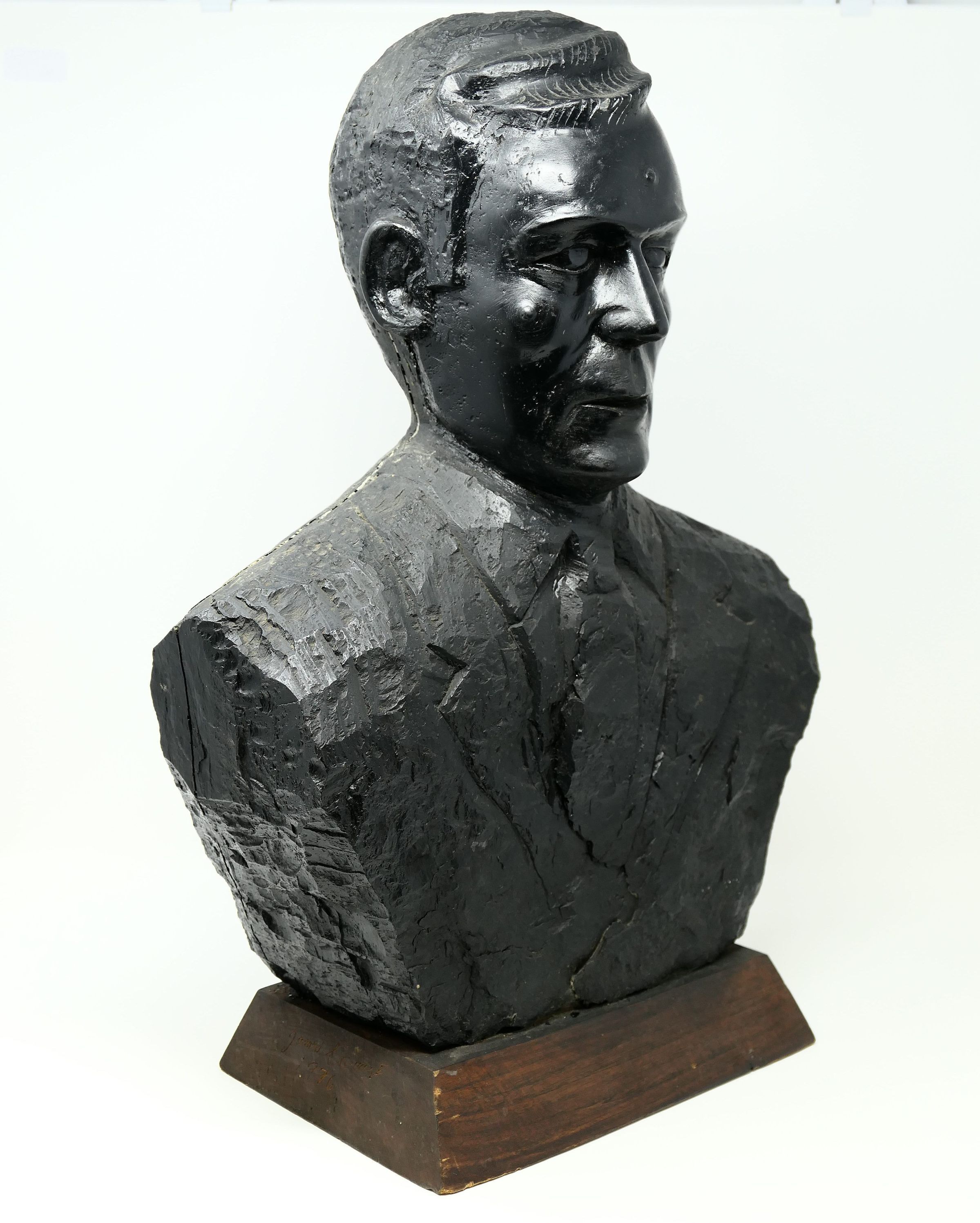 Bust of former United Mine Workers (UMWA) president Arnold Miller carved from a block of bituminous coal.