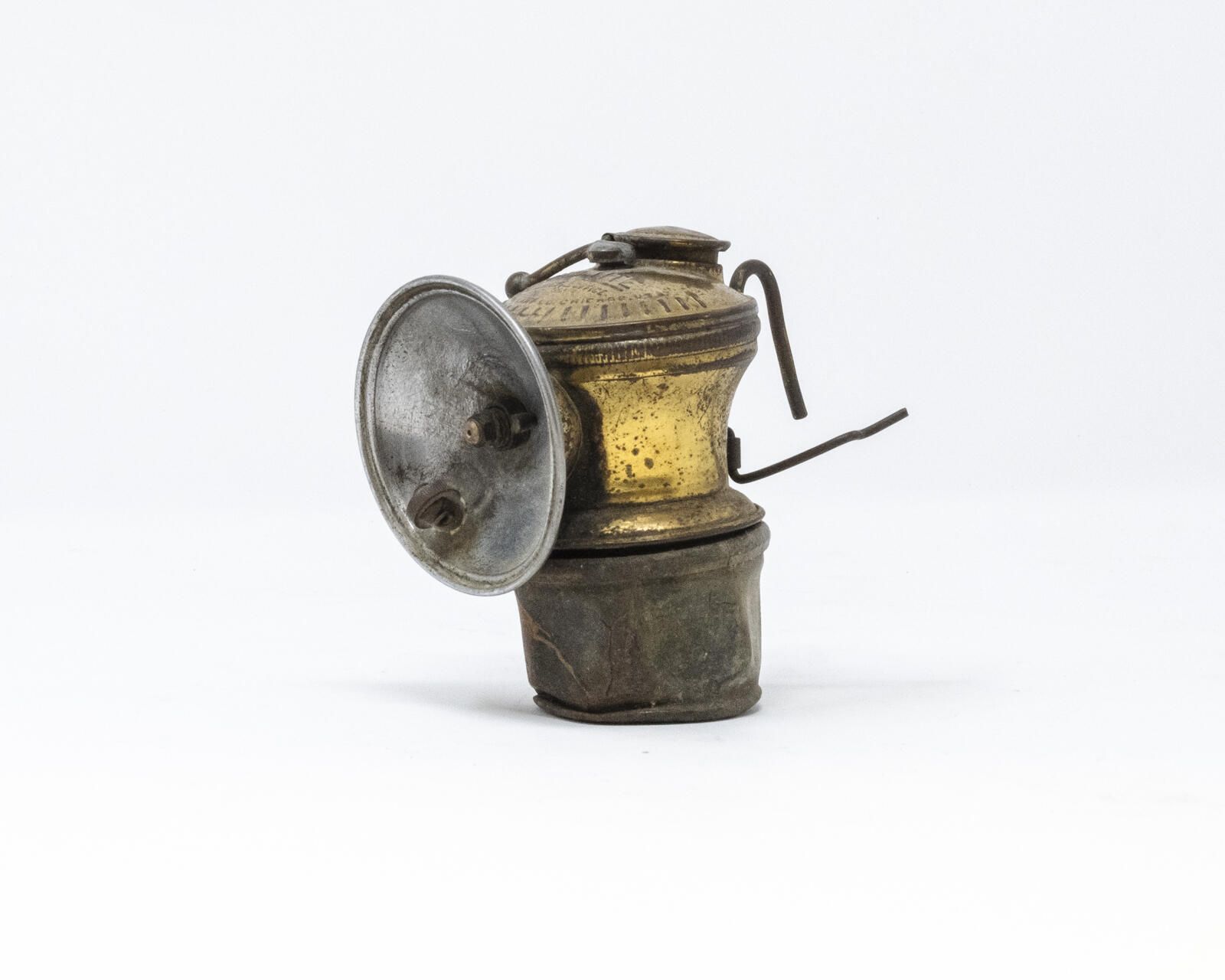 Full assembly of carbide fuel/acetylene flame miner's headlamp, including hat mounting wires.