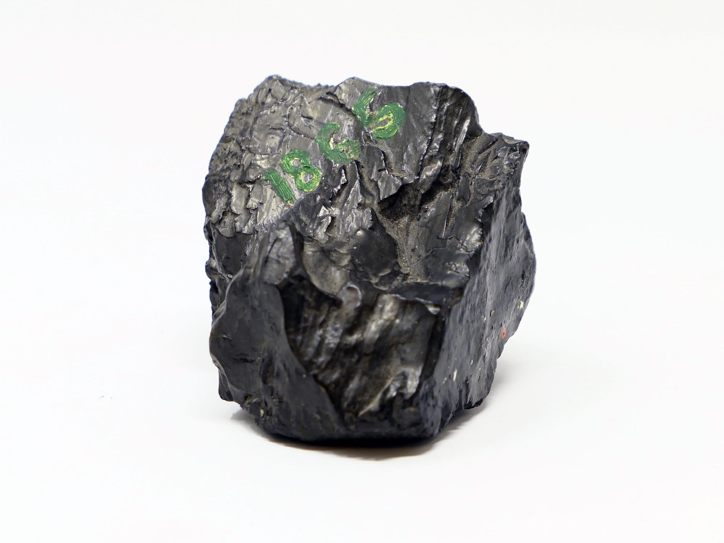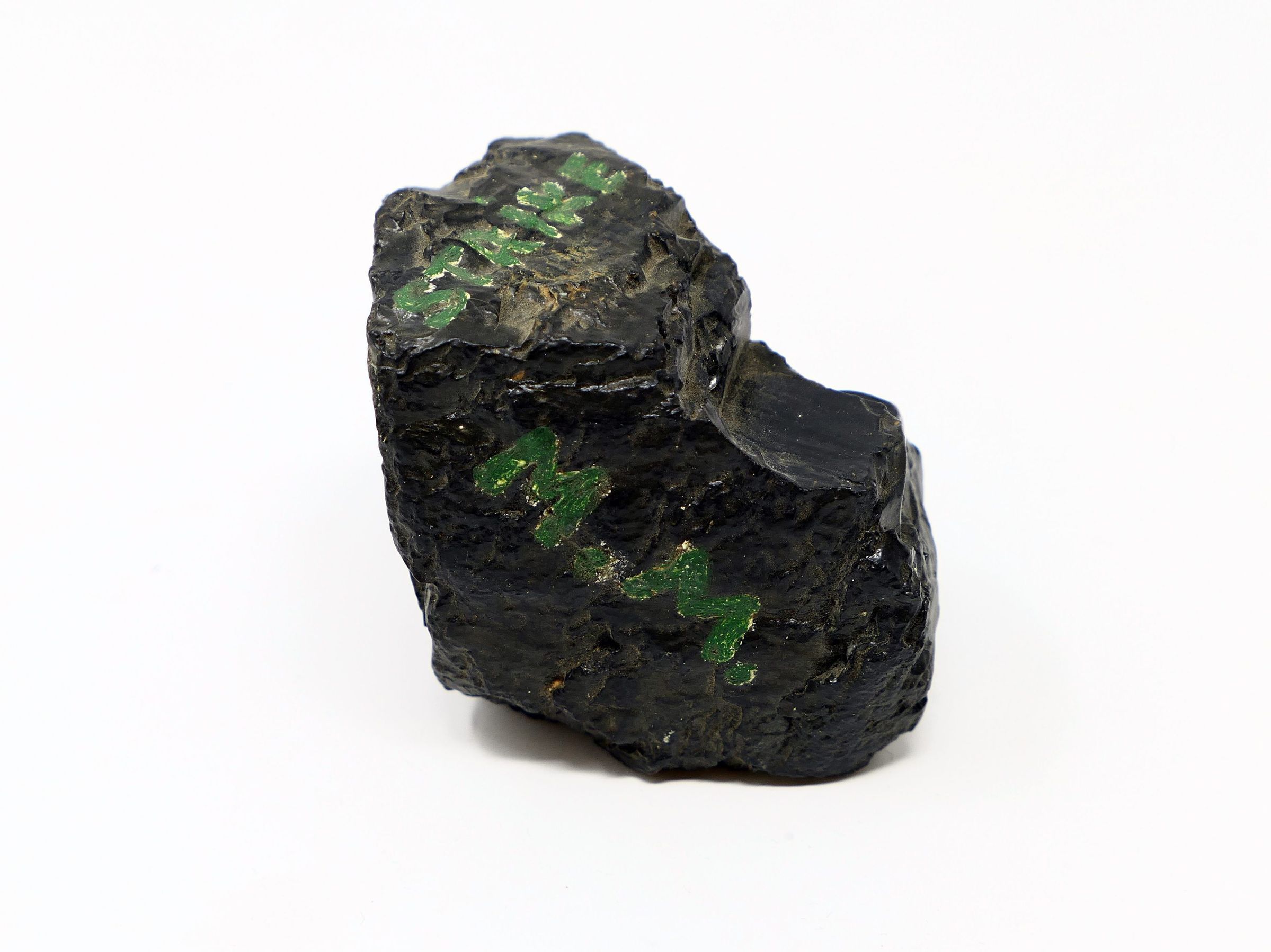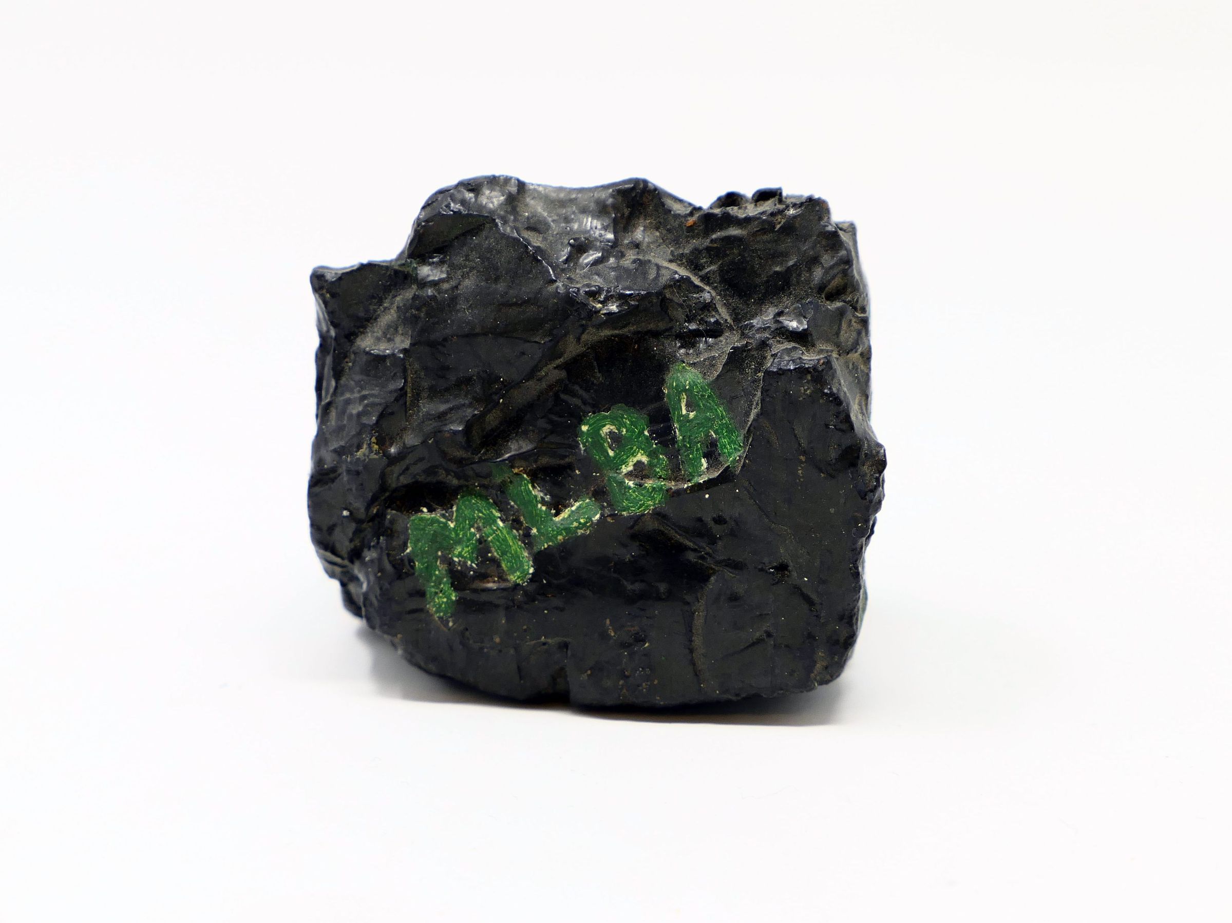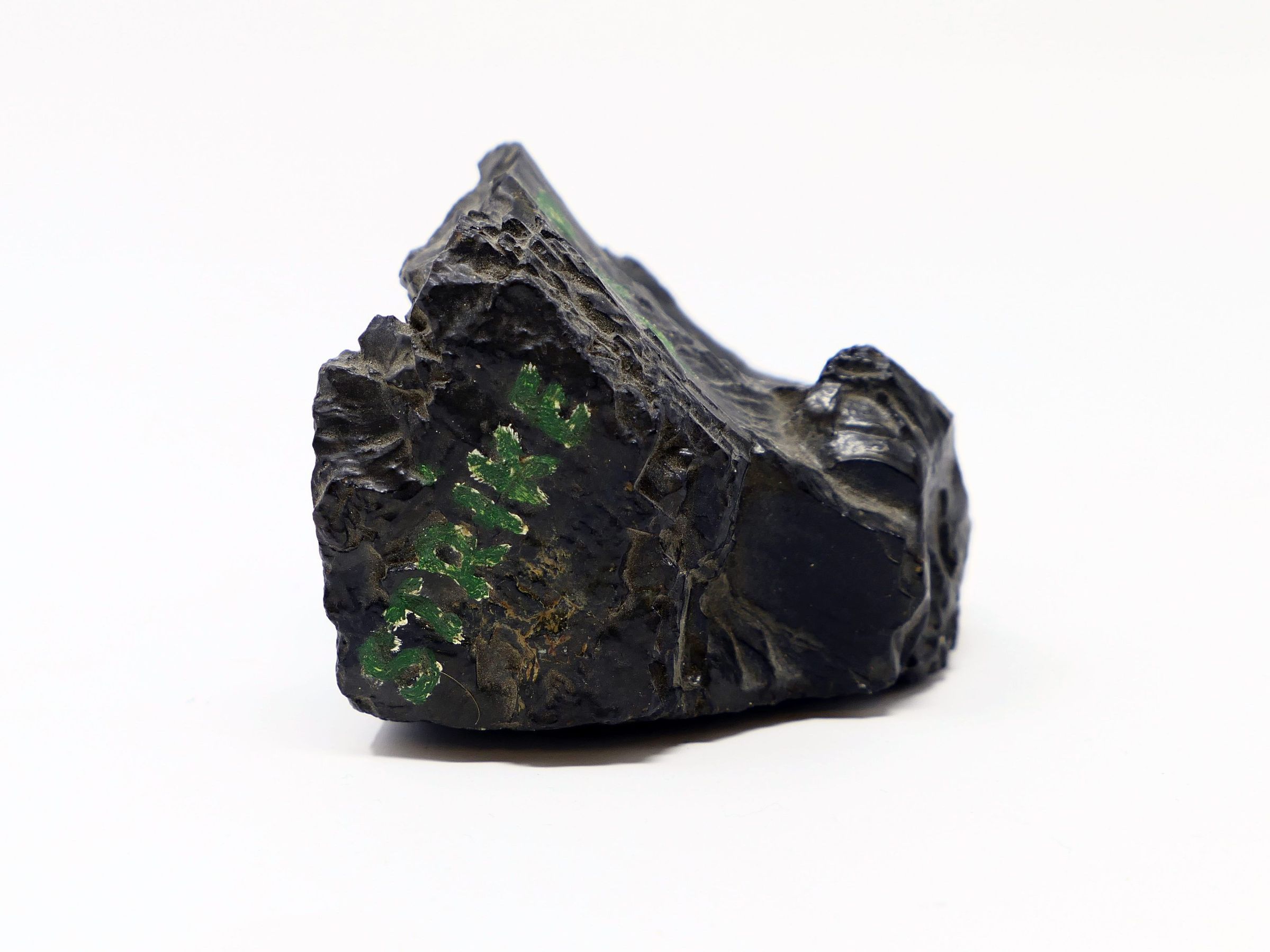 Piece of bituminous coal with several words and initialisms painted on the surface.Context
