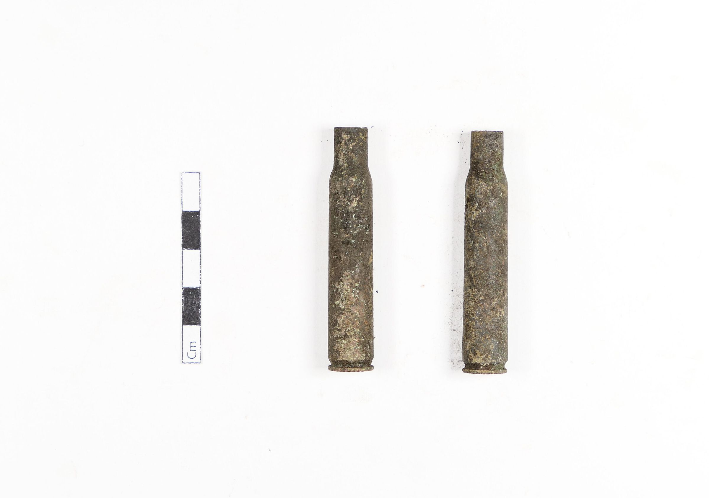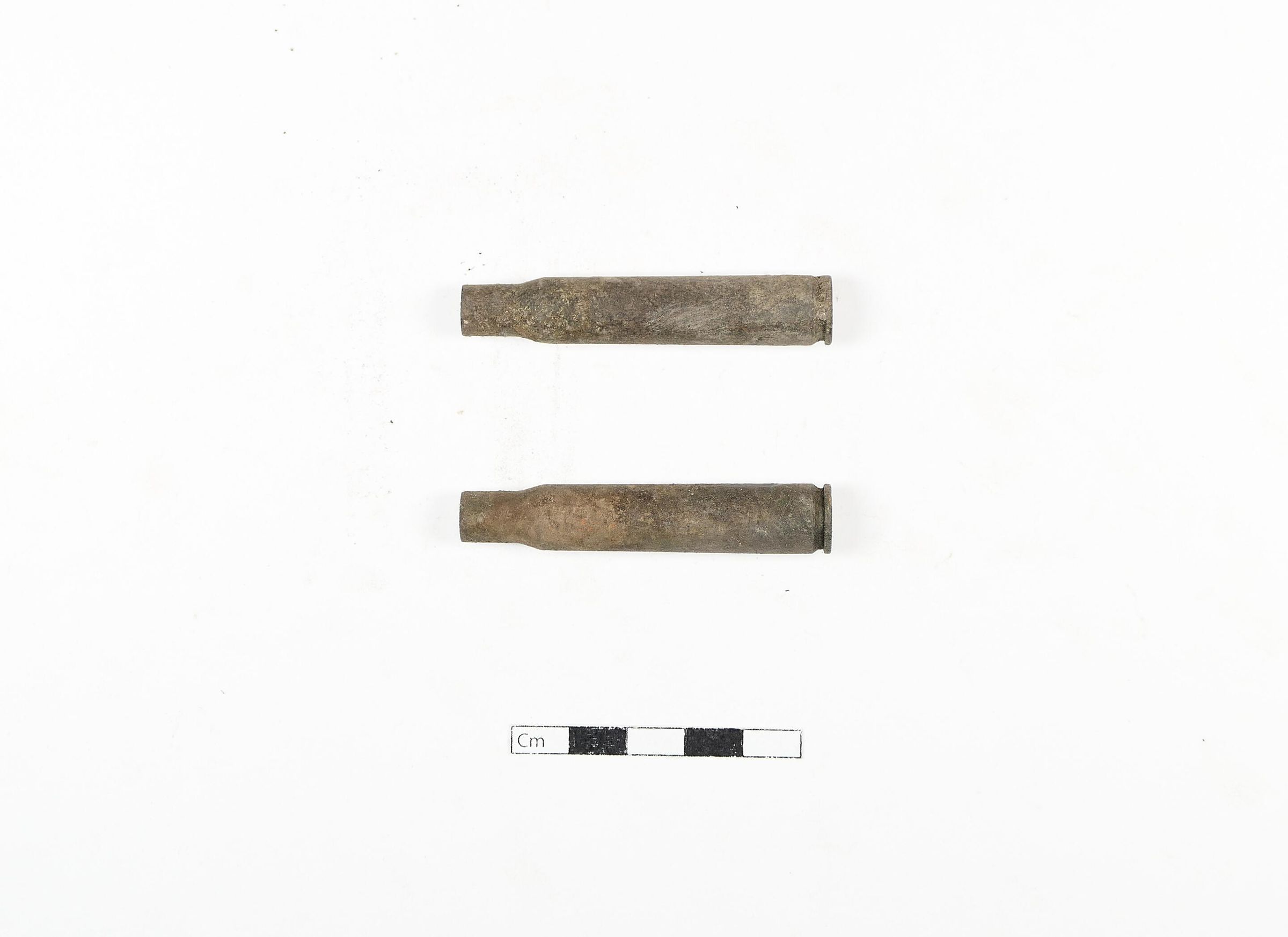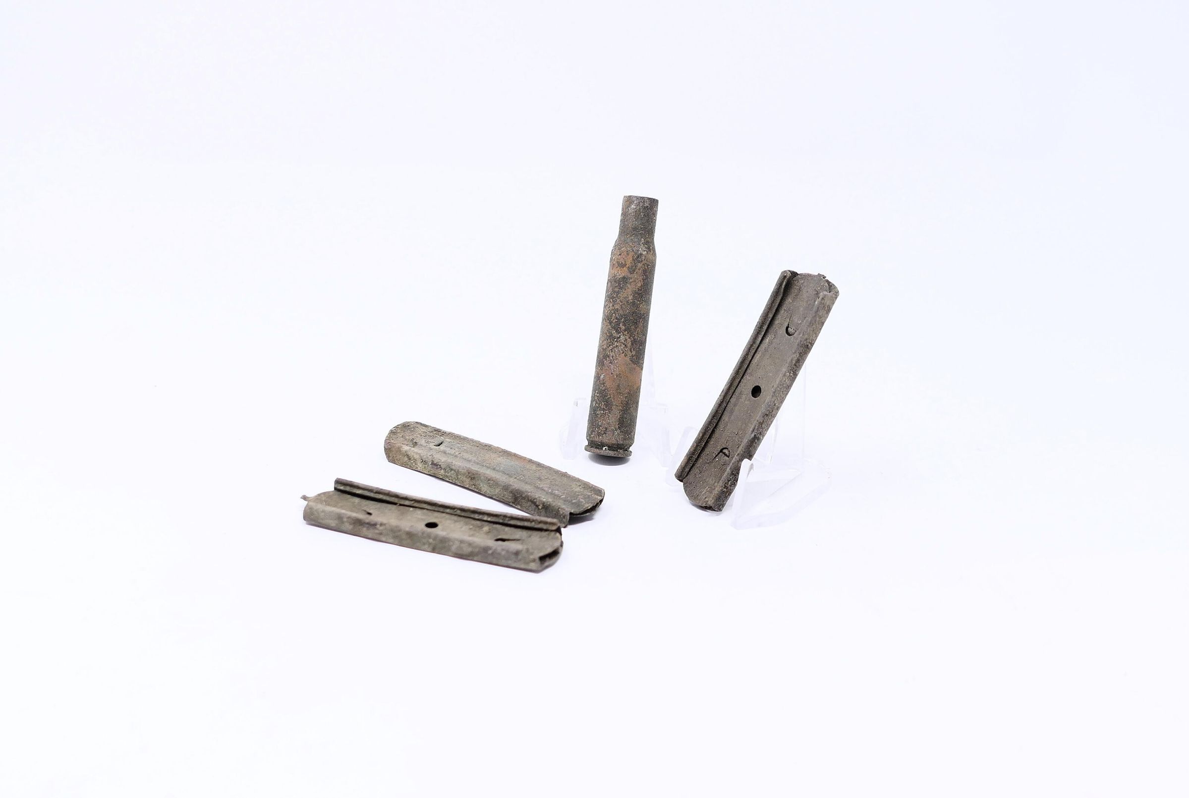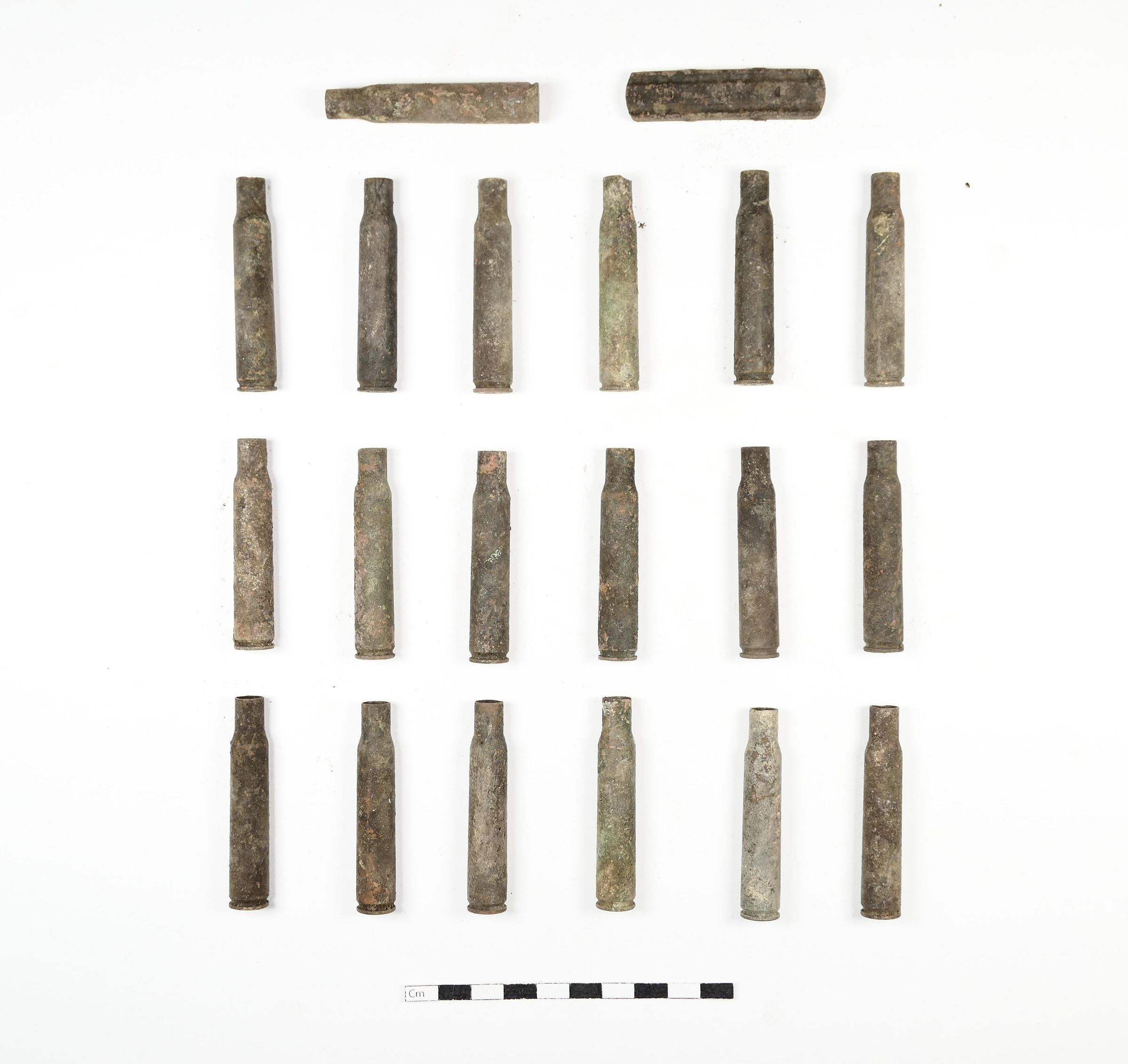 This collection is comprised of twenty-four (24) .30.06 casings, four (4) stripper clips (rifle loaders), and one unidentified bullet. There is little documentation beyond numbered items, location, and date.