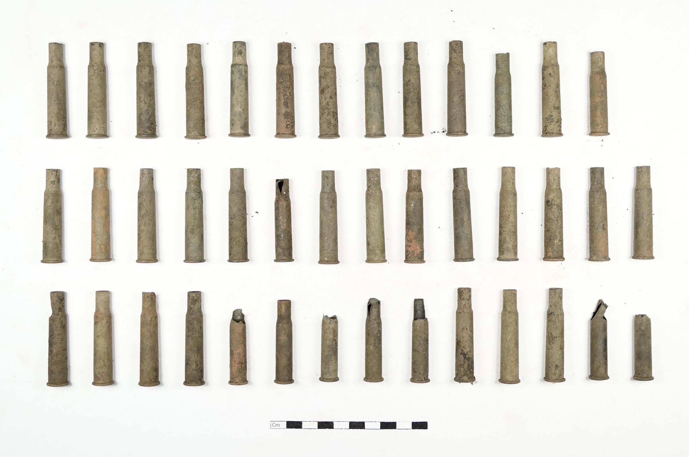 The CC1 site is the largest surveyed site on the battlefield, the entire survey uncovered 380 ammunition artifacts, with a large representation of .30 cal casings and some .45 cal casings. Marker flags are included with 7/2/06 objects. Artifacts recovered here suggest machine gun emplacements.