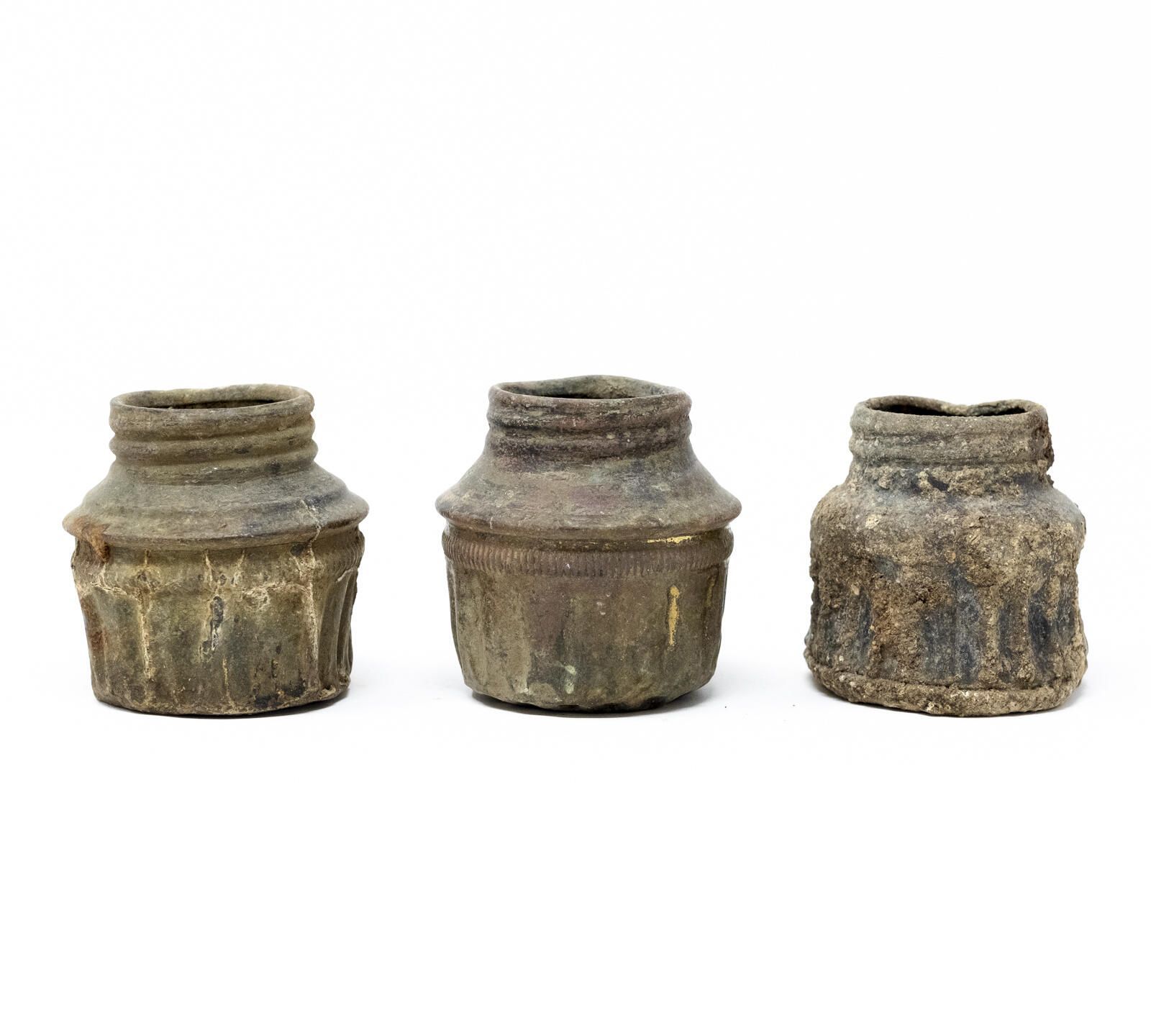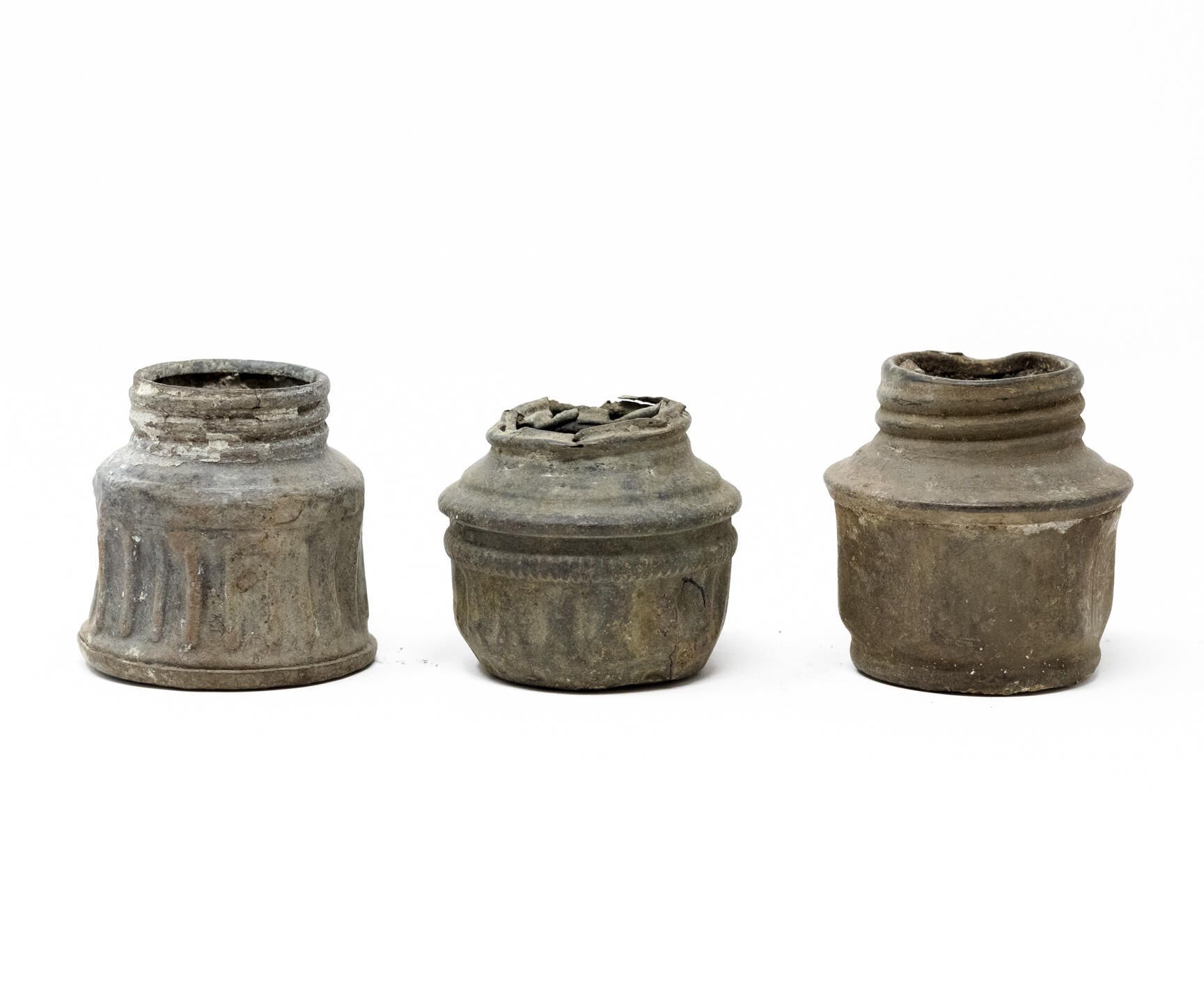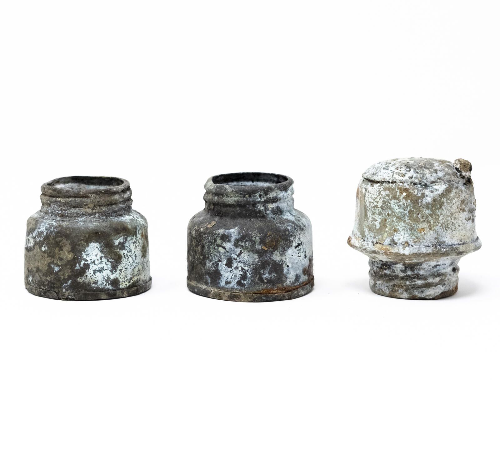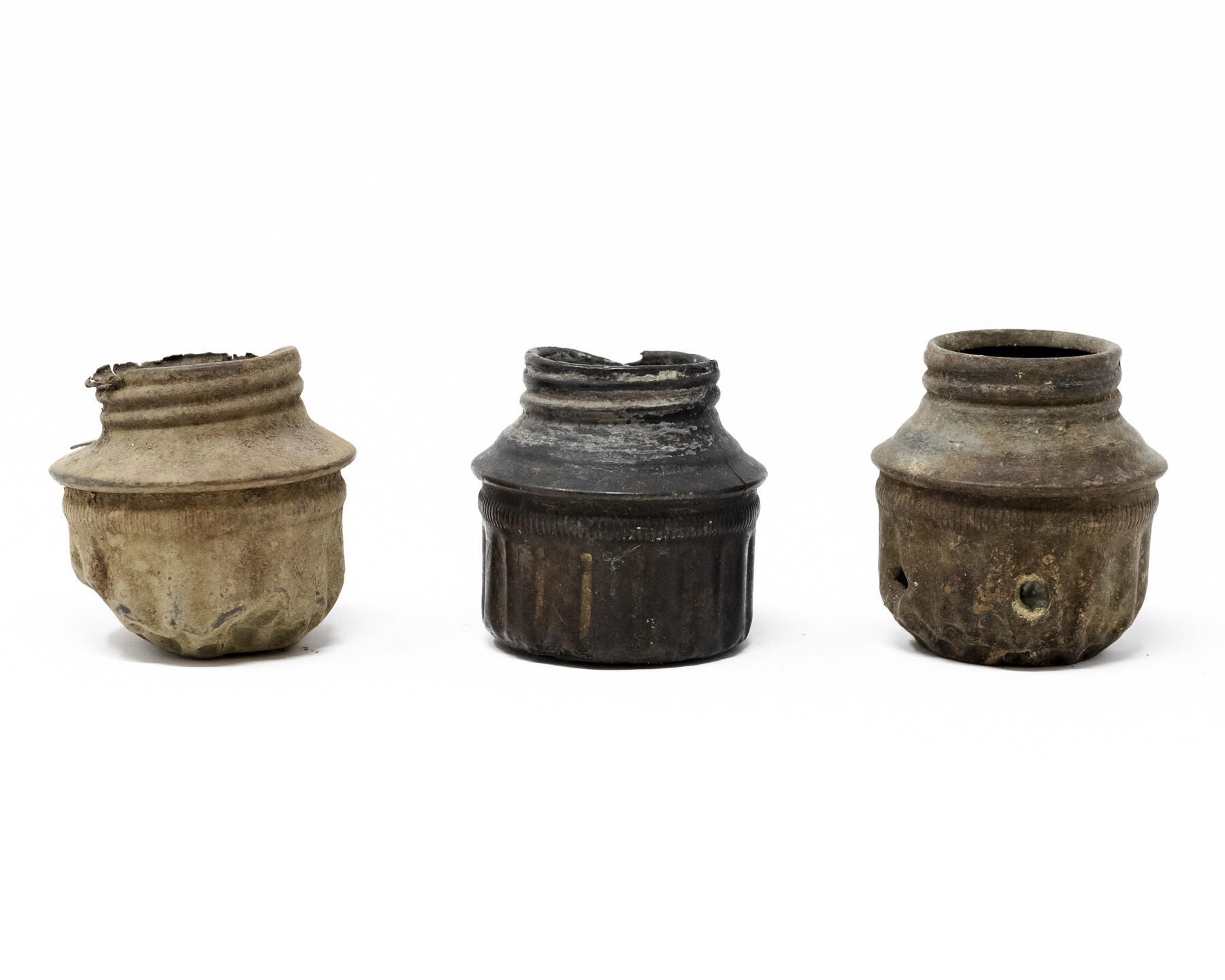 Each of these are the bottom portion of an individual acetylene headlamp, a threaded canister which held carbide granules. Water was dripped through a stem from the top of the lamp down onto the granules in this chamber, which created acetylene gas. The gas is fed through a pipe to a burner tip where it is ignited, producing a bright and steady flame.Context