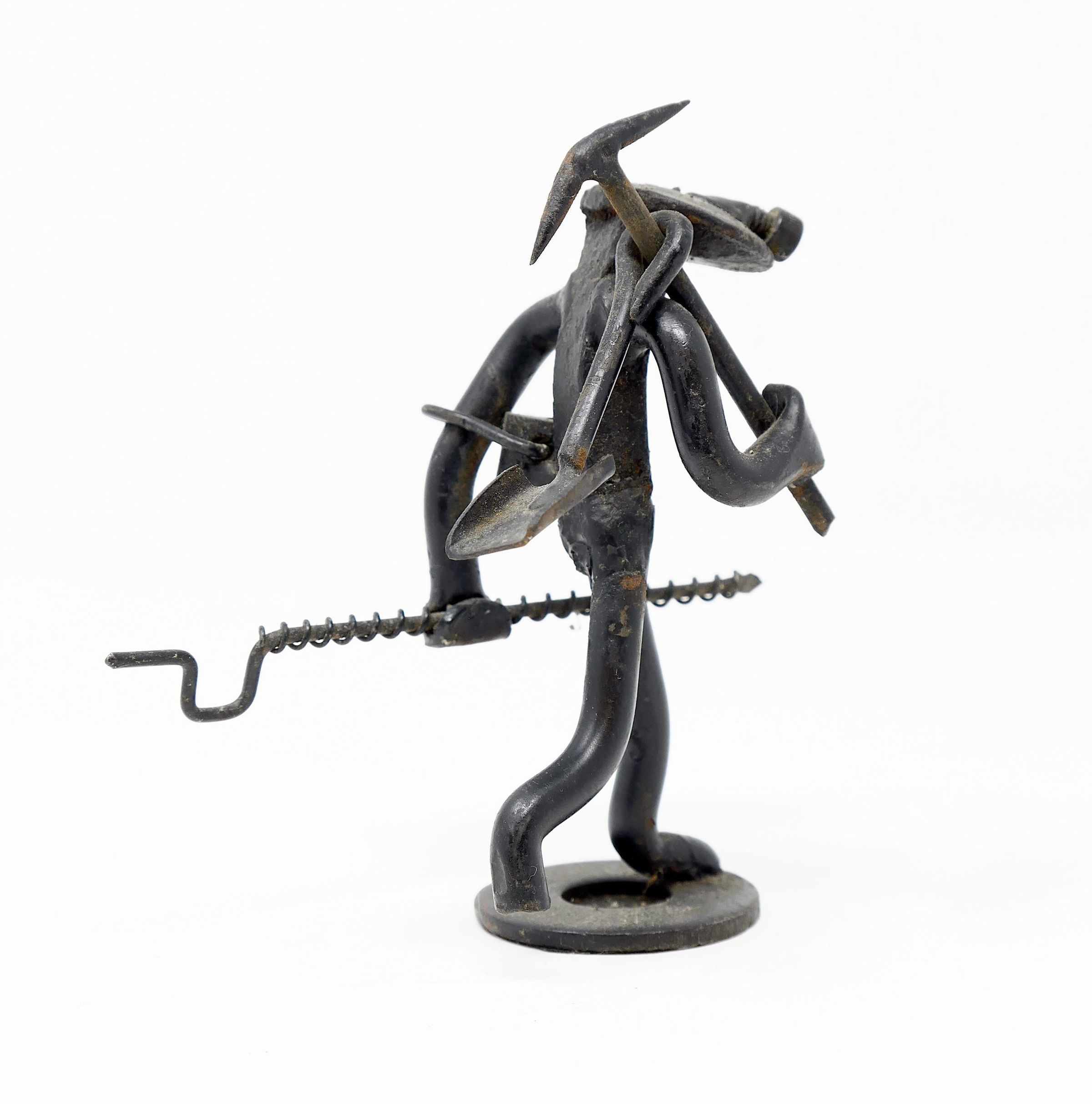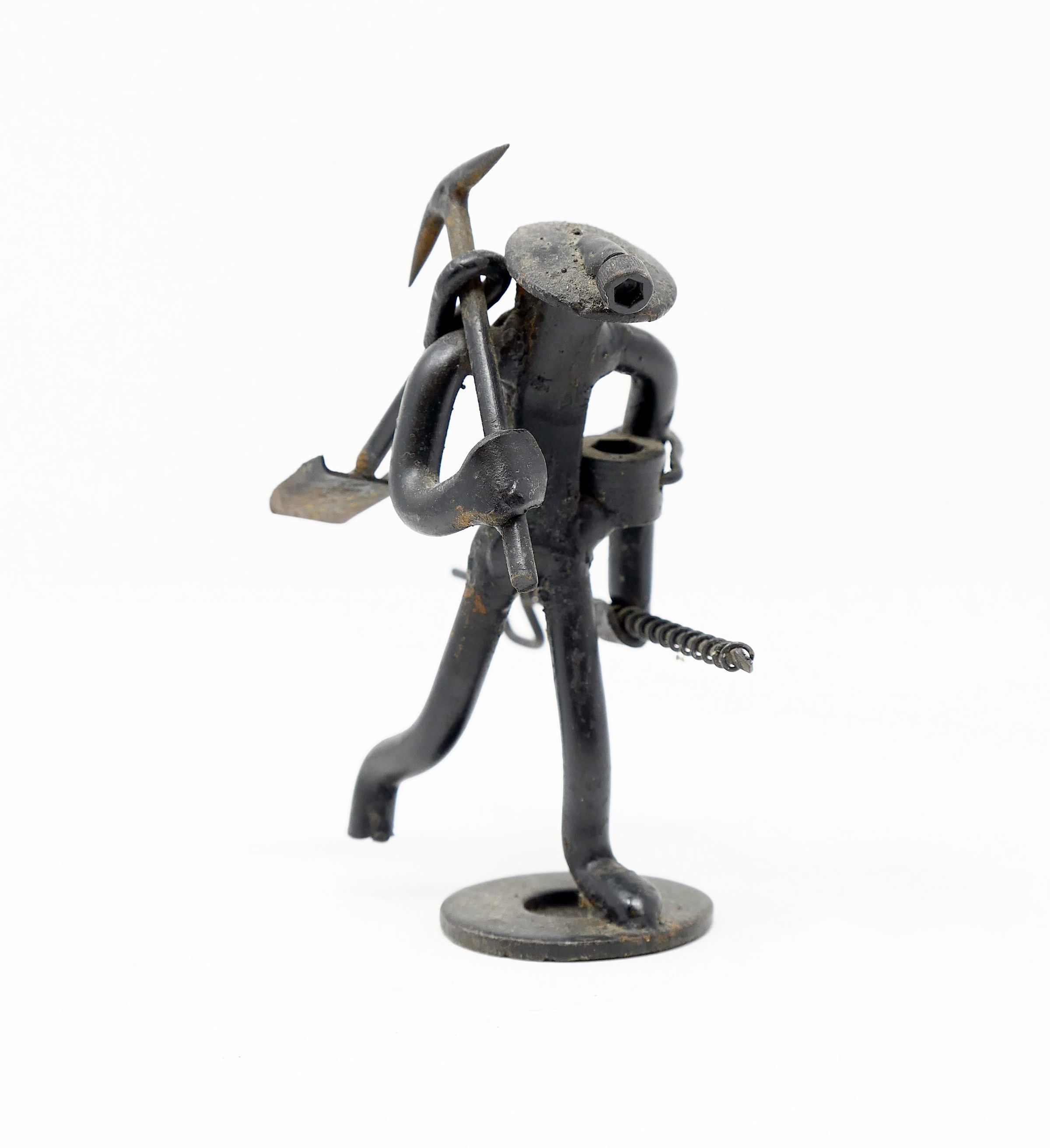 A coal miner carrying various mining hand tools, created in the "nuts & bolts" figurine style.Type of Sculpture