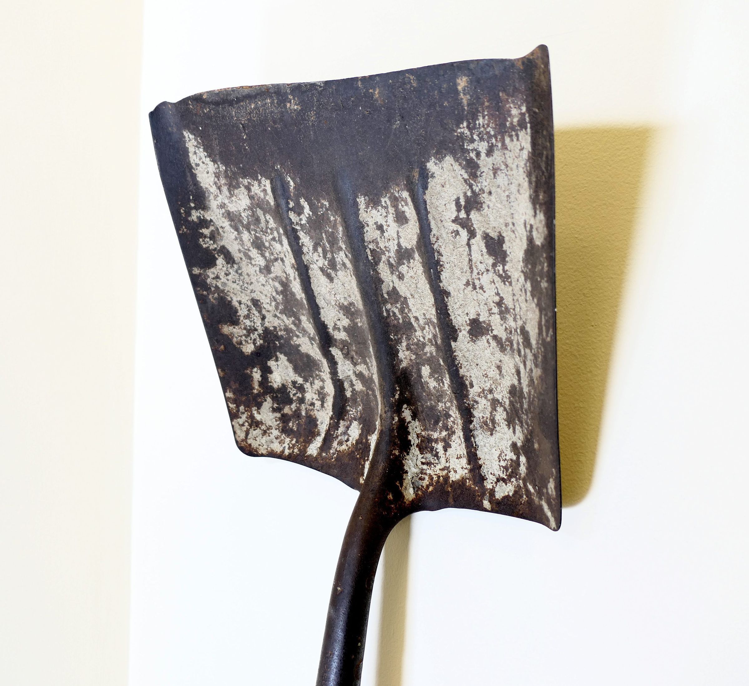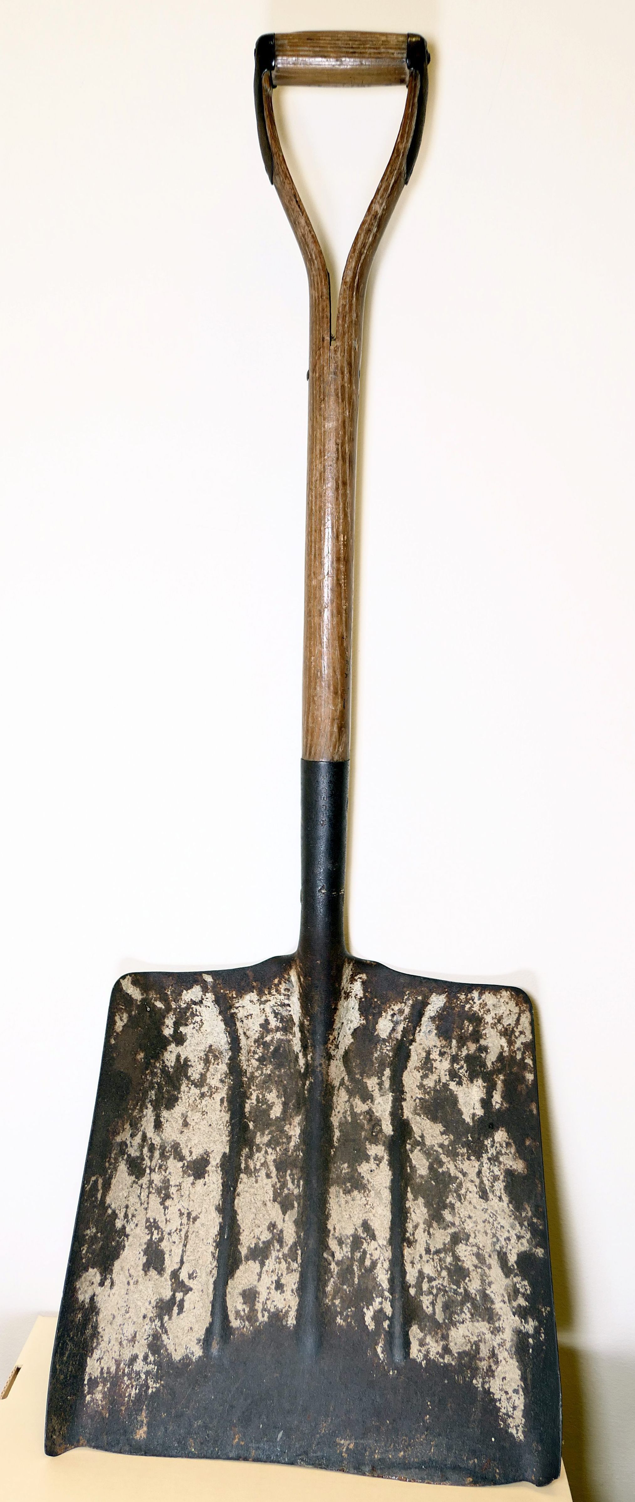 Flat shovel for moving coal. Shaft and handle are wooden, with metal reinforcement on the sides of the handle.Collection