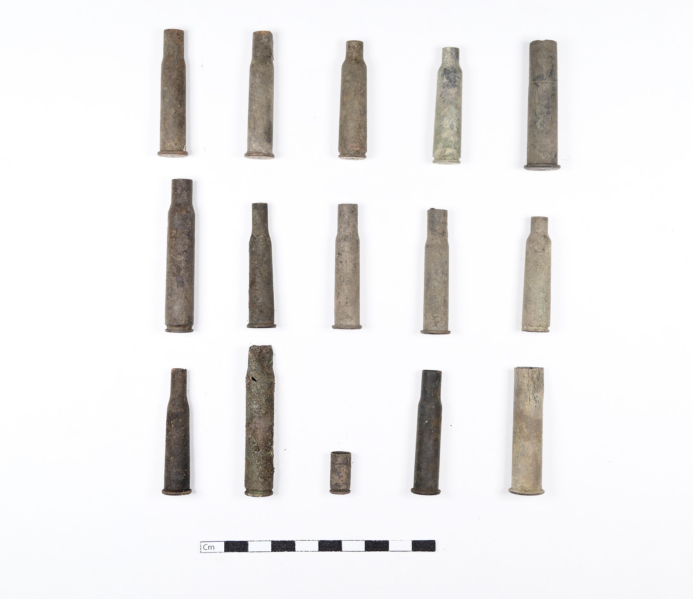 Fifteen (15) items are in this collection, from a total of 53 collected at this site. Analysis of the total collection indicates a range of calibers that suggests a long-range fire position was established here as a defensive site.