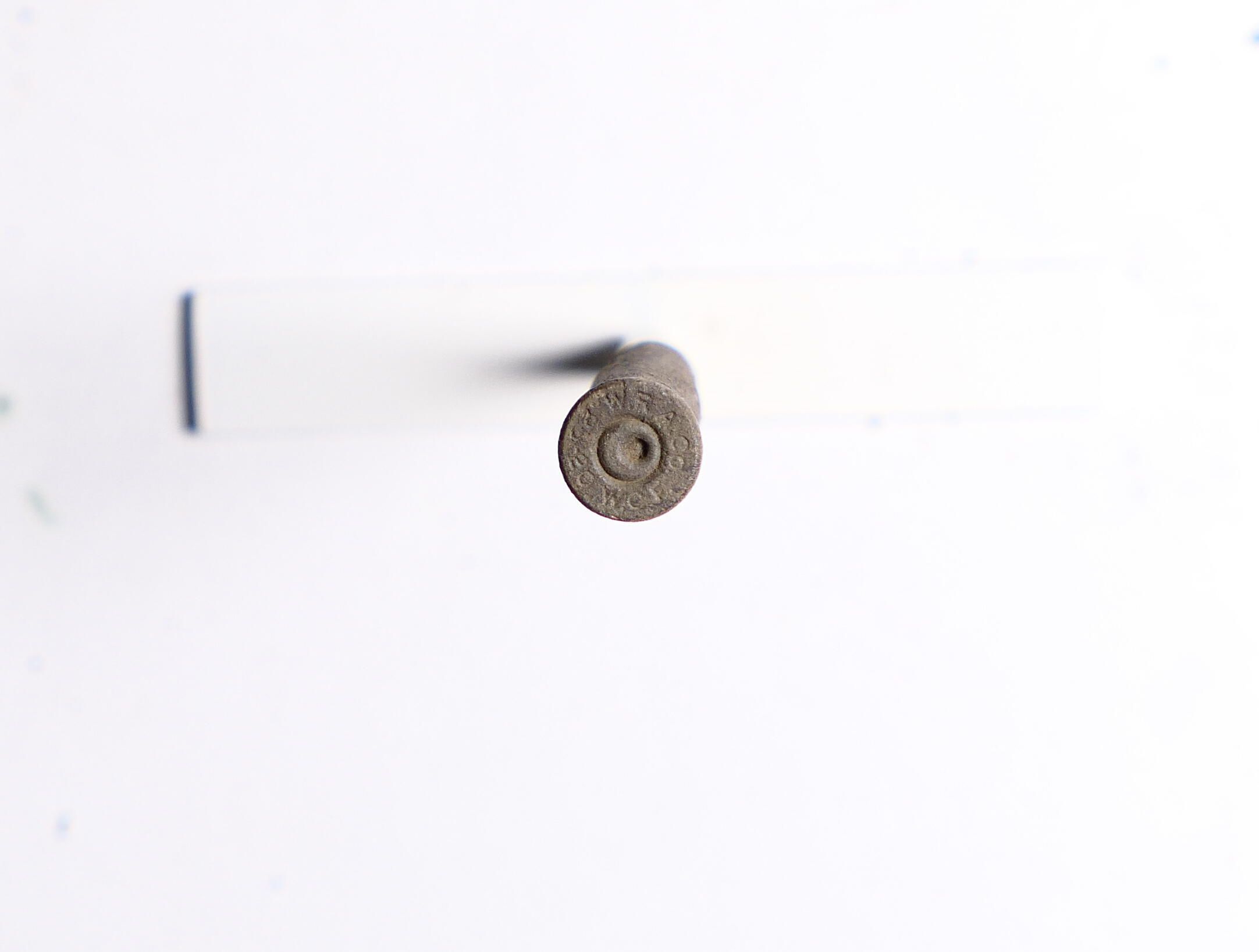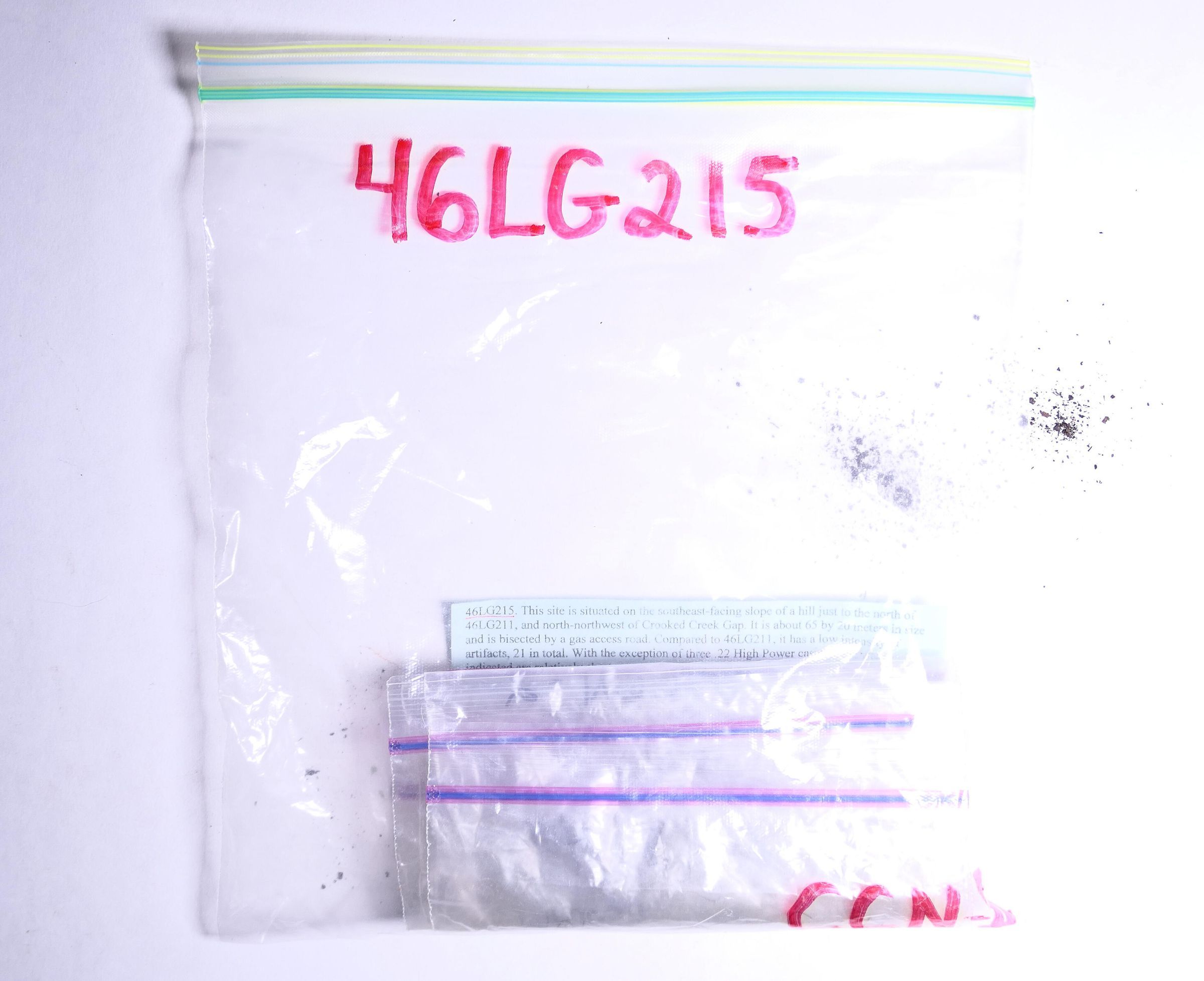 "This site is situated on the southeast-facing slope of a hill just to the north of 46LG211, and north-northwest of Crooked Creek Gap. It is about 65 by 25 meters in size and is bisected by a gas access road. Compared to 46LG211, it has a low intensity of artifacts, 21 in total. With the exception of the three .22 High Power casings, the weapons indicated are relatively short range. A total of three spent bullets indicates incoming shells, a relatively high percentage of the total artifacts. As mentioned above, this site faces the same Craddock Fork tributary as several other sites including 46LG211."