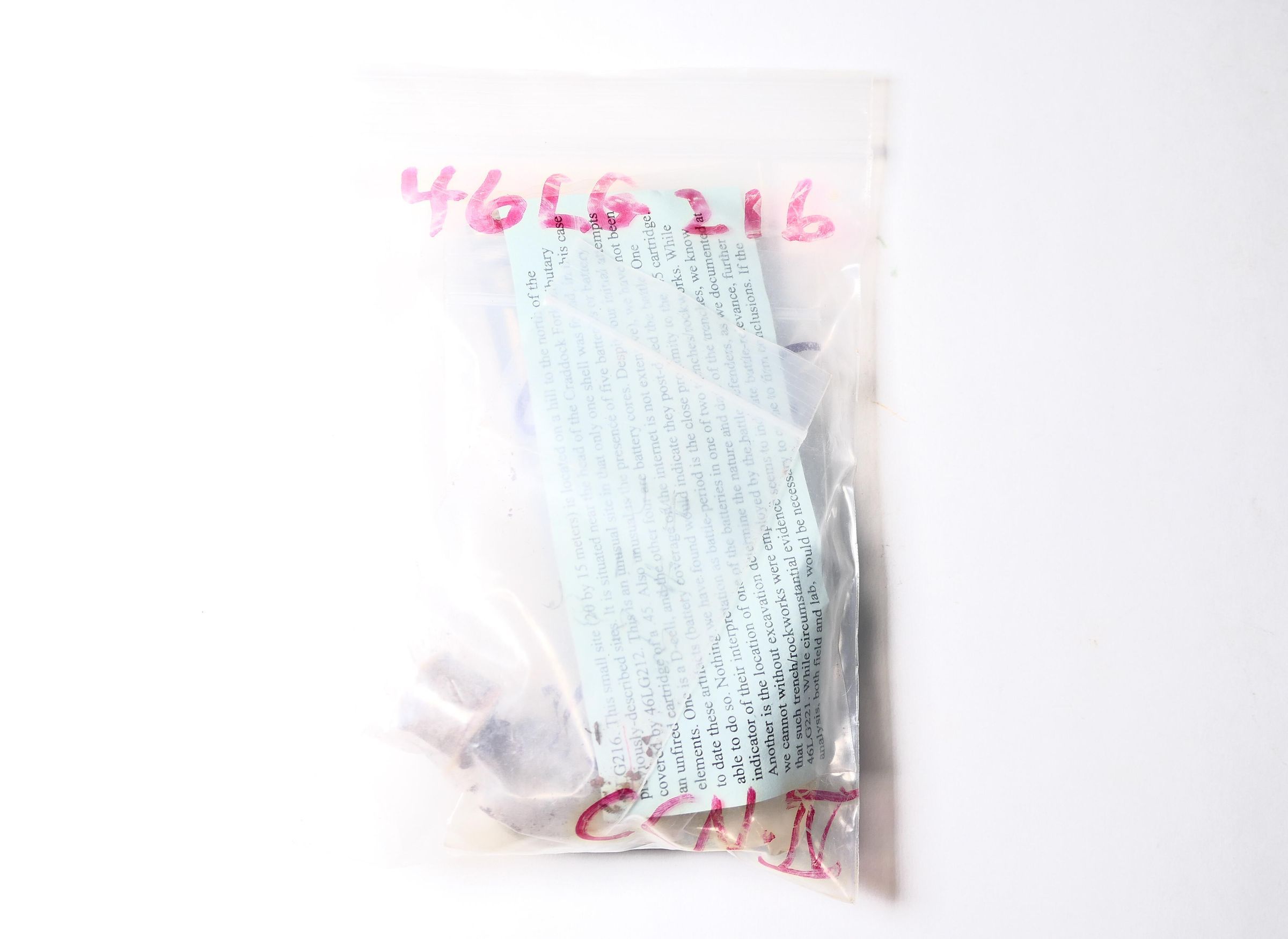 "This small site (20 by 15 meters) is located on a hill to the north of the previously-described sites. It is situated near the head of the Craddock Fork tributary covered by 46LG212. This is an unusual site in that only one shell was found, in this case an unfired cartridge of a .45. Also unusual is the presence of five batteries or battery elements. One is a D-cell, and the other four are battery cores. Despite our initial attempts to date these artifacts (battery coverage on the internet is not extensive), we have not been able to do so. Nothing we have found would indicate they post-dated the battle. One indicator of their interpretation as battle-period is the close proximity to the .45 cartridge. Another is the location of one of the batteries in one of the two trenches/rockworks. While we cannot without excavation determine the nature and date of the trenches, we know that such trench/rockworks were employed by the battle defenders, as we documented at 46LG221. While circumstantial evidence seems to indicate battle-relevance, further analysis, both field and lab, would be necessary to come to firm conclusions. If the" [text stops]