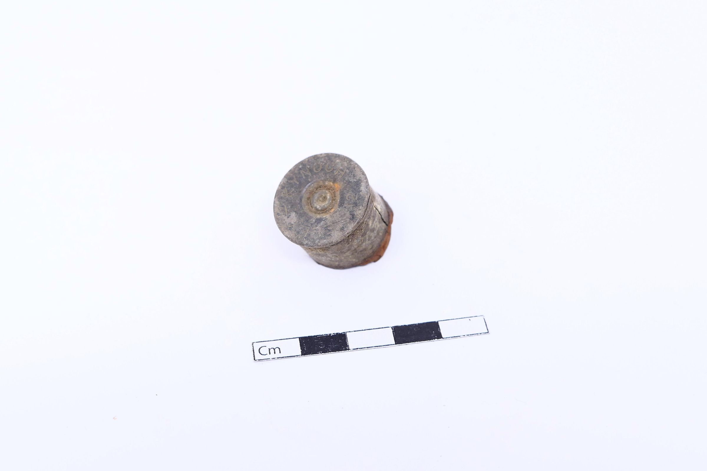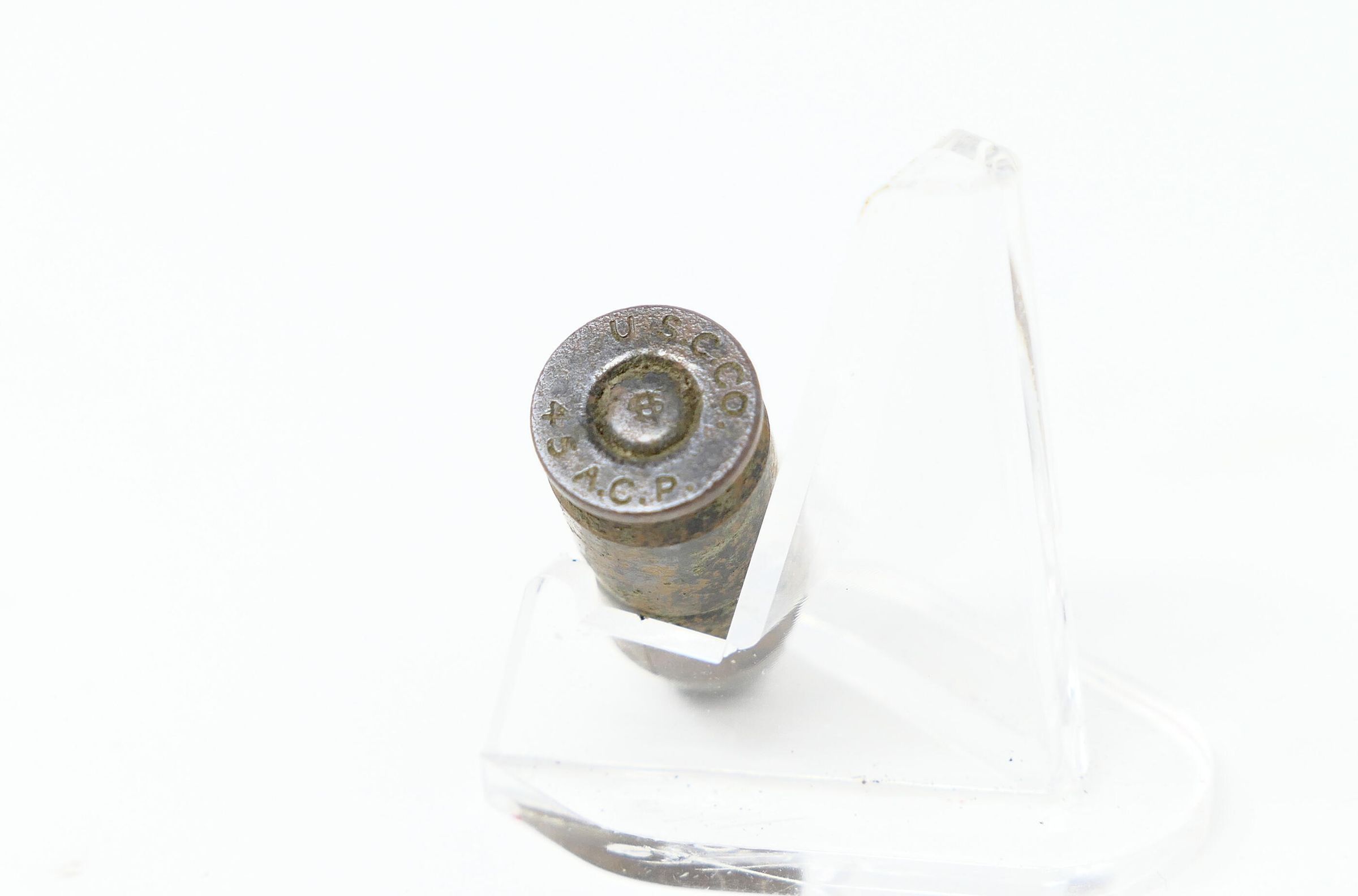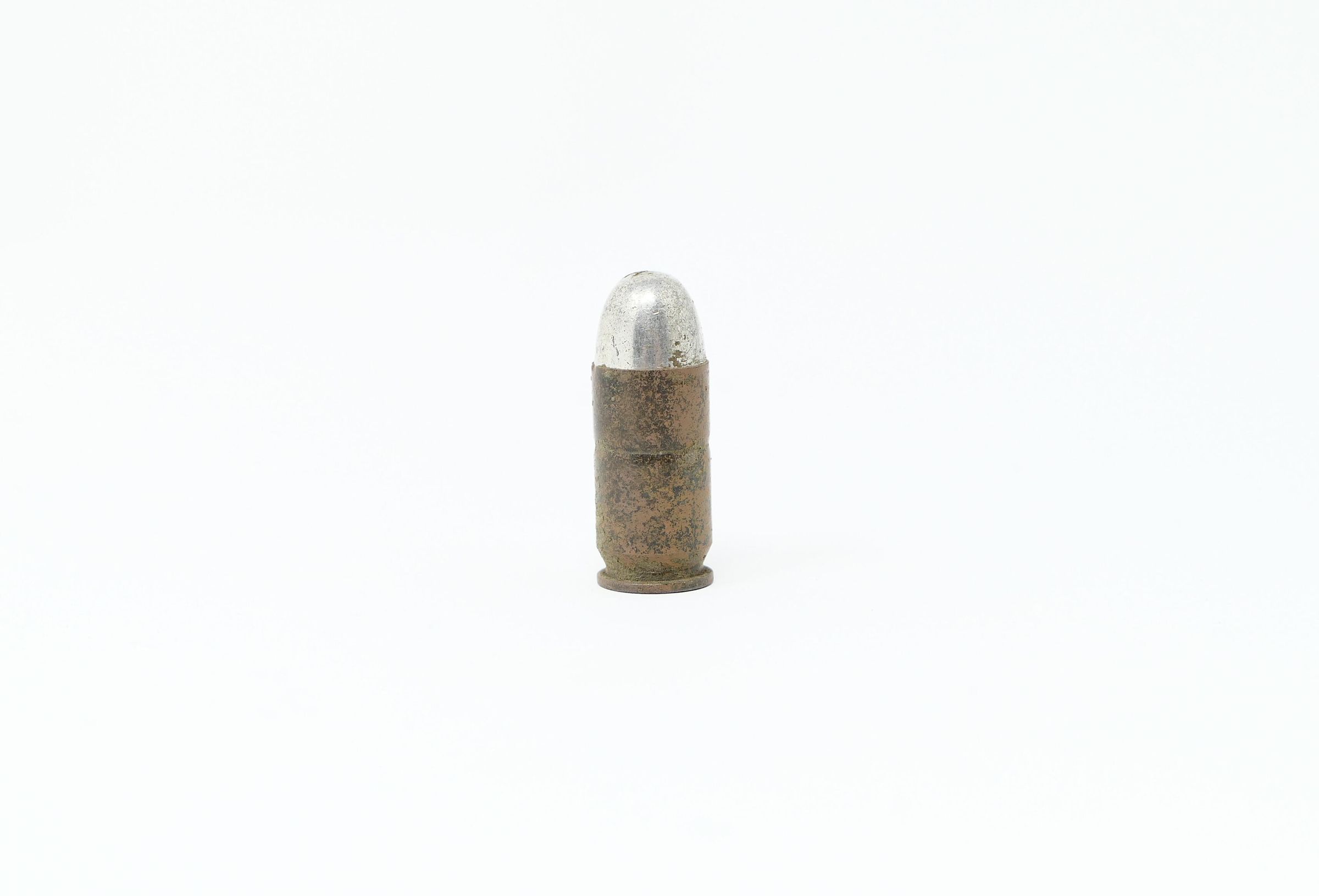 Five (5) items in this collection. One shotgun brass head, and one .45 ACP cartridge. There is also one D- or C-cell battery and a washer, which are consistent with early flashlight batteries of the era. There is also a long, black piece that is most likely the graphite core for a larger dry cell battery (or "igniter") consistent with a type, like the Columbia No.6, used for early field telephones and radios.
