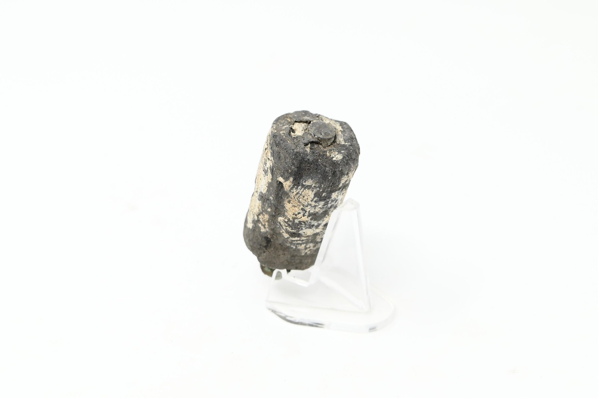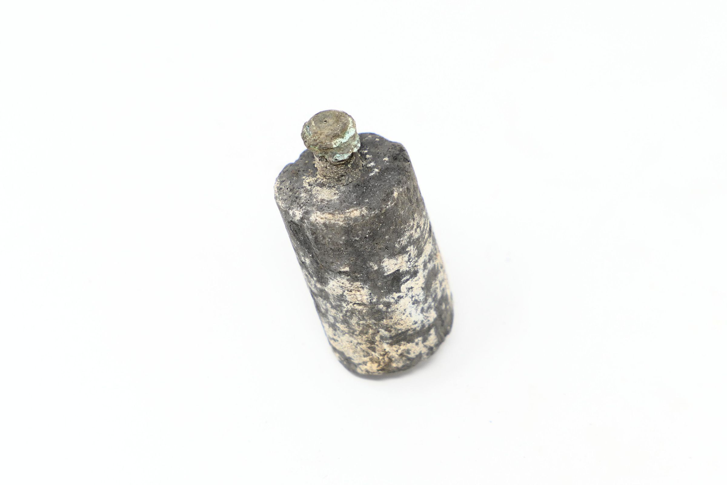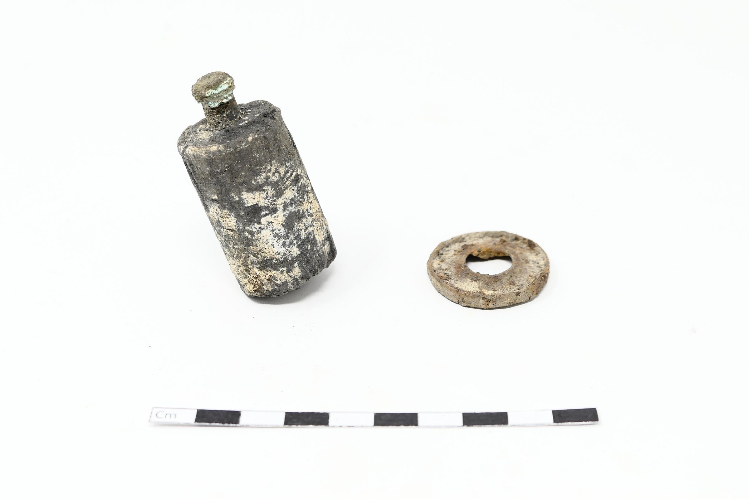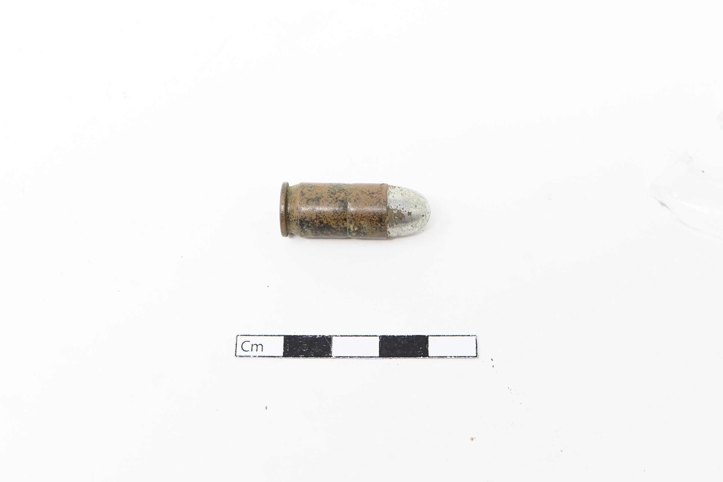 Five (5) items in this collection. One shotgun brass head, and one .45 ACP cartridge. There is also one D- or C-cell battery and a washer, which are consistent with early flashlight batteries of the era. There is also a long, black piece that is most likely the graphite core for a larger dry cell battery (or "igniter") consistent with a type, like the Columbia No.6, used for early field telephones and radios.