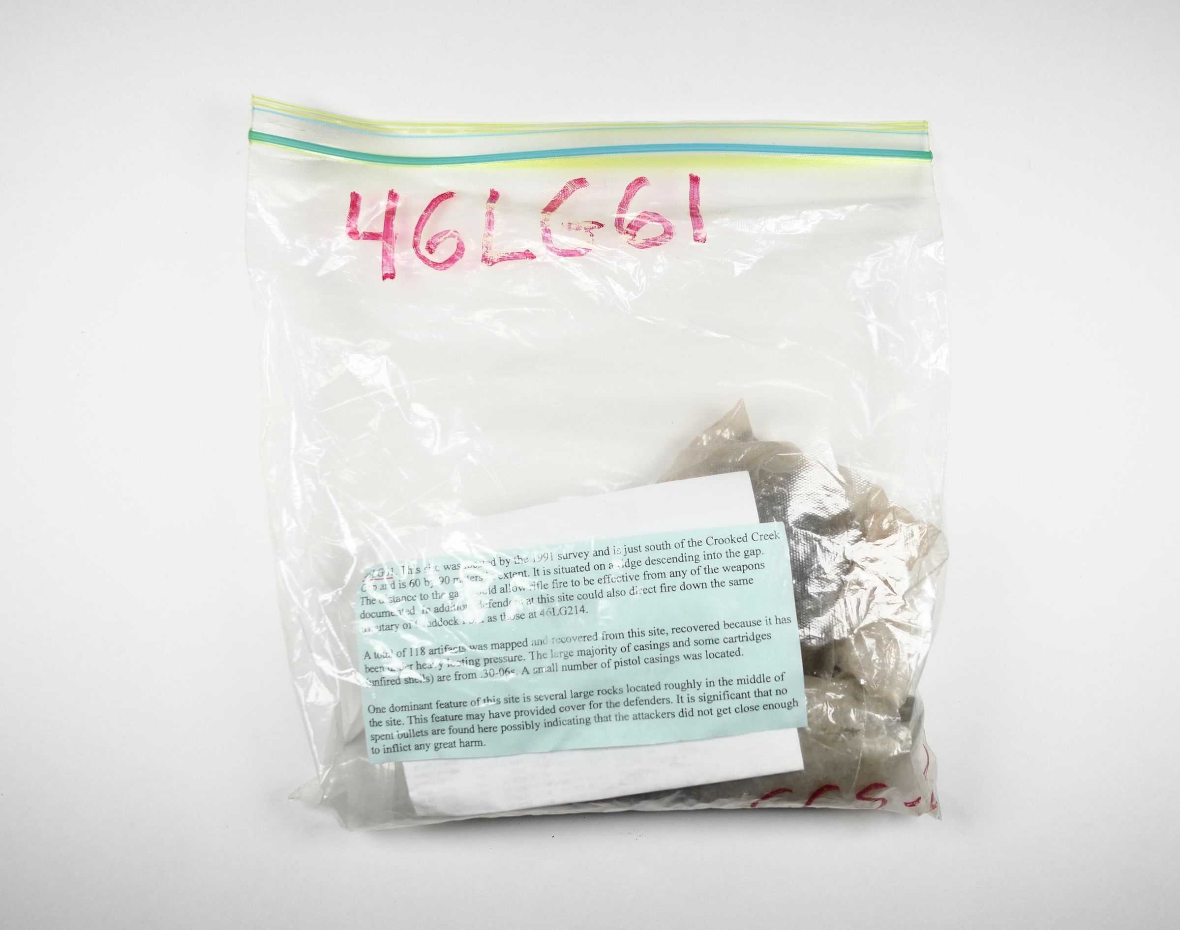 "This site was located by the 1991 survey (WVU) and is just south of the Crooked Creek Gap and is 60 by 90 meters in extent. It is situated on a ridge descending into the gap. The distance to the gap would allow rifle fire to be effective from any of the weapons documented. In addition, defenders at this site could also direct fire down the same tributary of Craddock Fork as those at 46LG214.