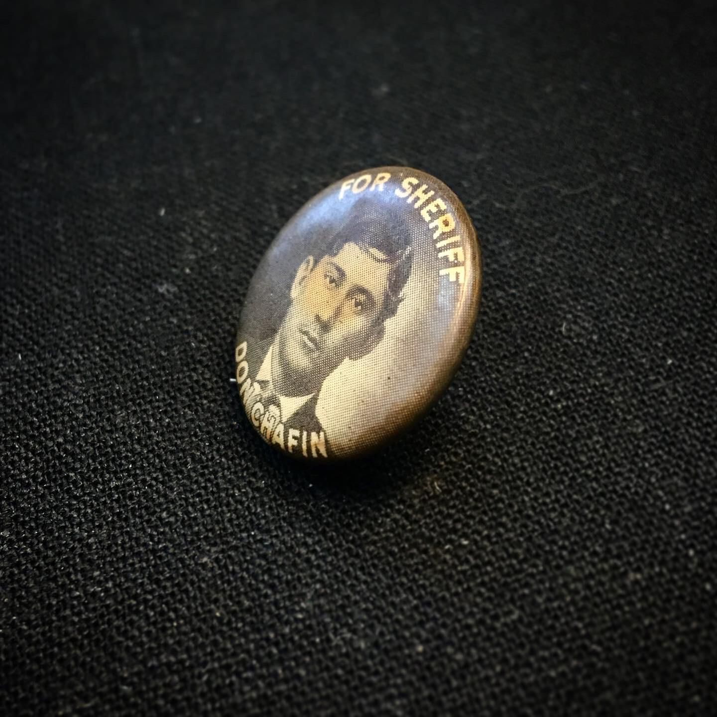 Laminated pin with sharp pin back, photo of Don Chafin, from one of his campaigns for election to Sheriff of Logan County, West Virginia.Context