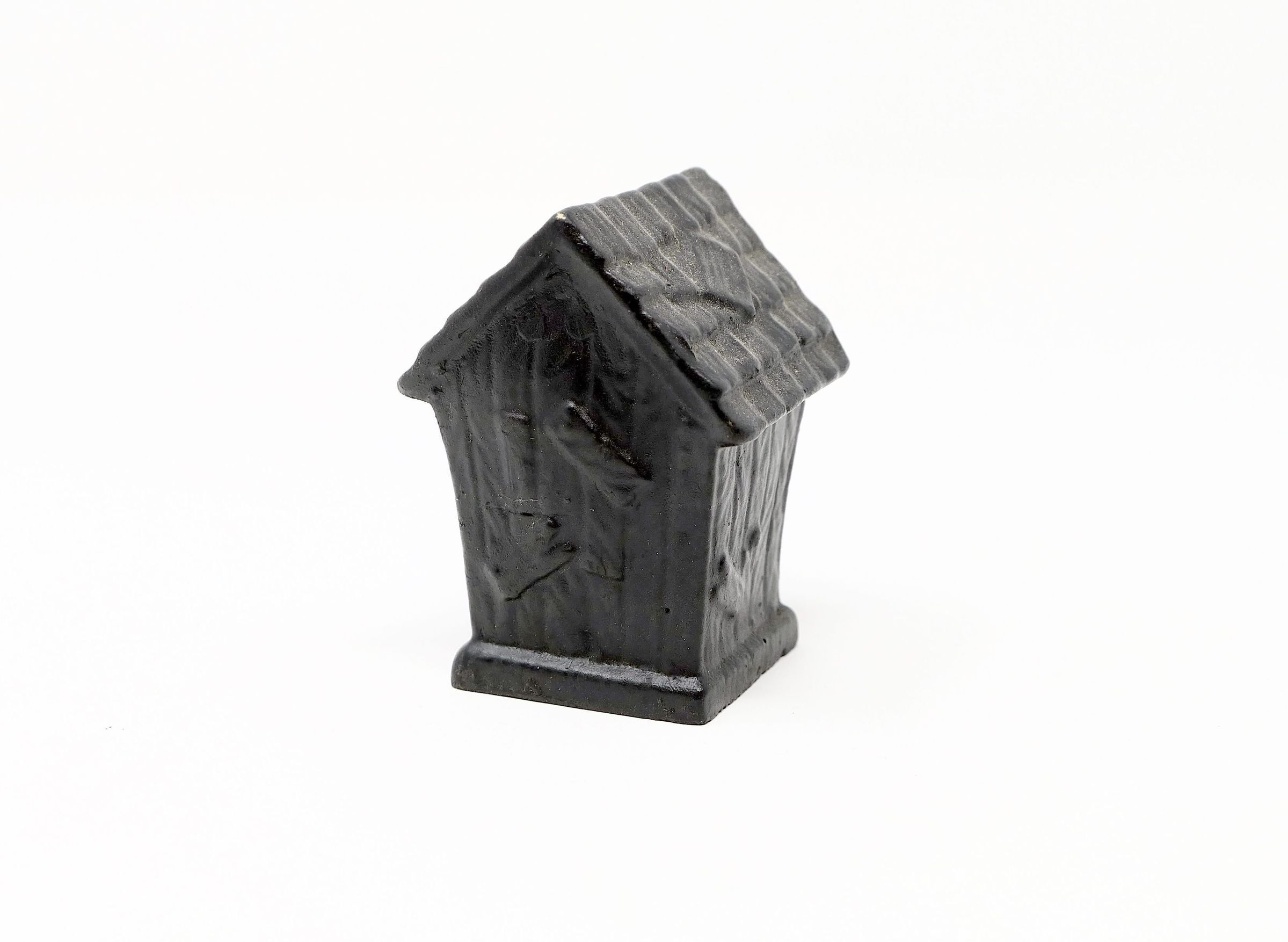 Small cast sculpture of an outhouse, one "googly" eye has been glued on.Type of Sculpture