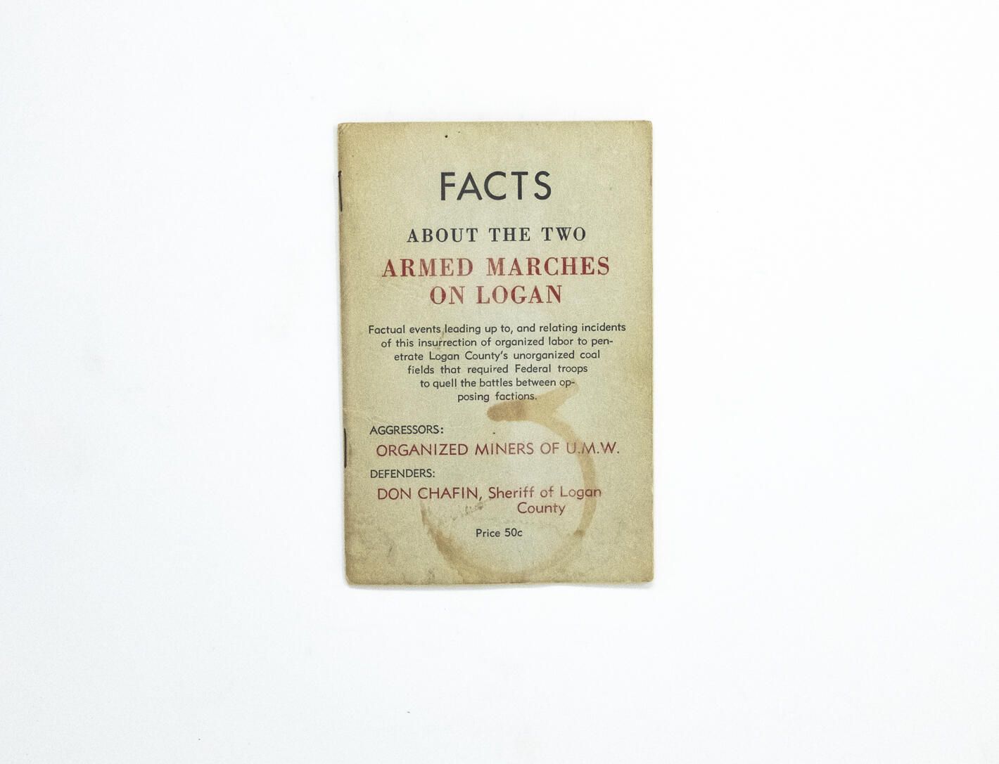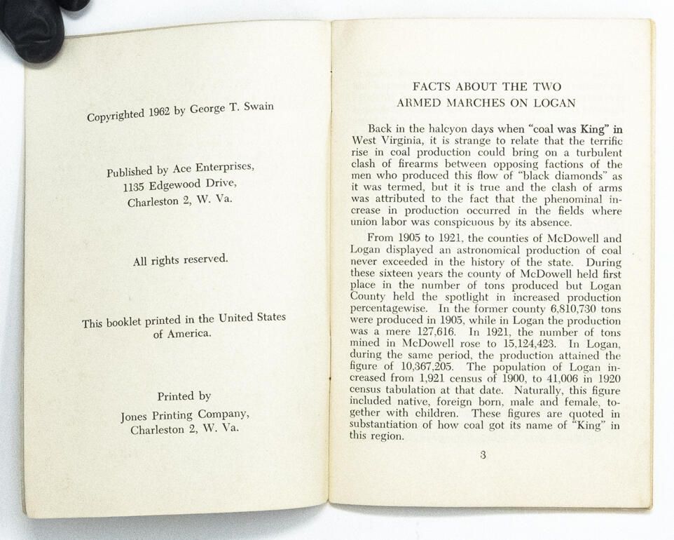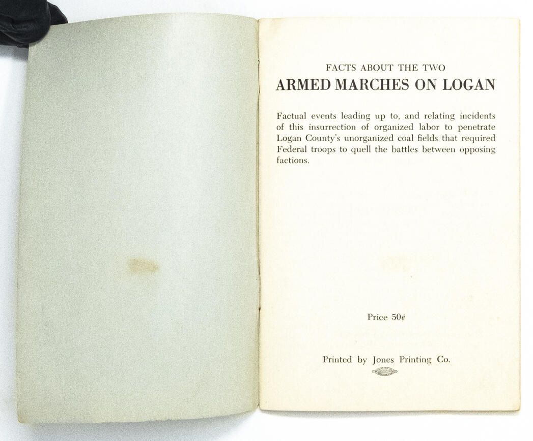 History pamphlet summarizing the events leading up to, and during, the Battle of Blair Mountain from a perspective of fealty to Don Chafin and dismissive of the union and mining labor conditions.Context