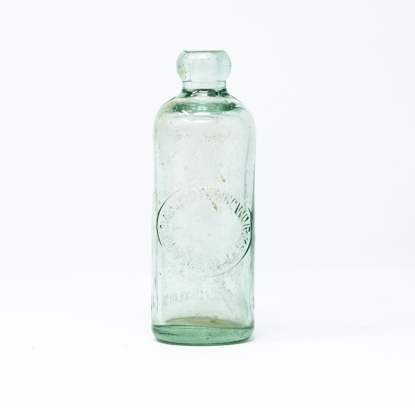 Hand-blown "Hutchinson" style, blob-top soda bottle.