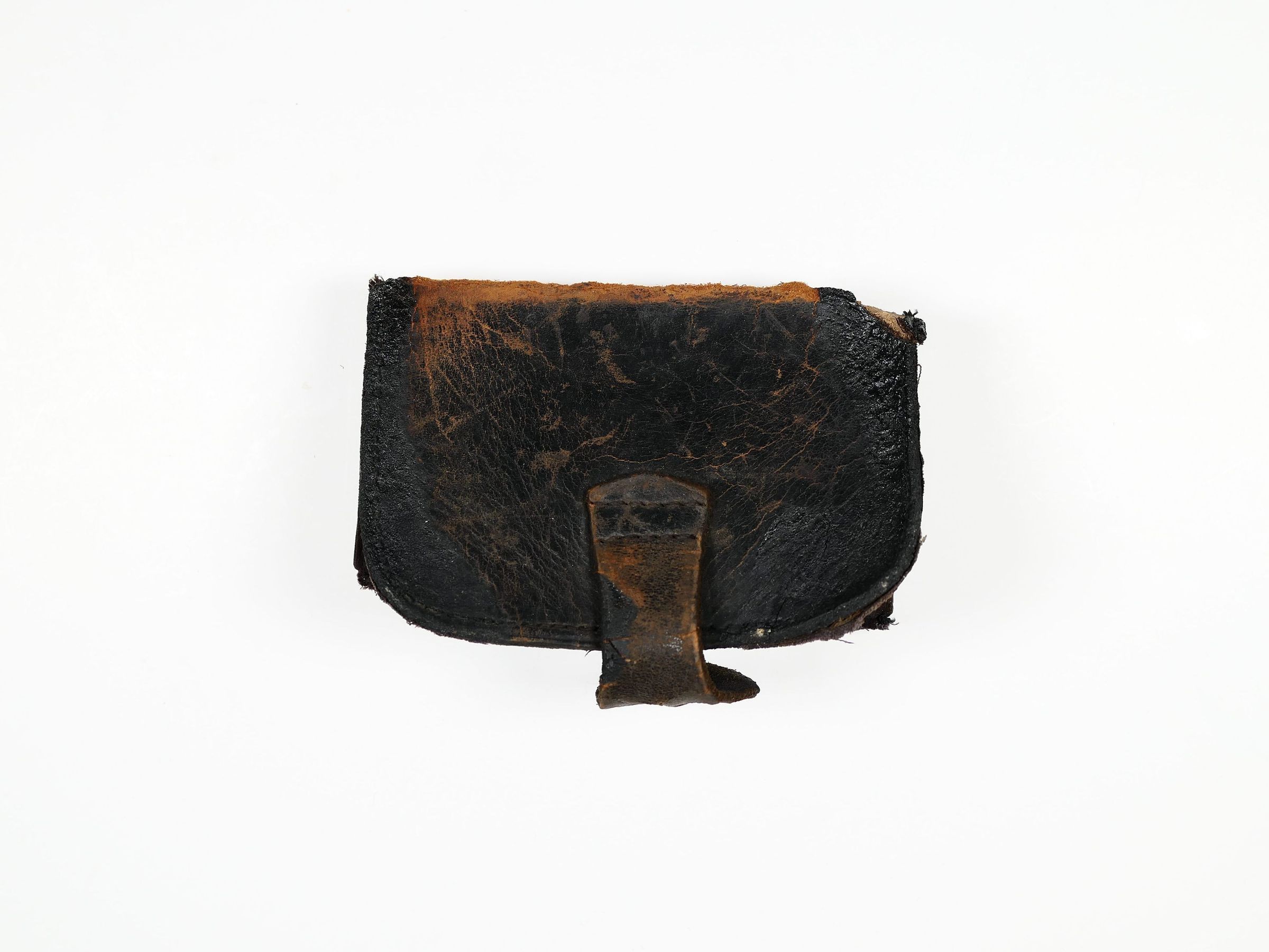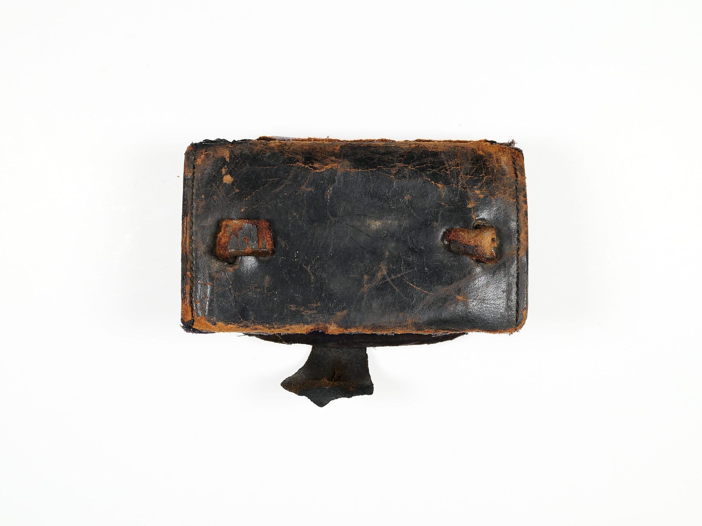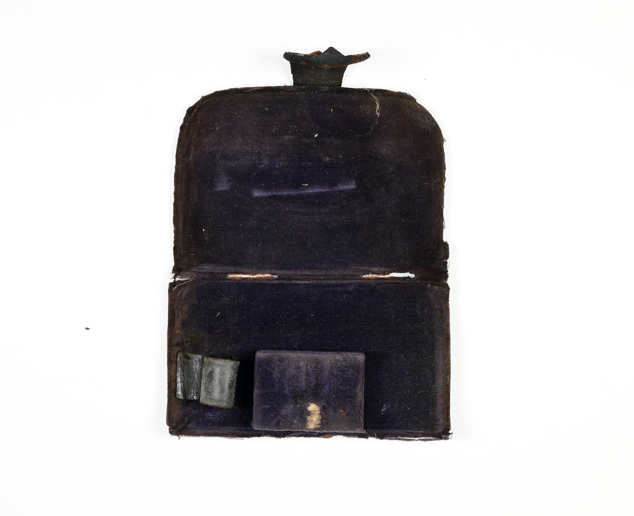 Unidentified leather "holder", similar to a wallet but with details that suggest a specific, unknown use. Leather closure strap, interior lined with velvet.Collection