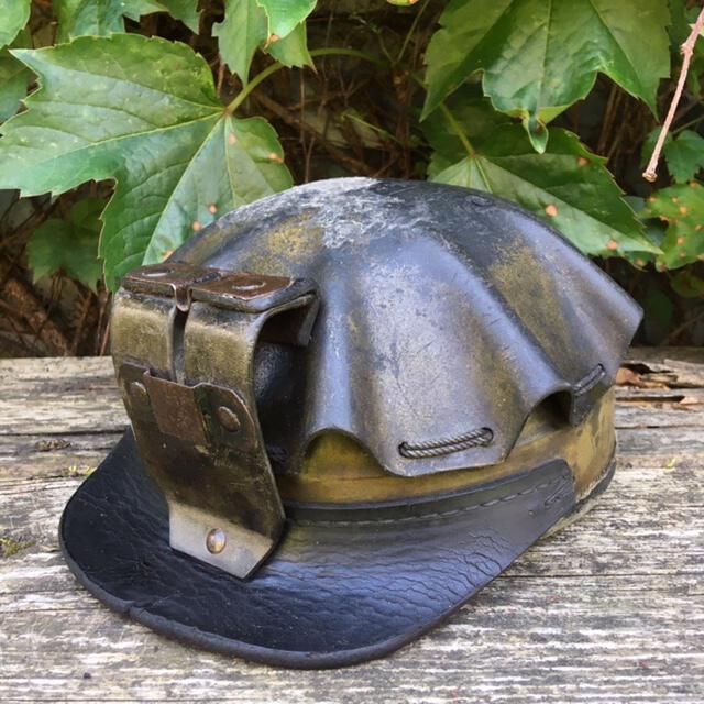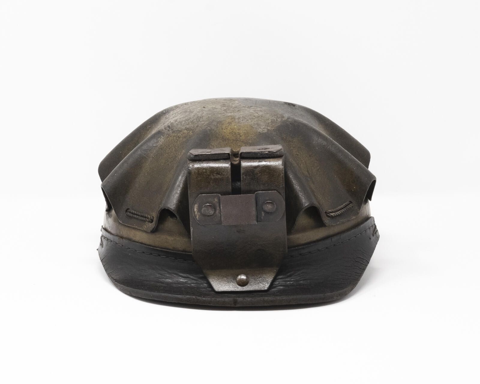 Leather "turtleshell" style coal miner's helmet, boiled leather top with leather brim, leatherette surround, canvas and leather interior lining, metal bracket for lamp attachment.Use