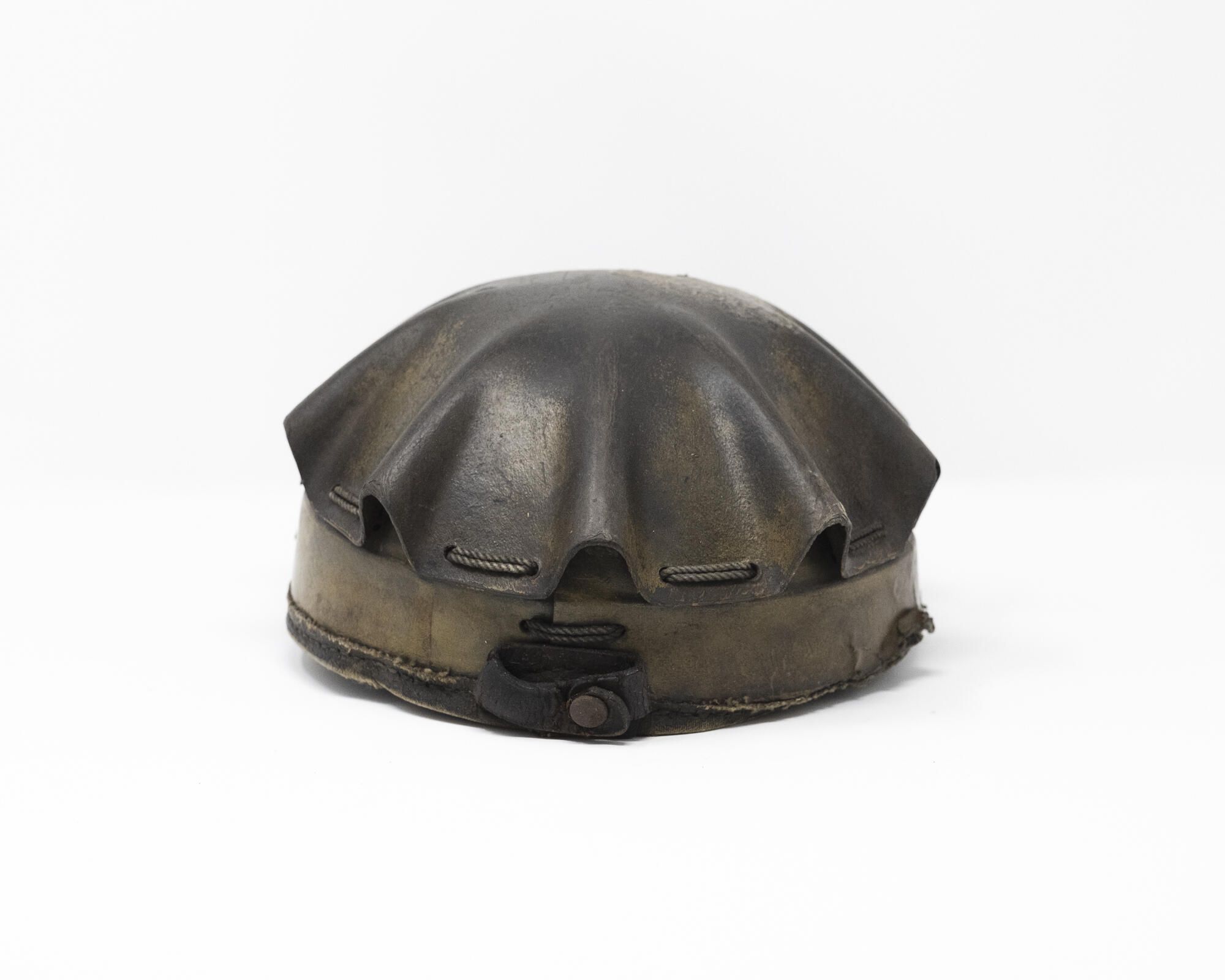 This is a Flexo Band Cool Cap. The Flexo Band Cool Cap was patented by Albert A. Strauss around 1933. The cap is made of reinforced leather with a dome comprised of upstanding ribs allowing for protection and ventilation. The Flexo Band Cool Cap was often colloquially referred to as a "turtle shell" helmet, due to its distinctive style. The Flexo Band Cool Cap was distributed by a few different companies during the 20th century, including the MSA Company and the Portable Lamp and Equipment Company (Pittsburgh). The leather and metal lamp bracket is attached to the front of the cap. The bracket could have held an oil-wick lamp, a carbide lamp or, later, an electric lamp.Research Type