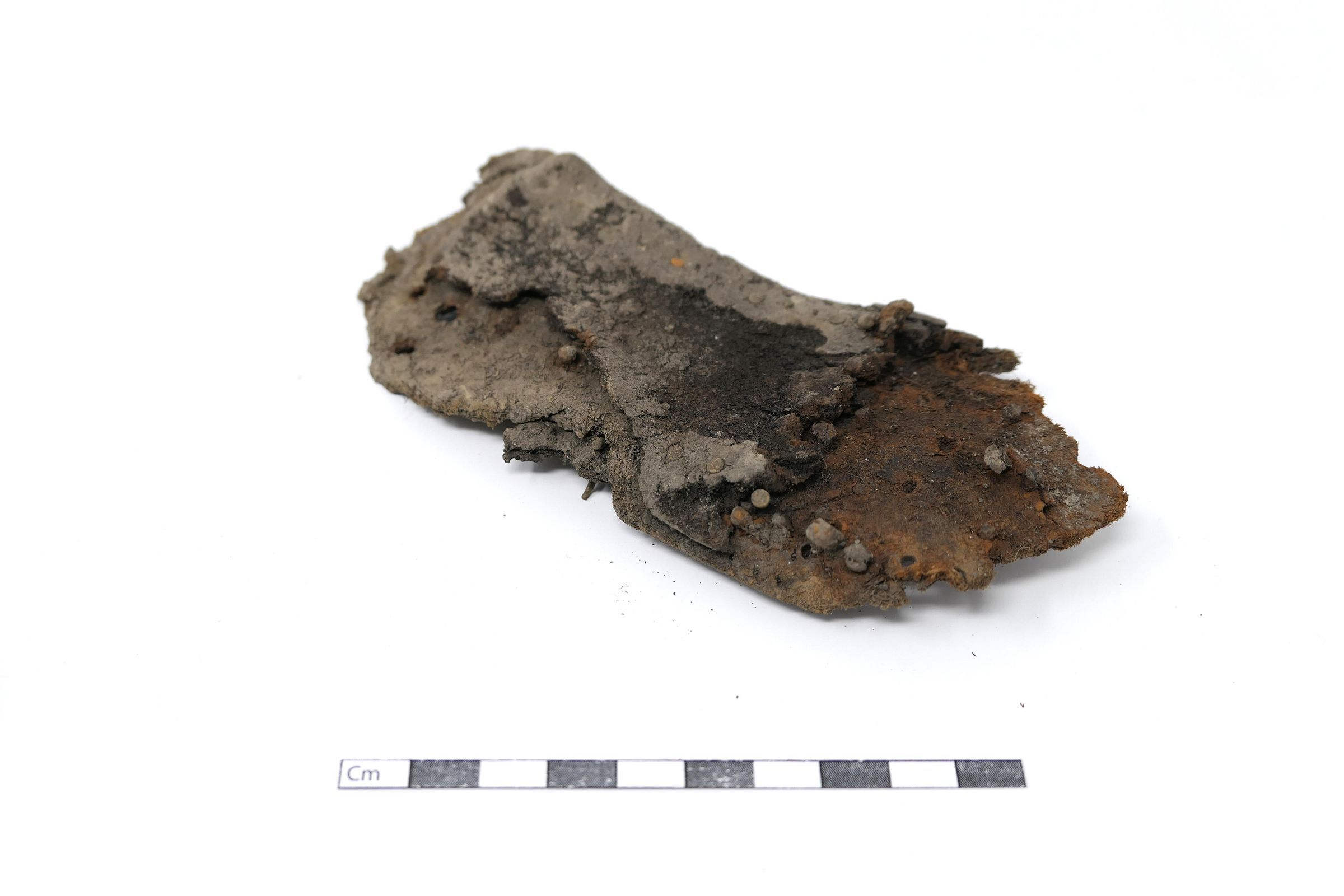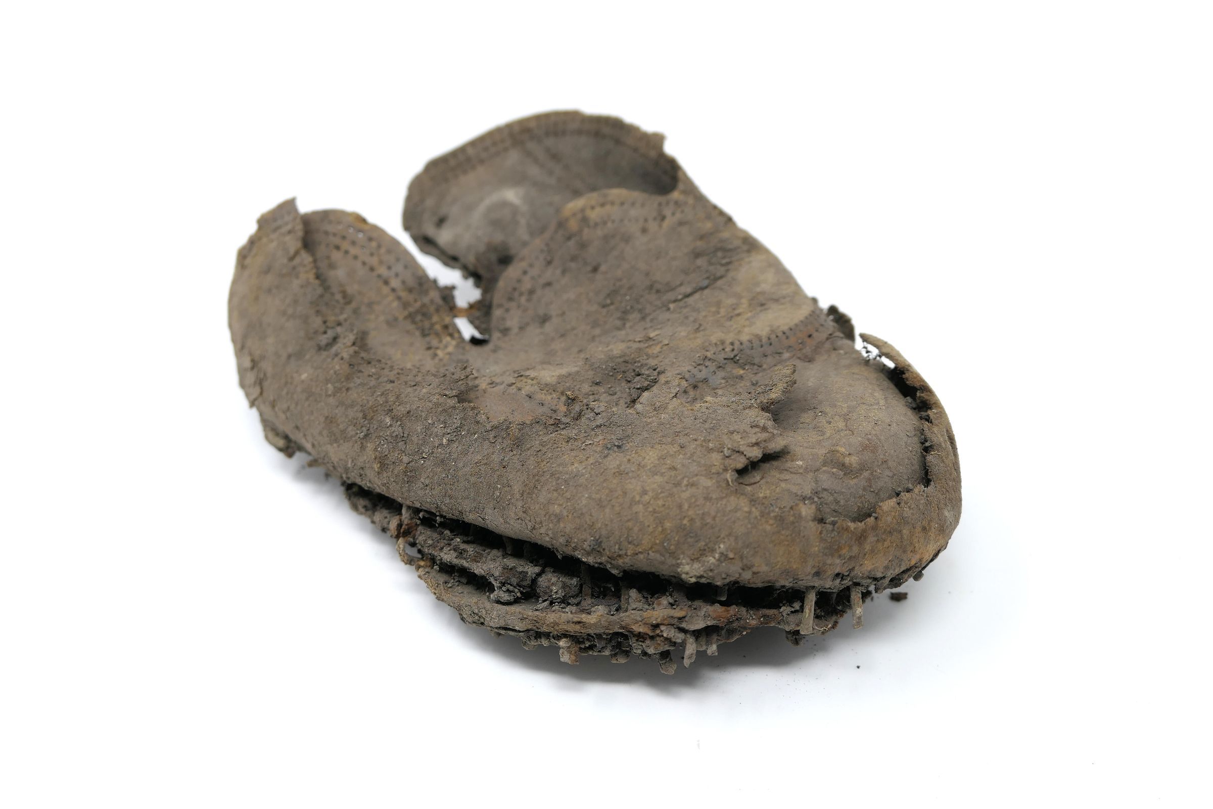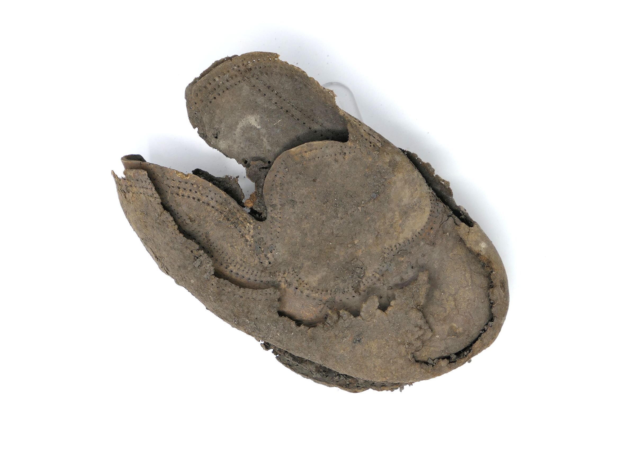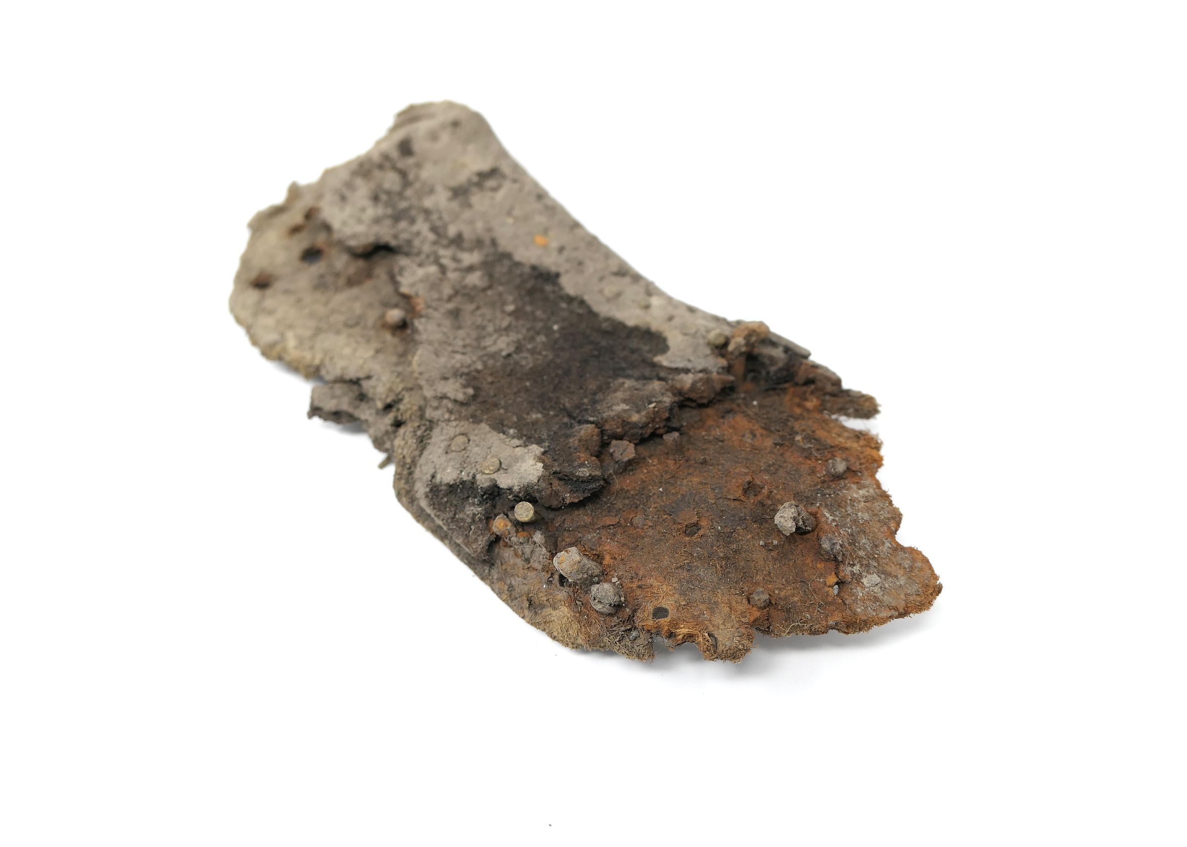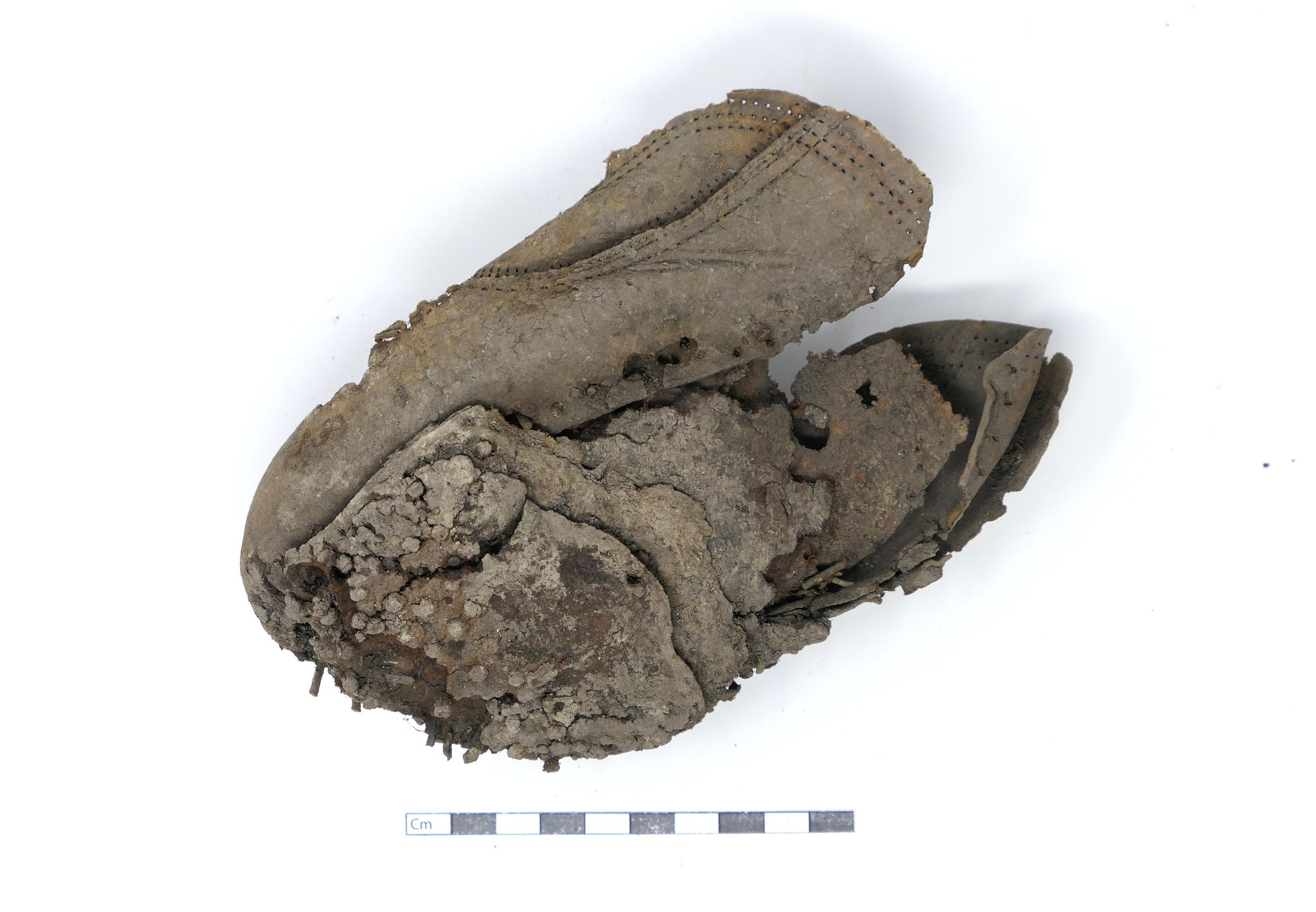 Remains of leather shoe, or boot. Vamp/upper and sole are present. Shoe is fitted for a right foot, size unknown. Quarter, heel, tongue, and eyelets are missing.Context