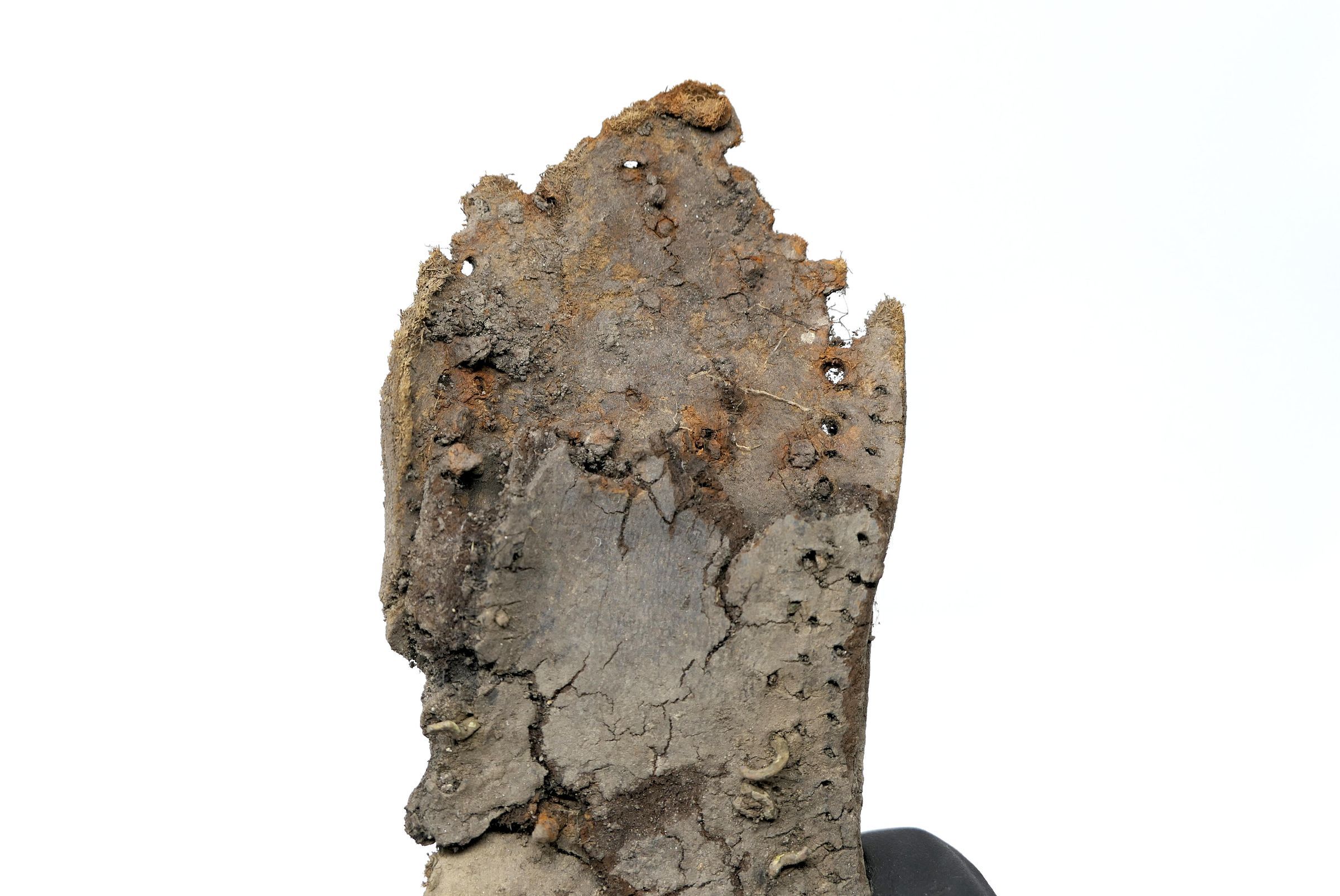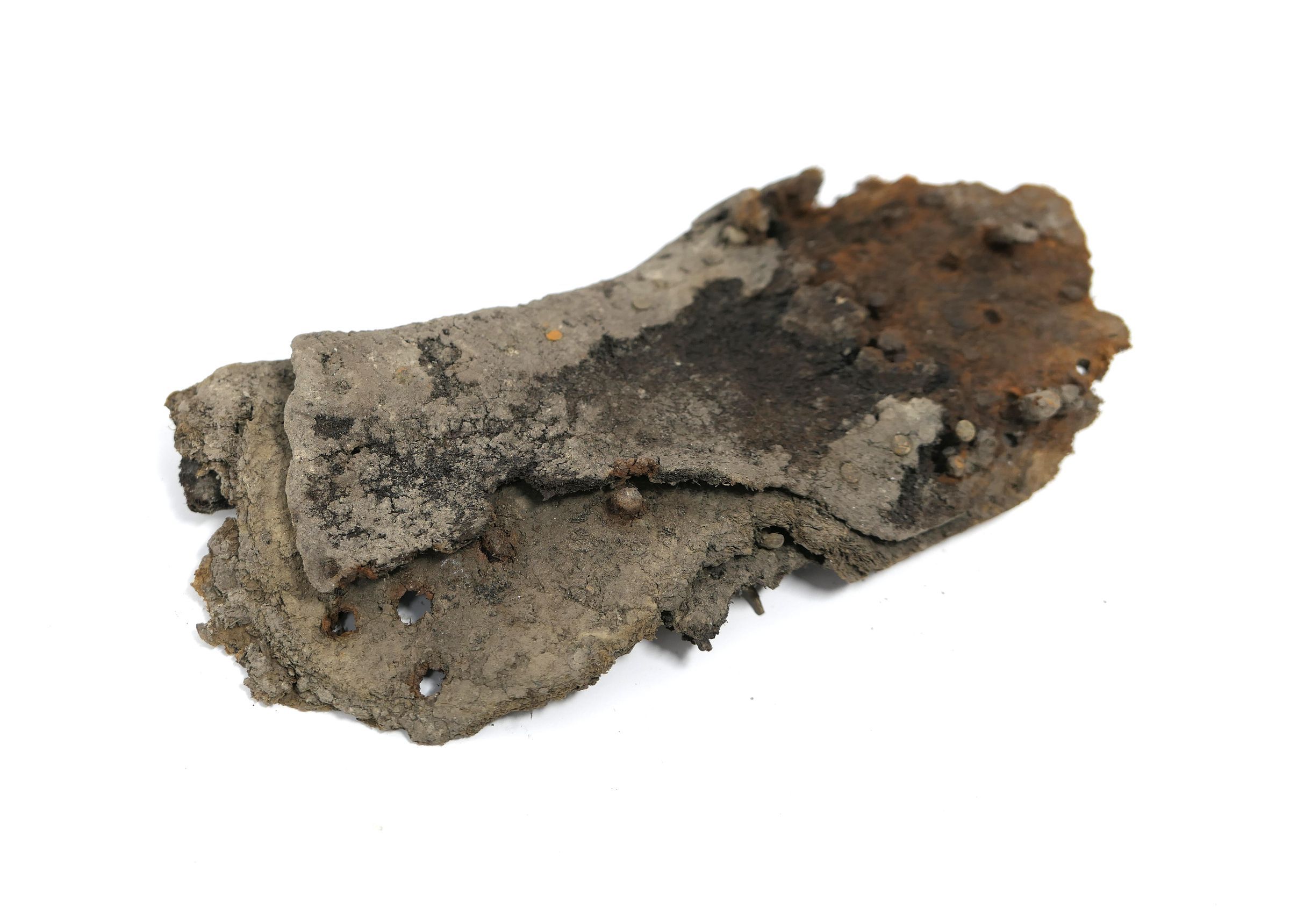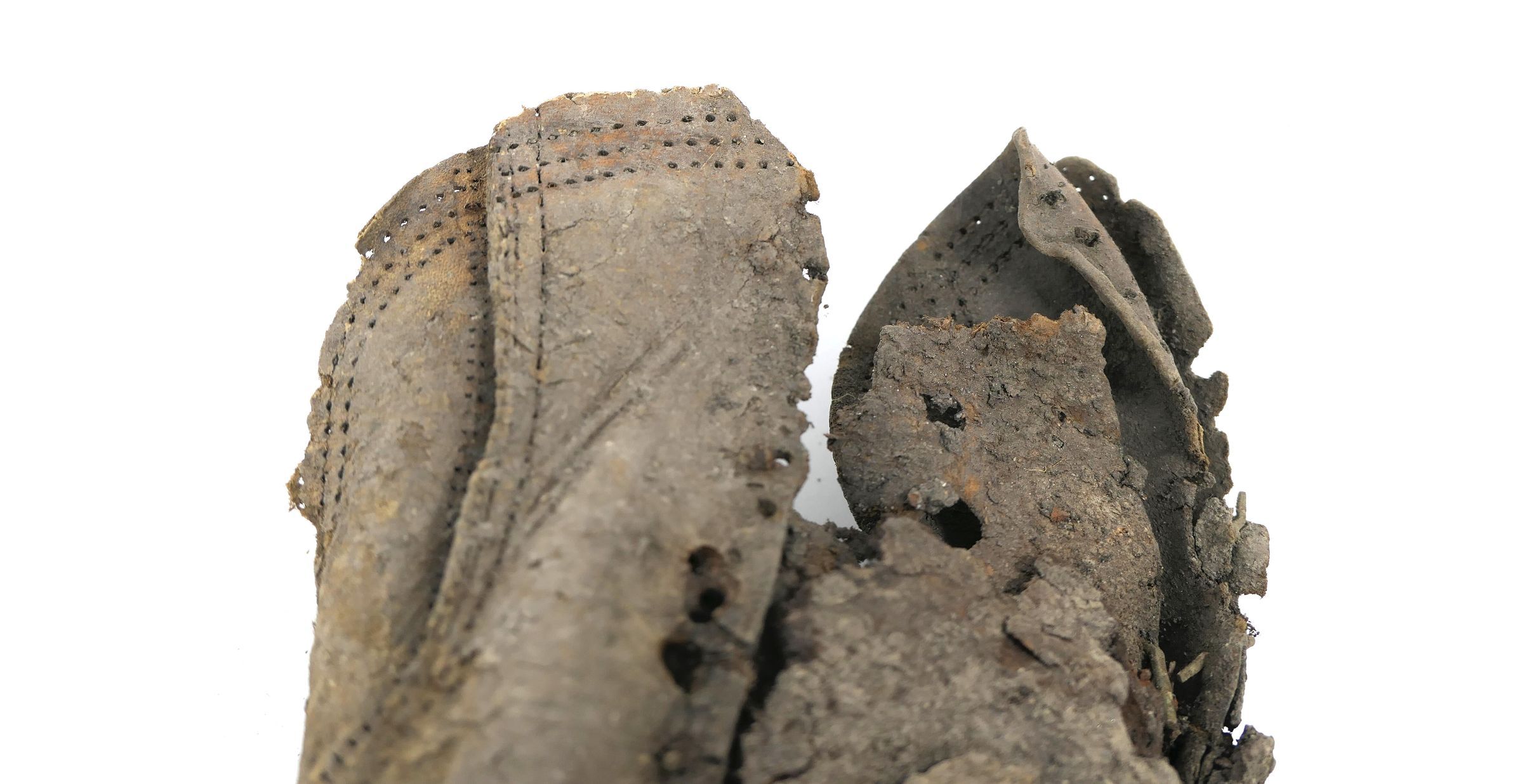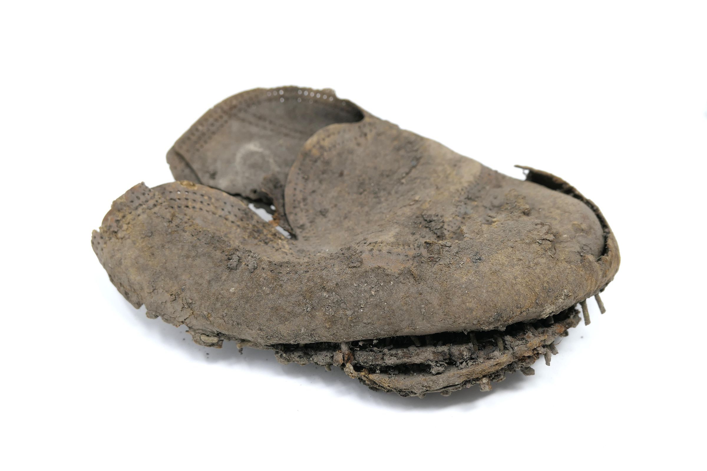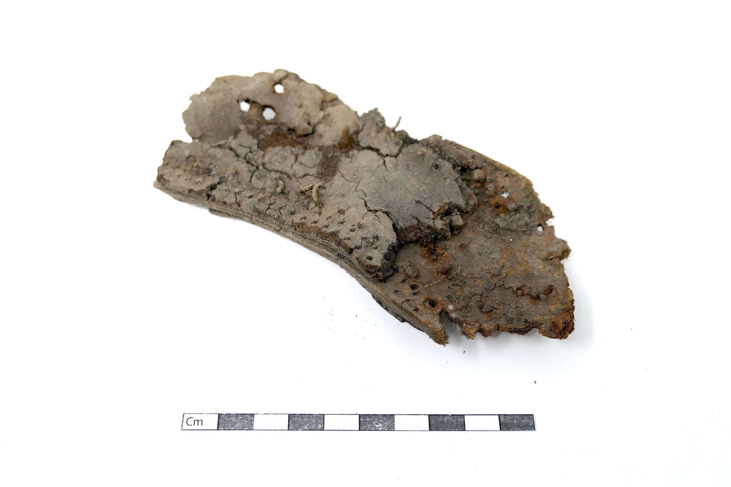 Remains of leather shoe, or boot. Vamp/upper and sole are present. Shoe is fitted for a right foot, size unknown. Quarter, heel, tongue, and eyelets are missing.Context