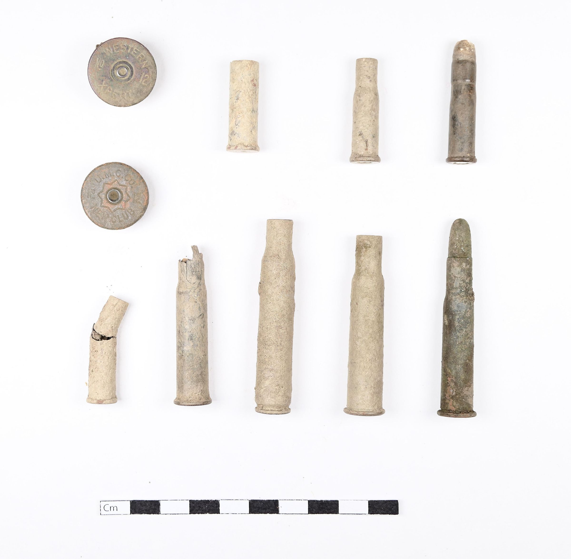 This collection includes six (6) casings, two (2) cartridges, and two (2) shotgun brass heads.Context