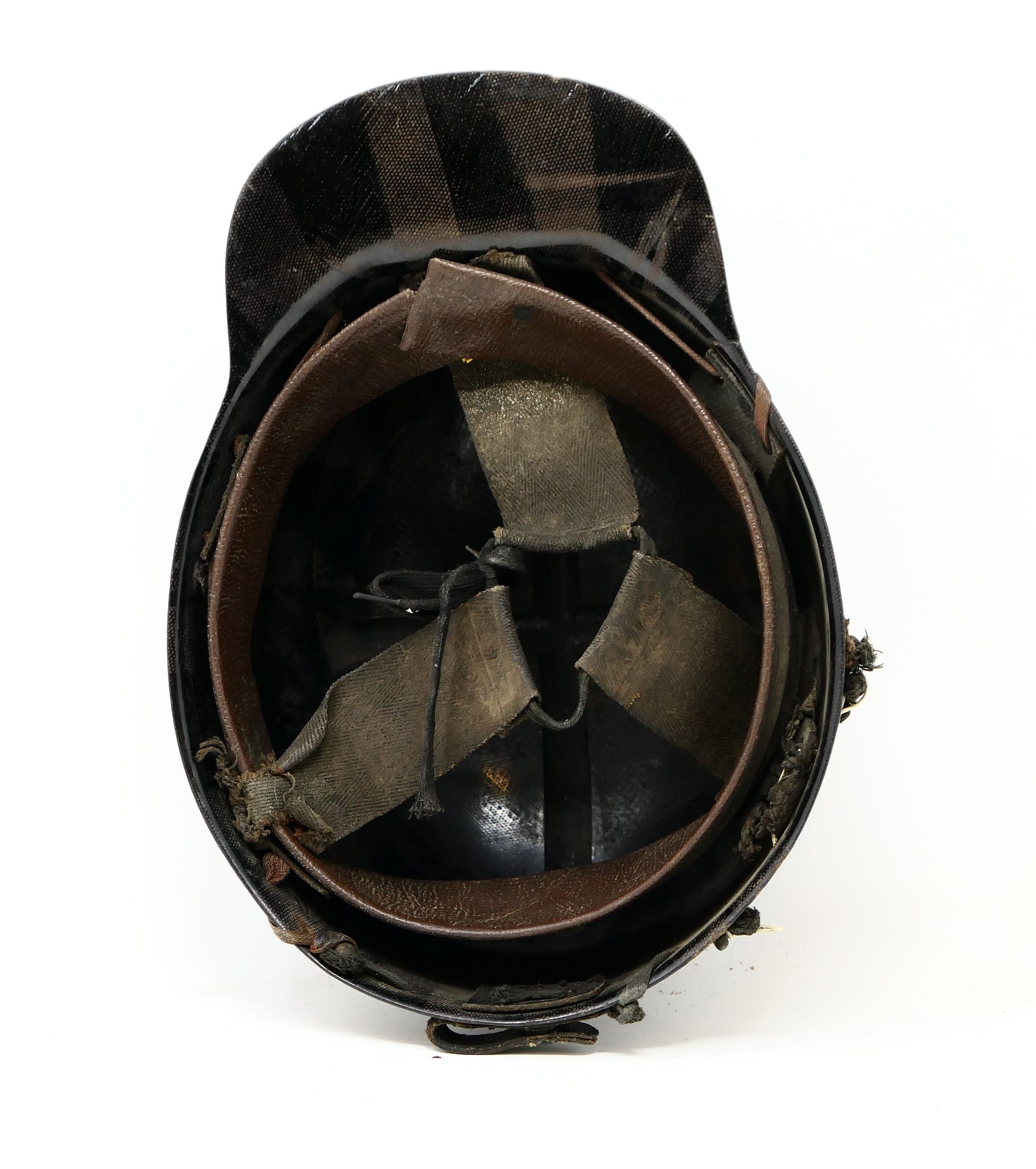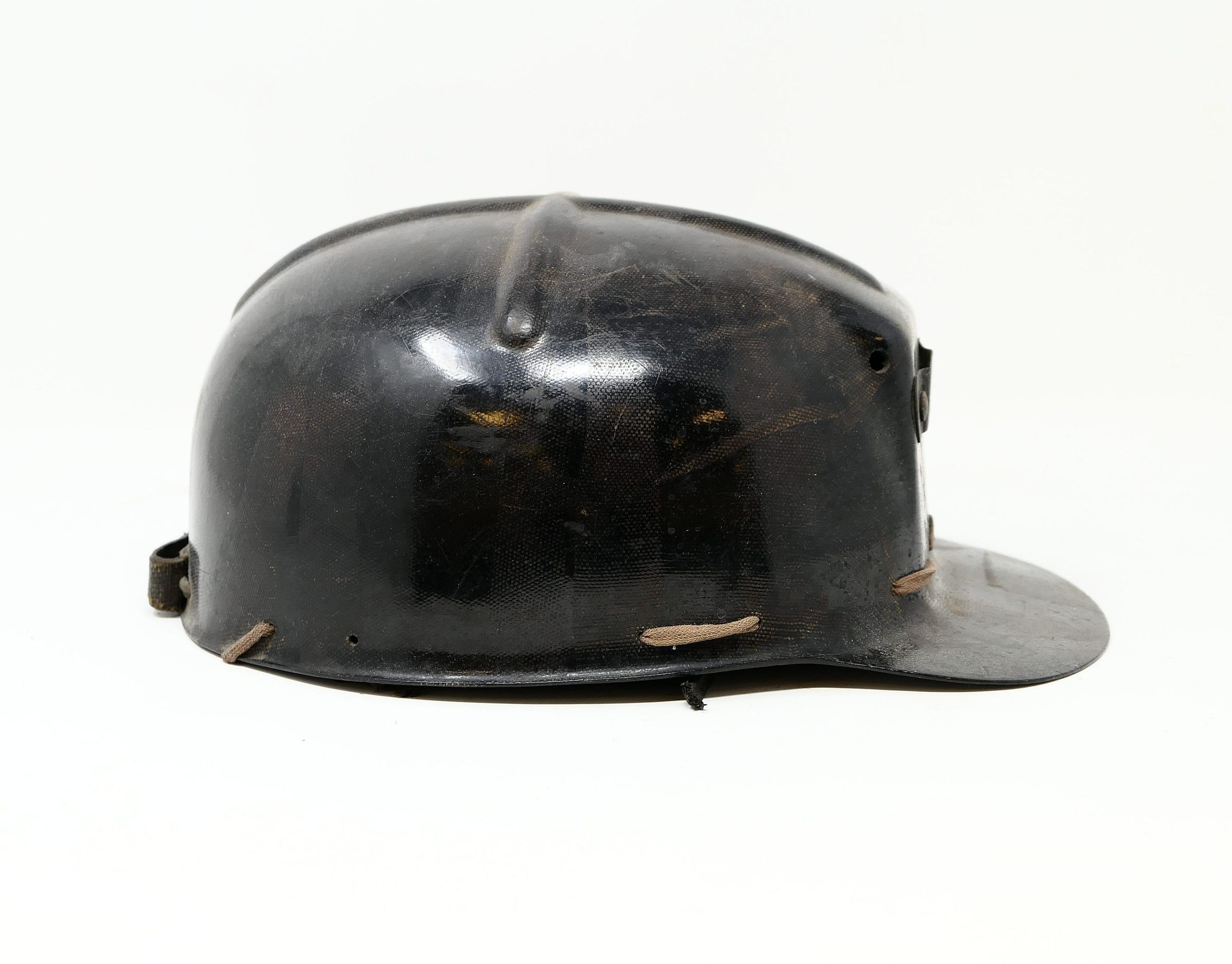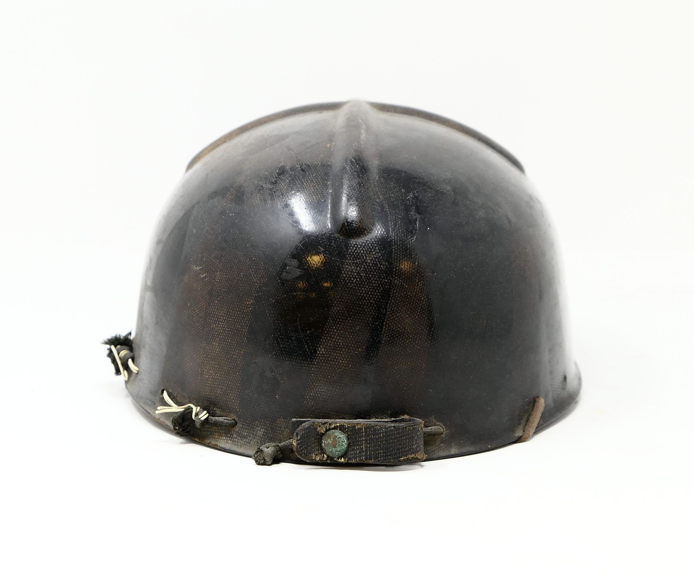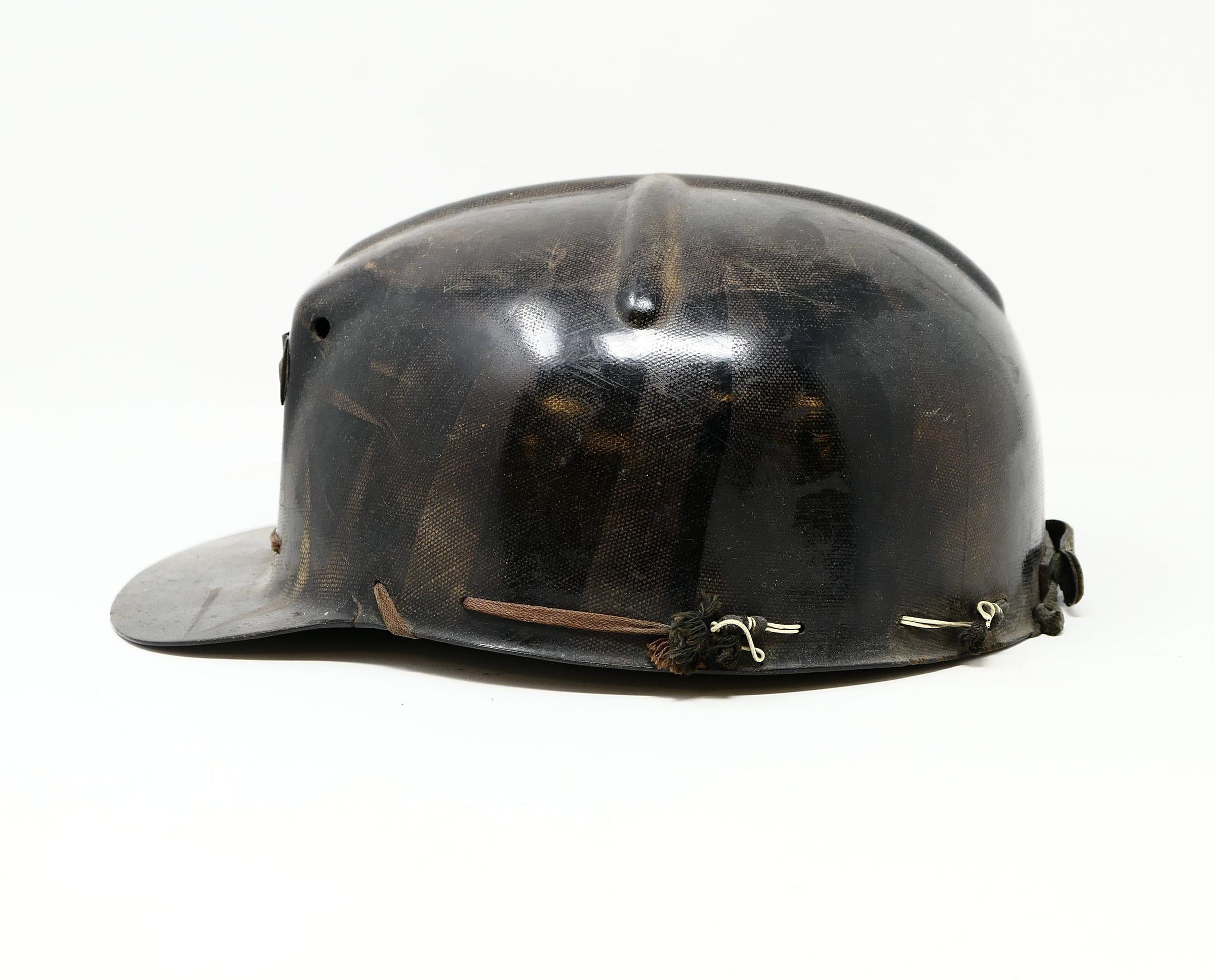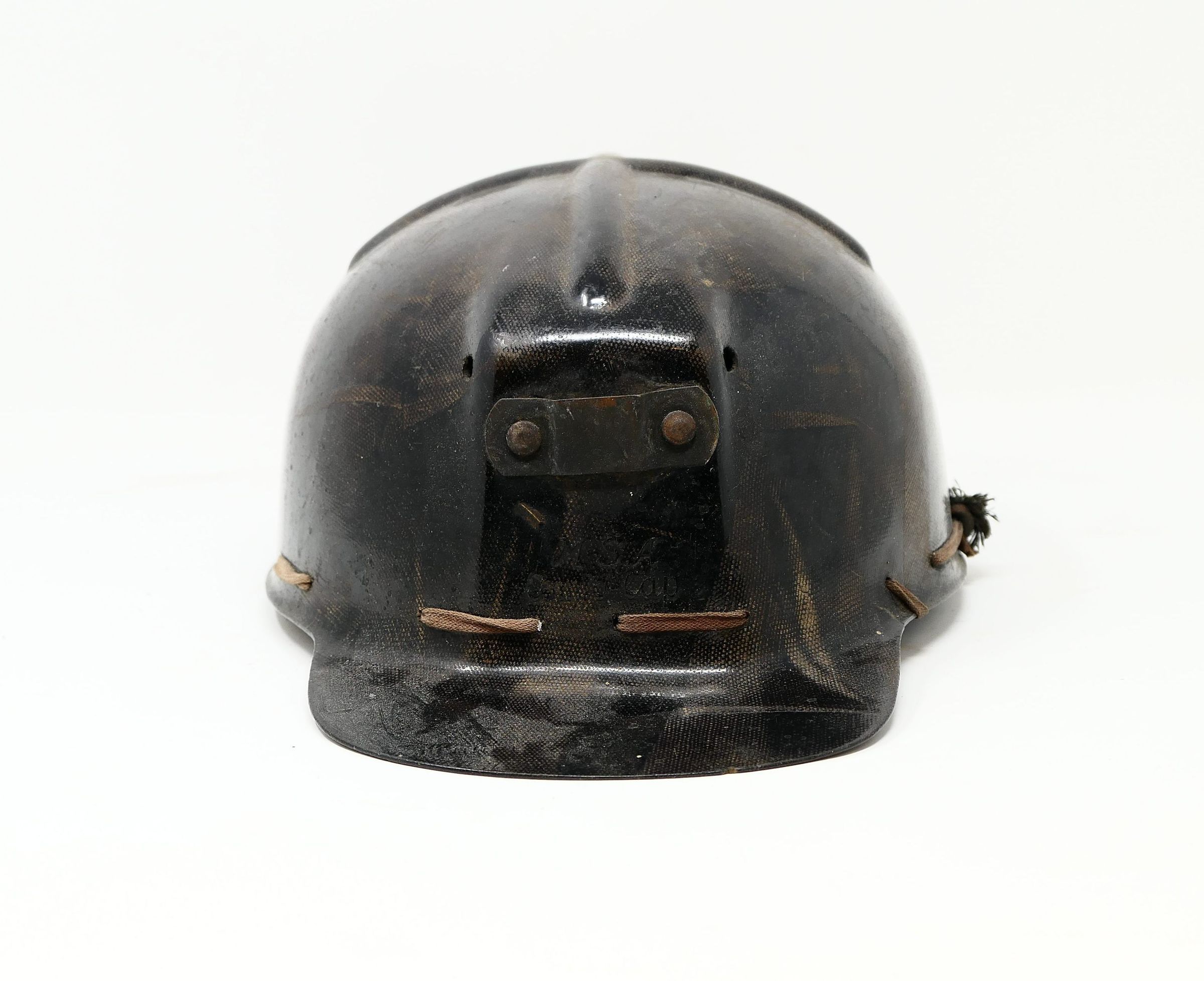 Modern coal miner's helmet with interior lace-in liner. This is a "low vein" style helmet, meaning the crown clearance is closer to the head for work in low ceiling areas. Also known as a "tiger stripe" helmet, a reference to the striations in the material from the fiberglass manufacture process.Use