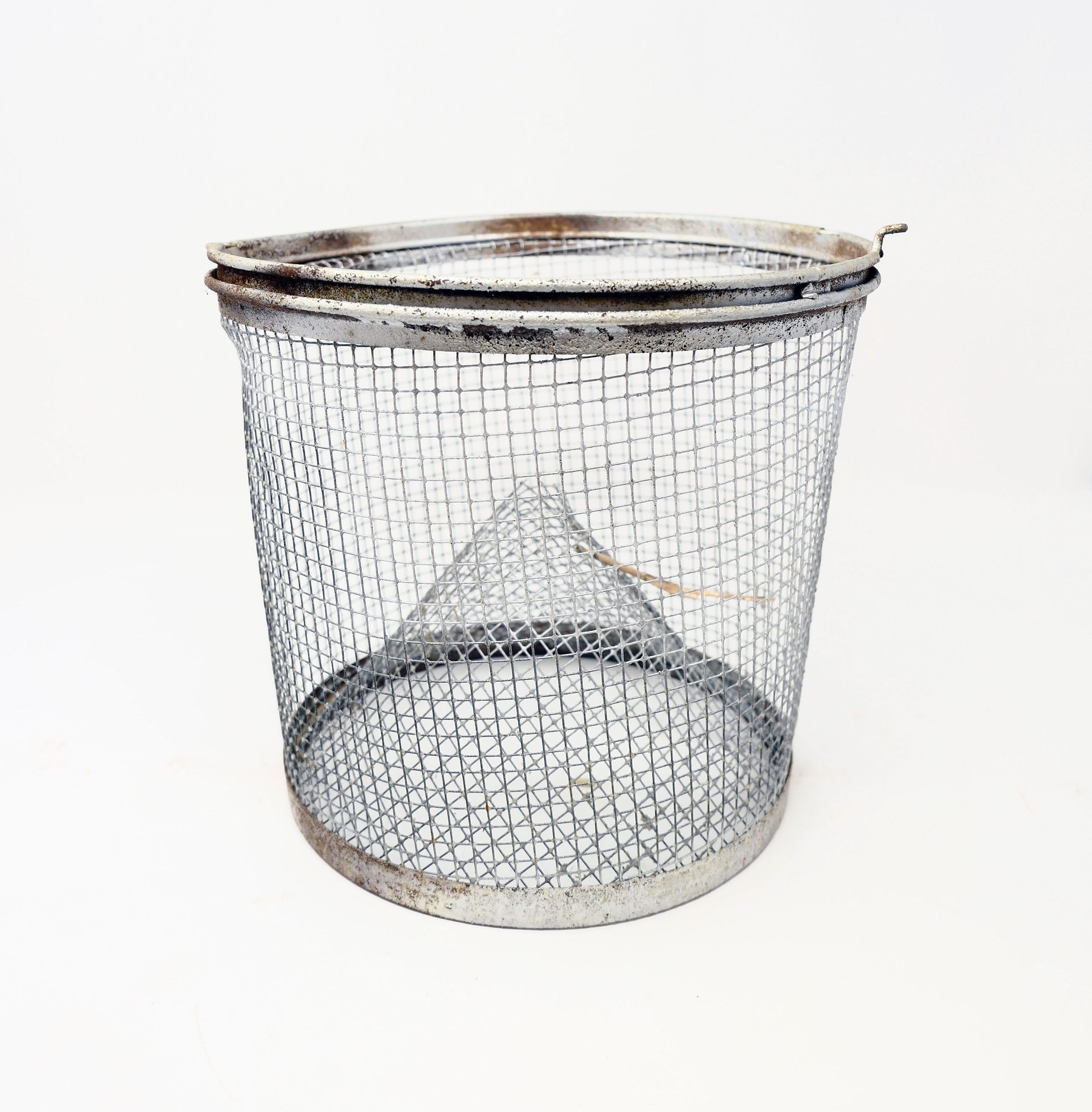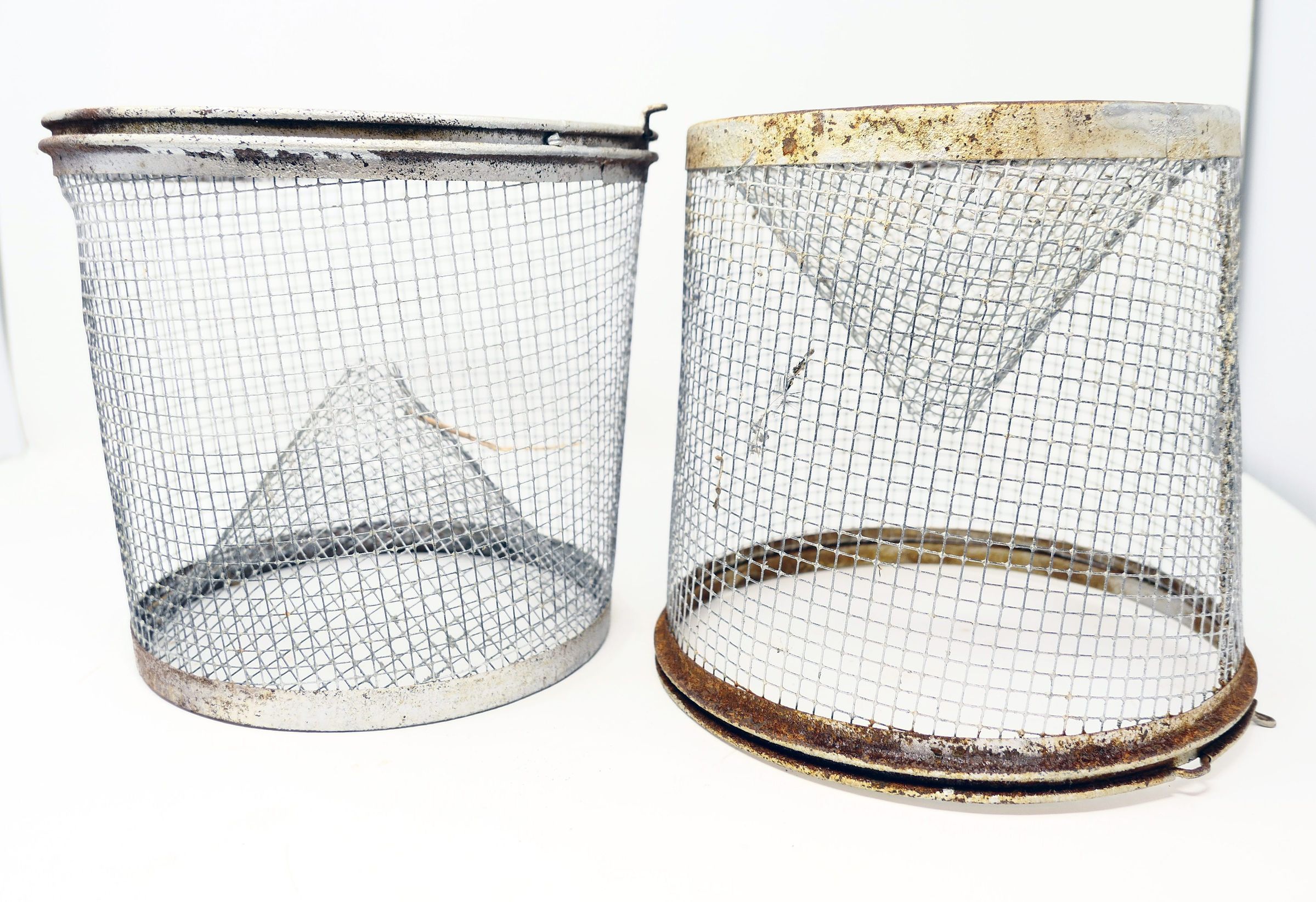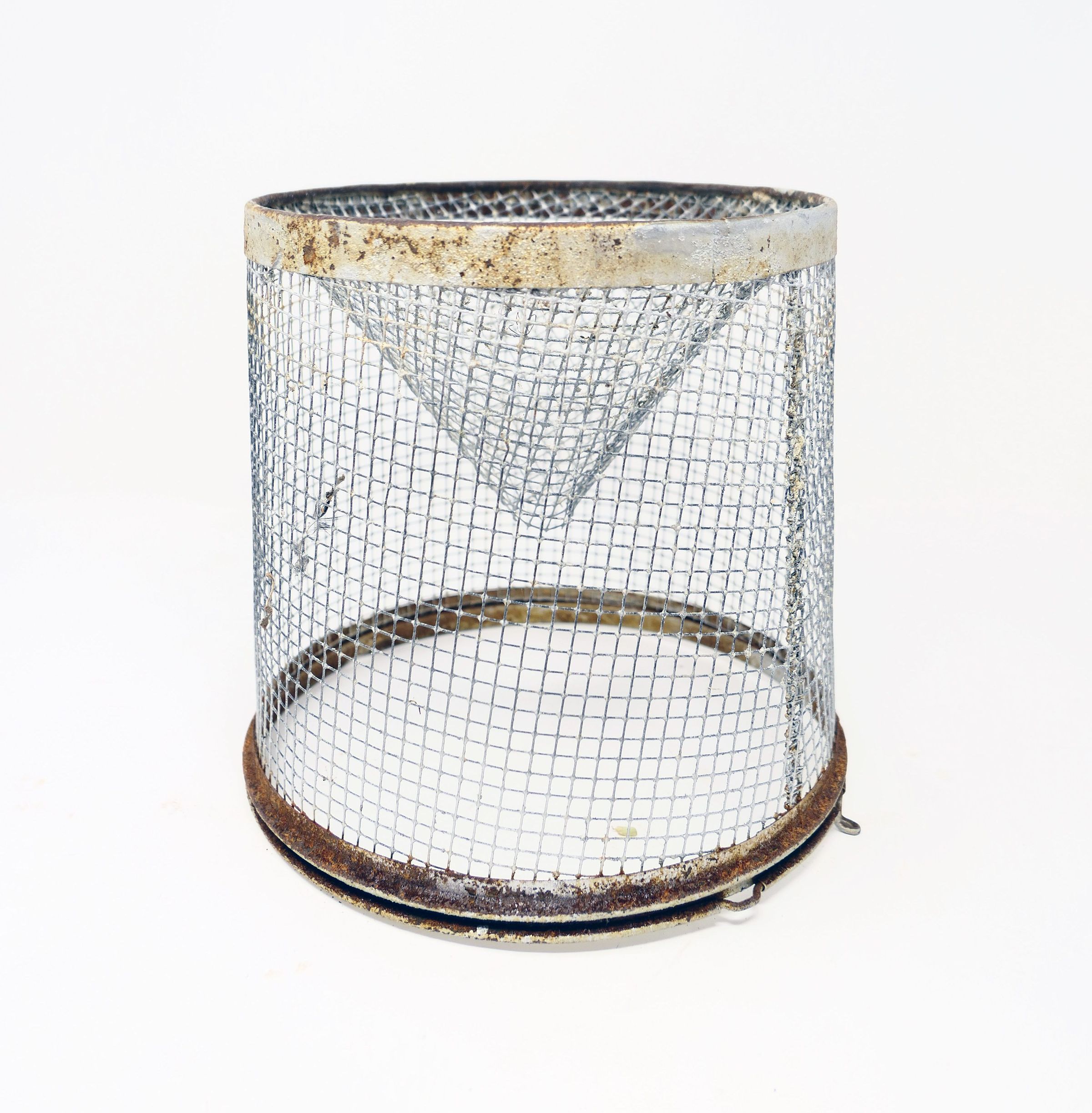 Minnow trap in two pieces. Both parts are joined together at the large opening ends, creating a fenced cavity which small fish swim into through a small opening.Collection