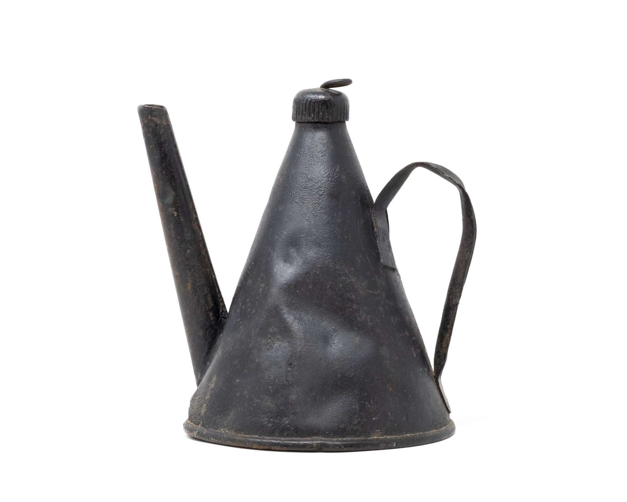 Black metal oilwick "teapot" lamp with handle. This lamp may be handmade from a tin funnel.
