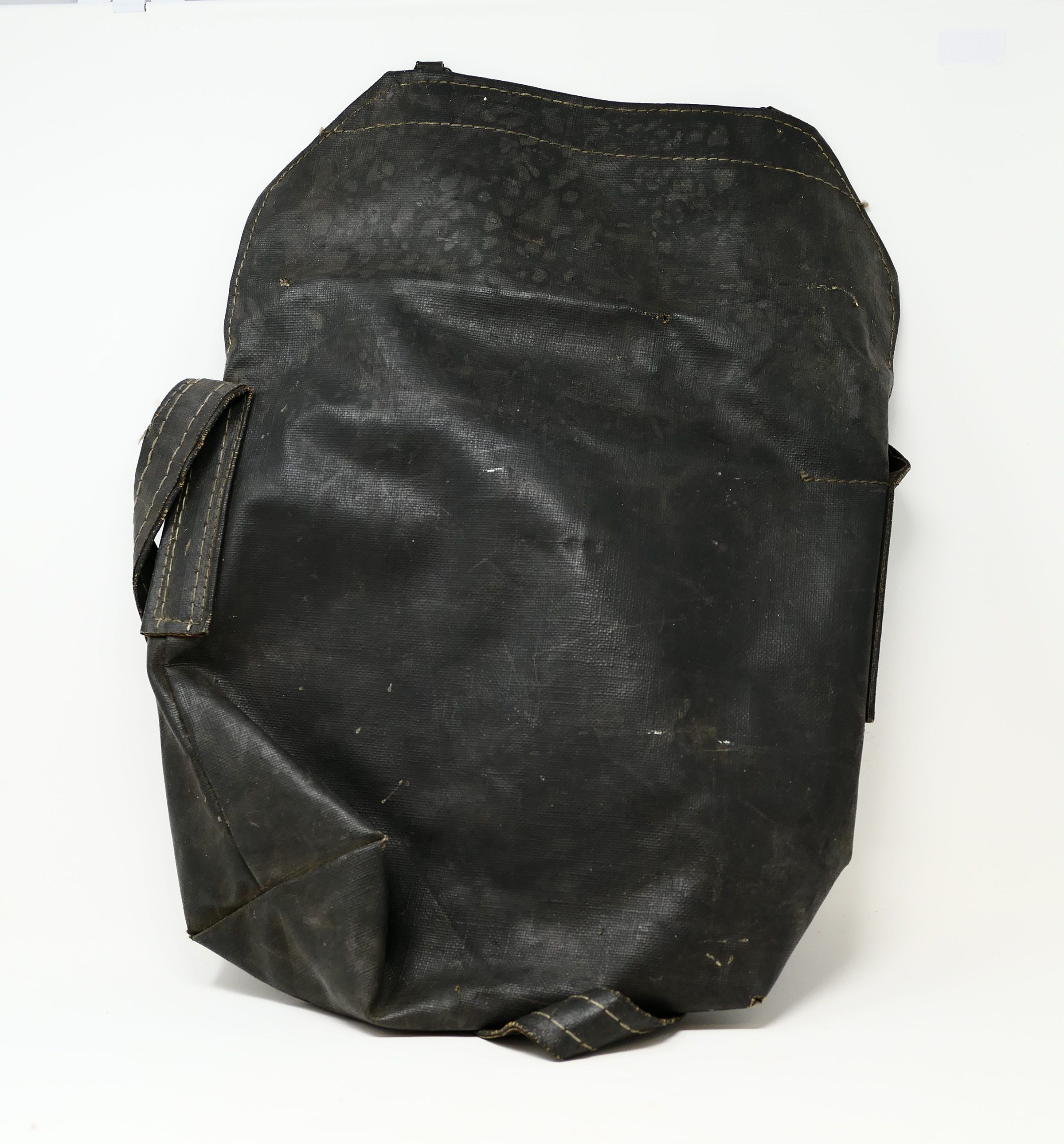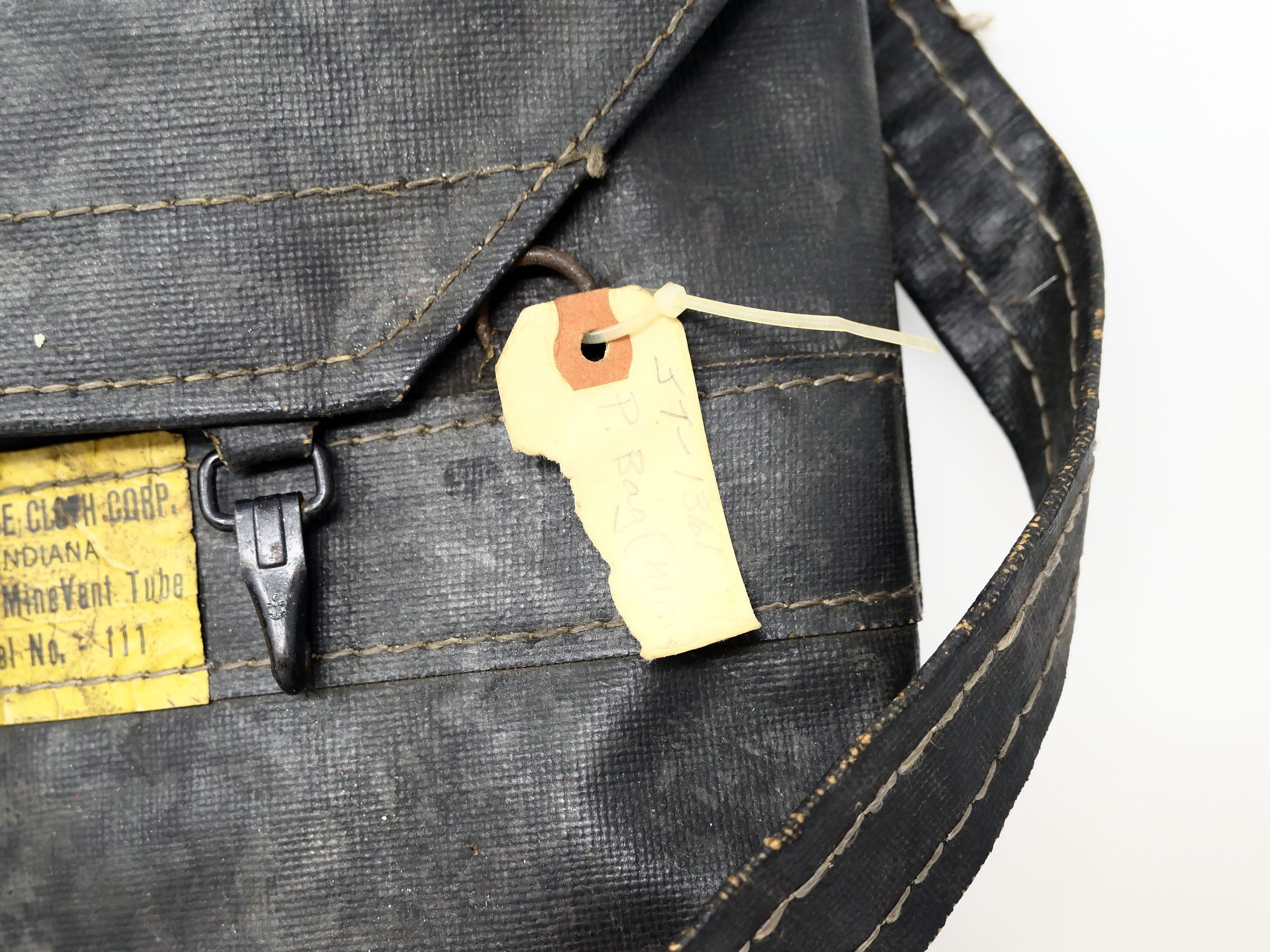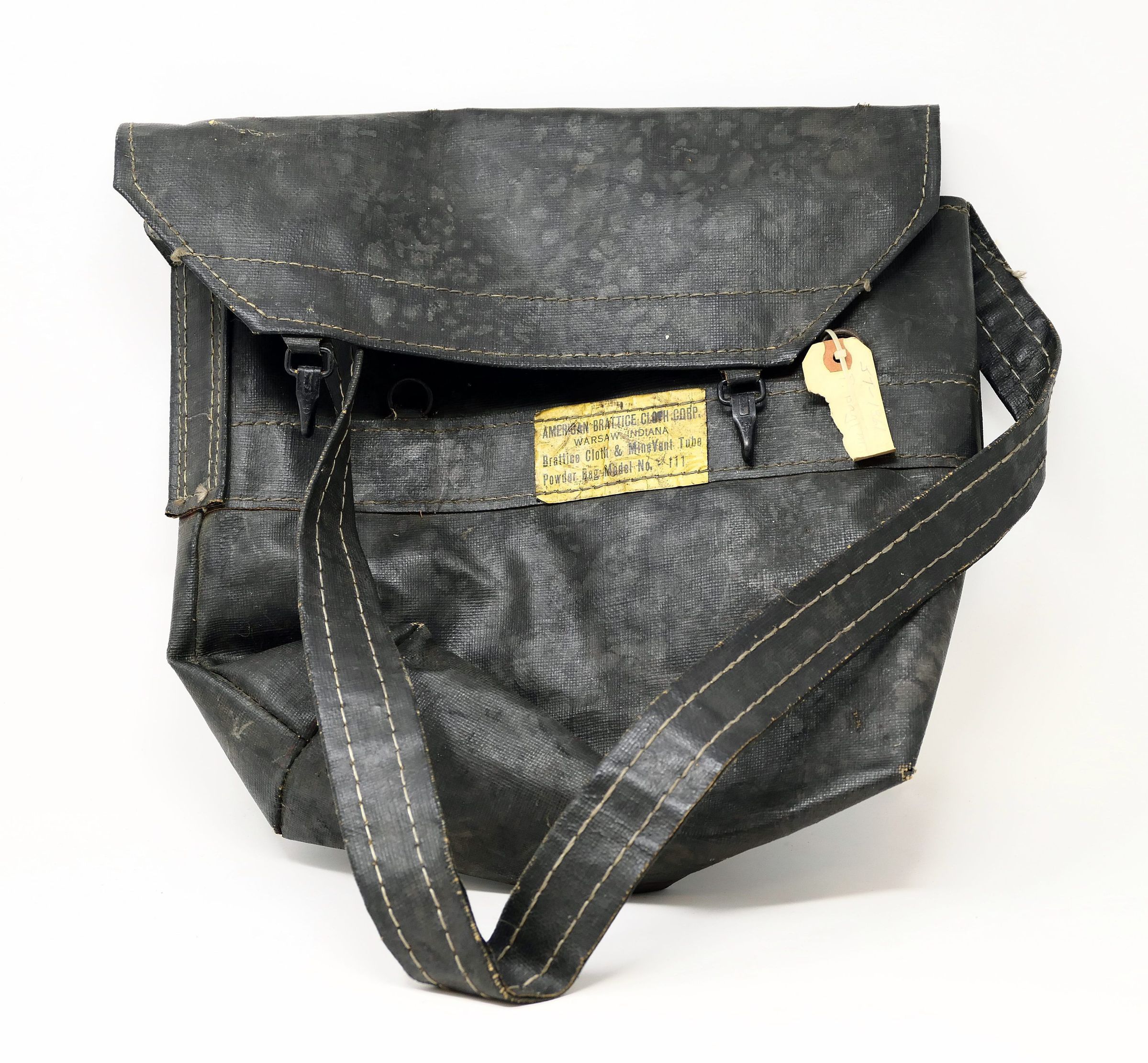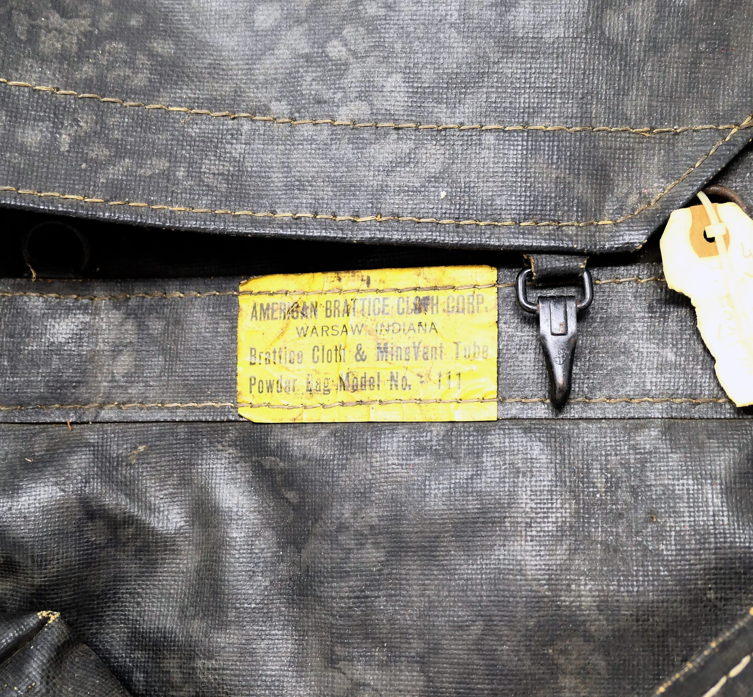 Powder bag, or tool bag, fabricated from brattice cloth, primarily for carrying blasting powder and explosives and also ideal as a general tool bag for controlled environments.Context