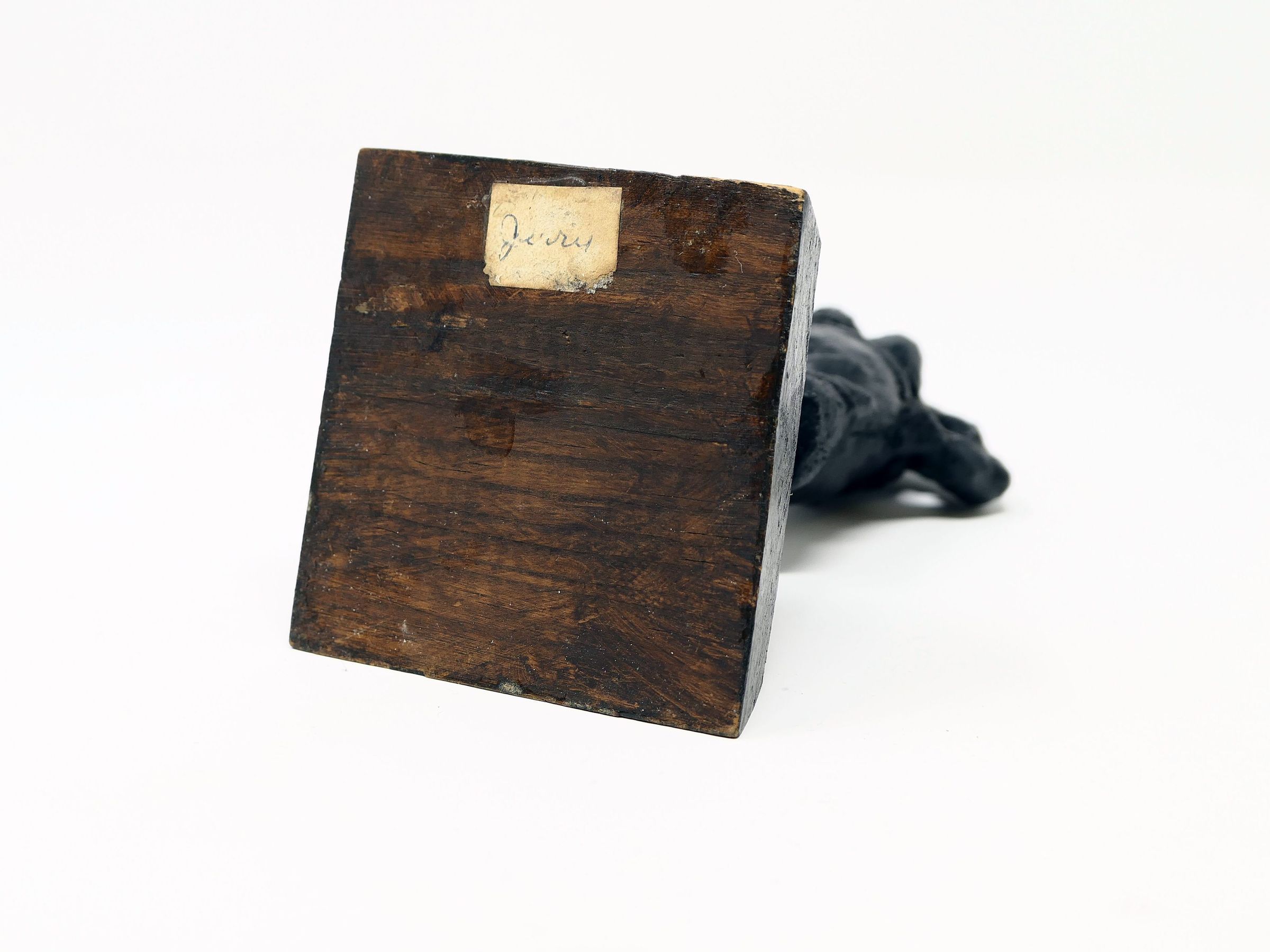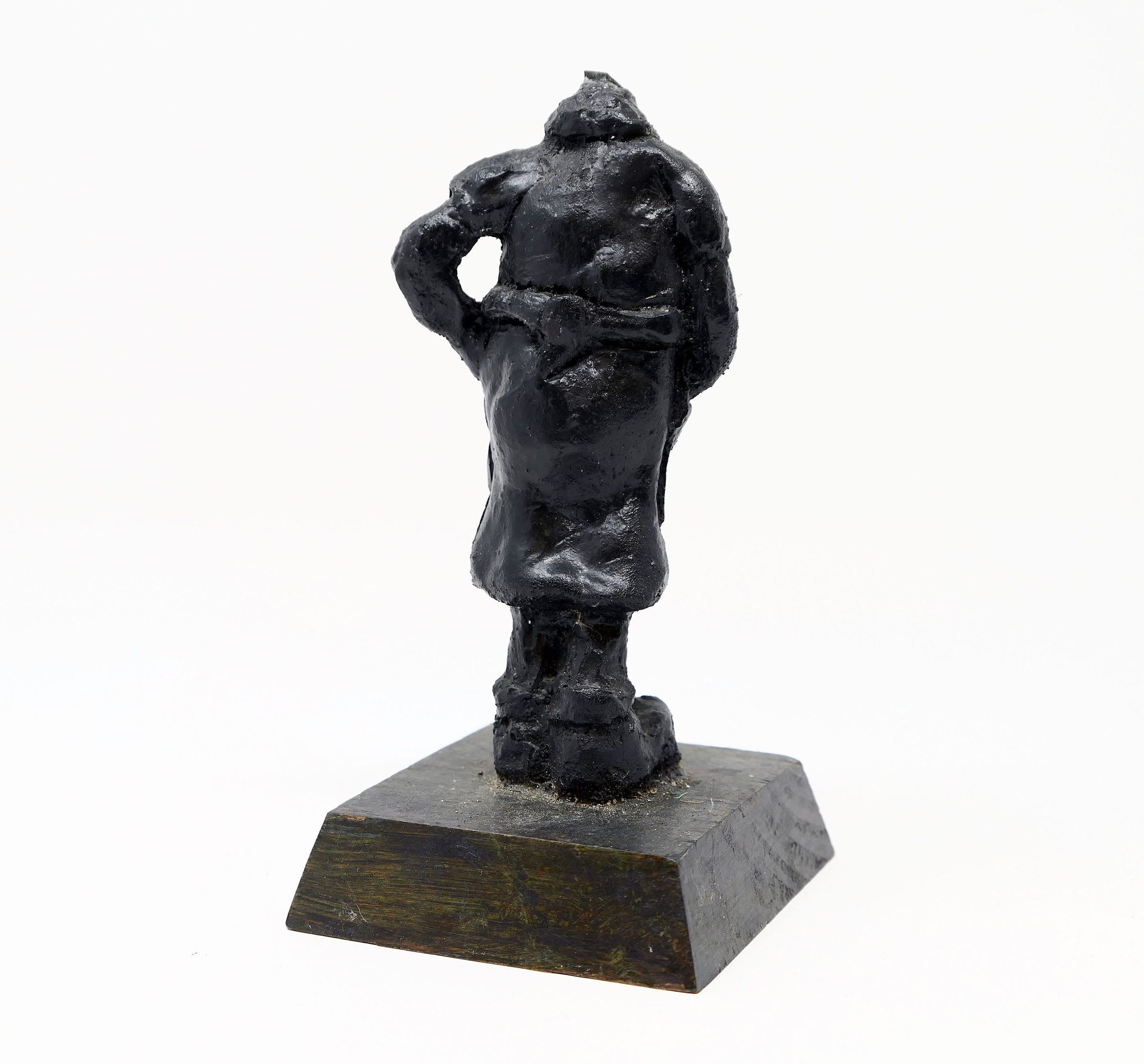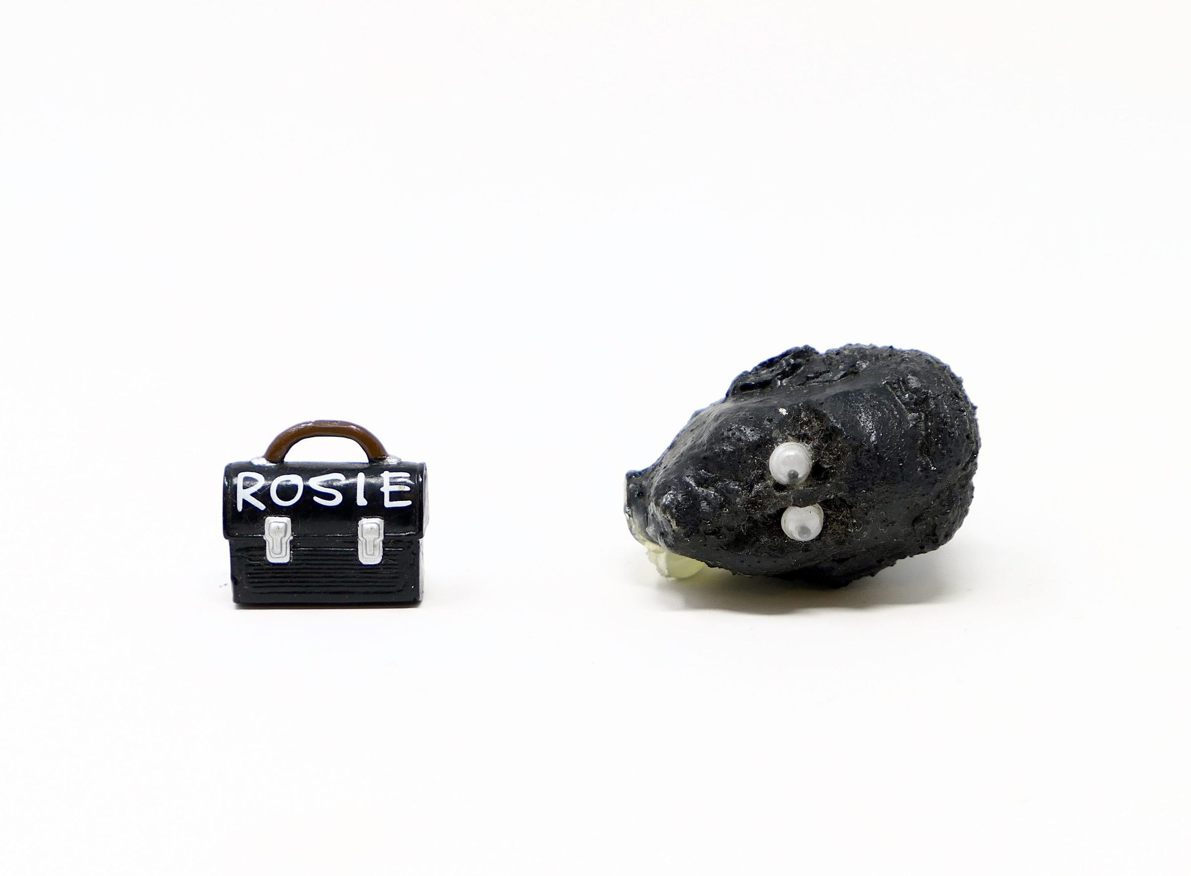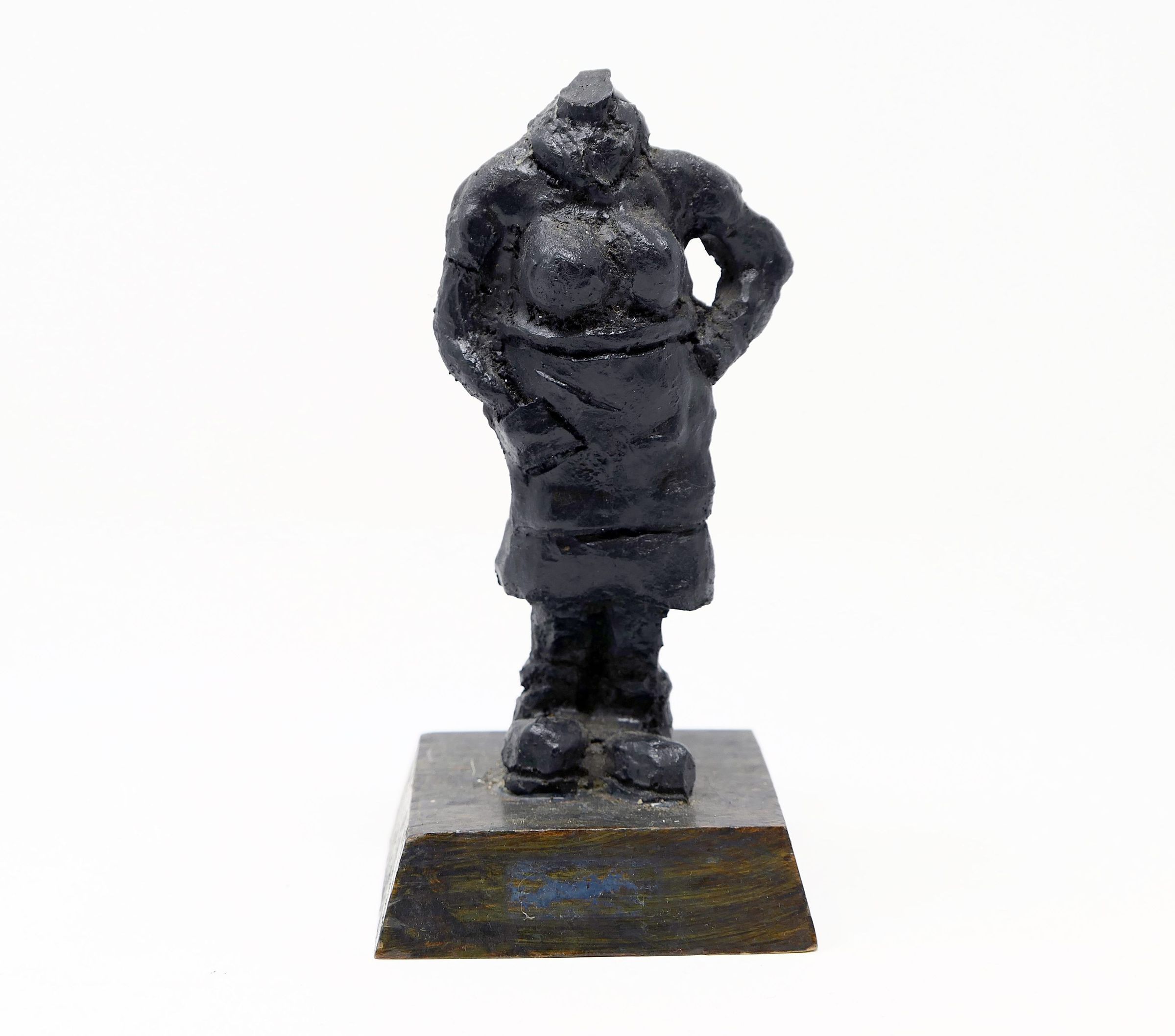 Small cast figurine of a female-bodied person wearing an apron. Although broken at acquisition, the figure presumably carried a lunch box labeled "Rosie". Two "googly" eyes have been glued on to the head.Type of Sculpture