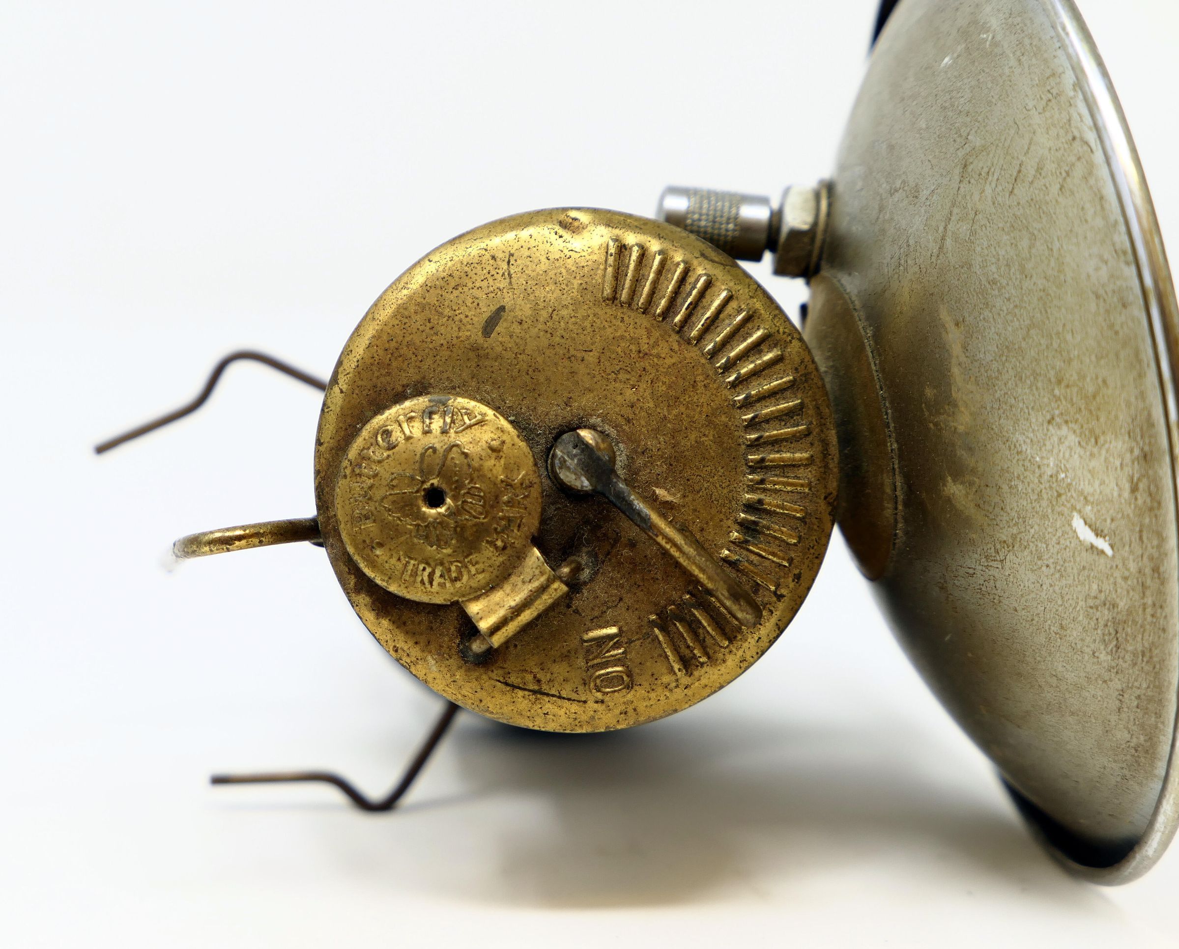 "The Butterfly (A.K.A. Safesport) has been called a Hong Kong knockoff of the Guy's Dropper. The outward designs are very similar, however there is a world of difference in their operation. Where the Dropper has a good reputation of being a trustworthy lamp, the Butterfly does not. Though the Butterfly was fairly inexpensive, it was never a dependable lamp. Leaks abounded, gas tubes fractured or pulled free, and various problems arose. A Butterfly is easily identified by a butterfly stamped on to the water door. Regard this stamp as a mark of impending darkness."