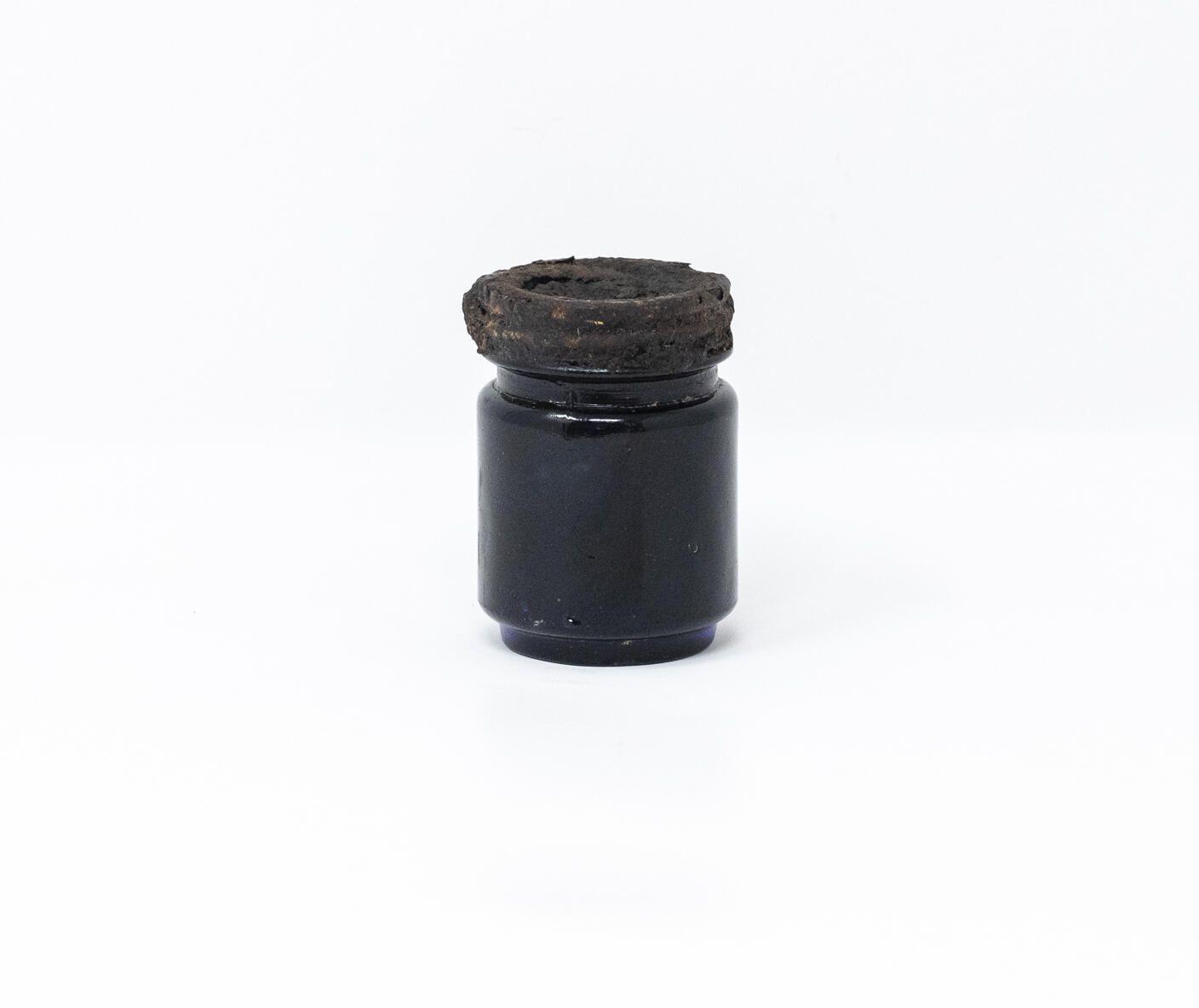 Small glass jar of black shoe cream polish, metal lid heavily corroded.Collection