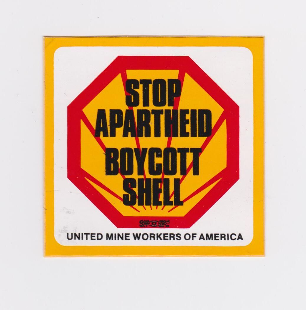 Square vinyl sticker created by the United Mine Workers in support of the 1987 campaign to force Shell Oil to divest from South Africa. Sticker design features the graphic icon of the campaign, the Shell Oil logo shaped into an octagonal "stop sign".Context