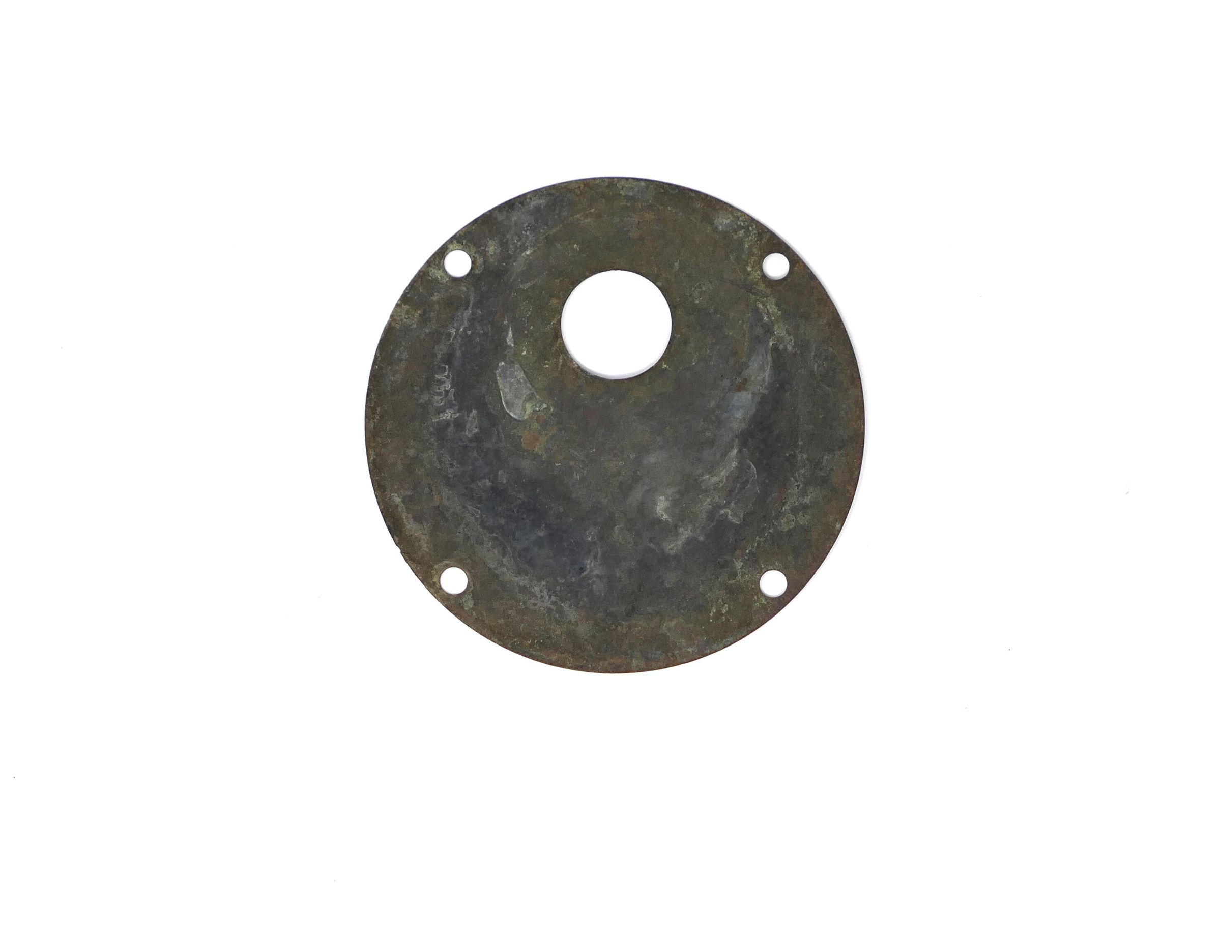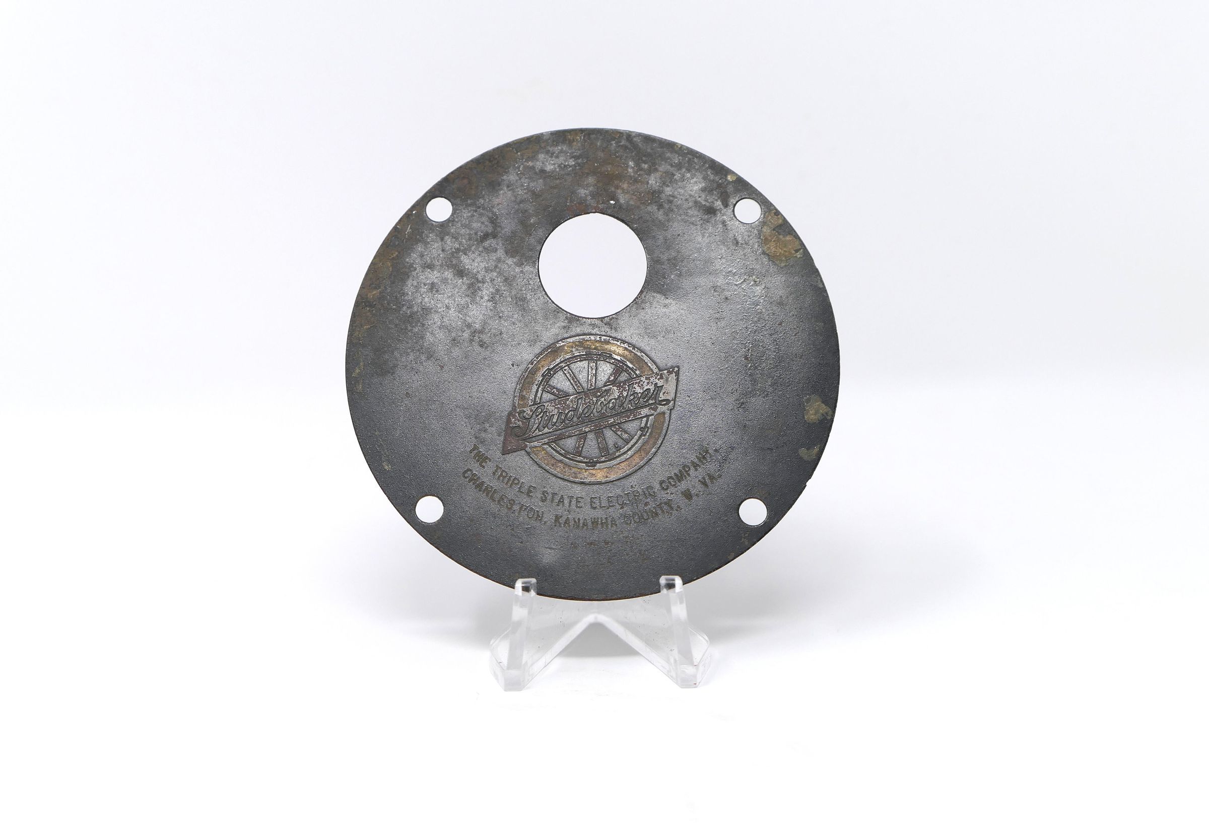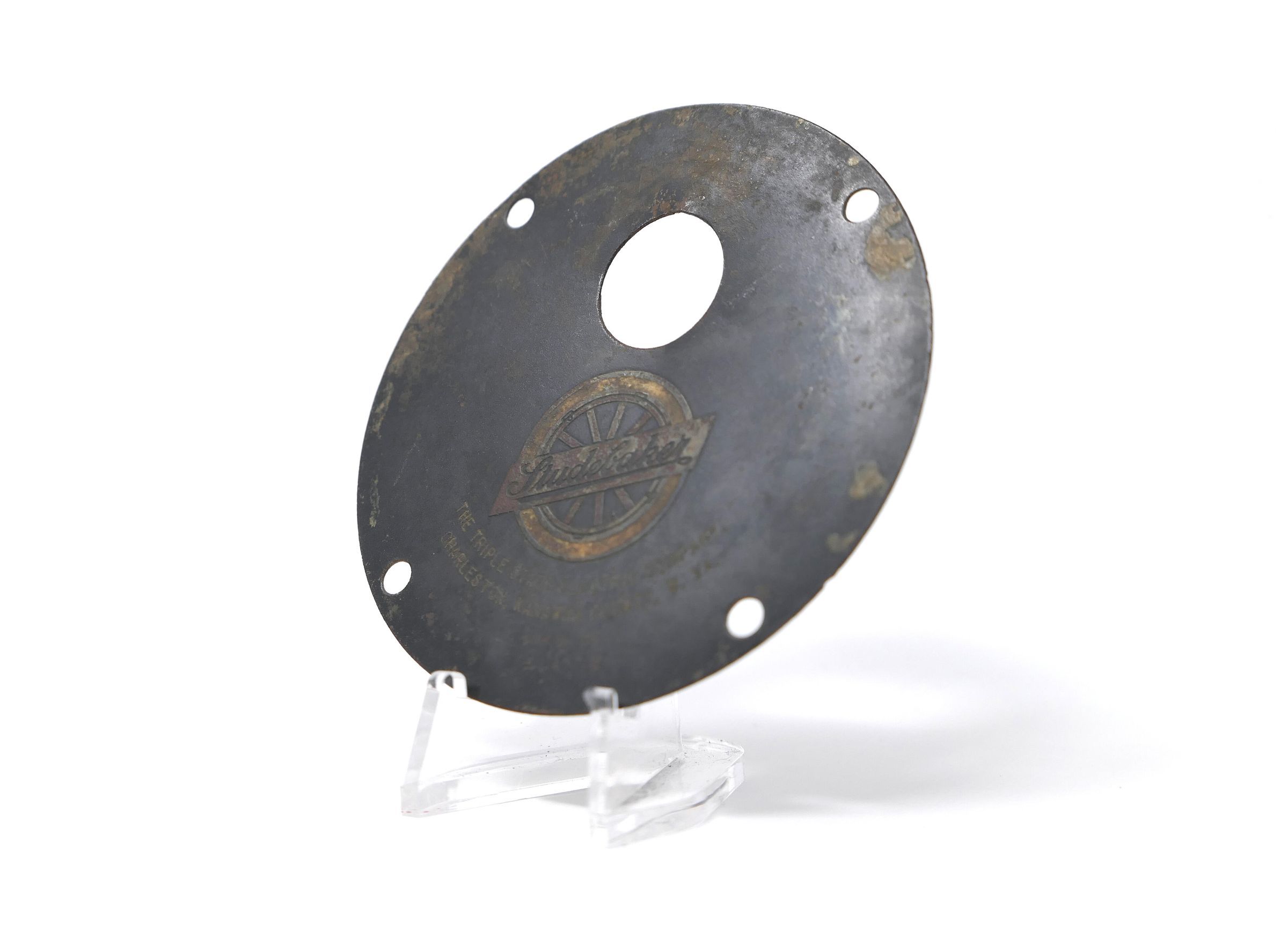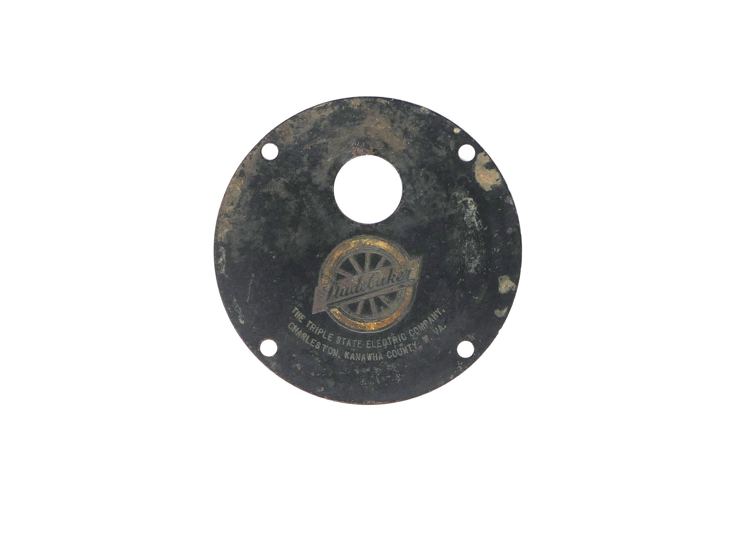 Circular brass cover plate for unknown part of Studebaker car, possibly an electric model, which were available in the early 1900s.Collection