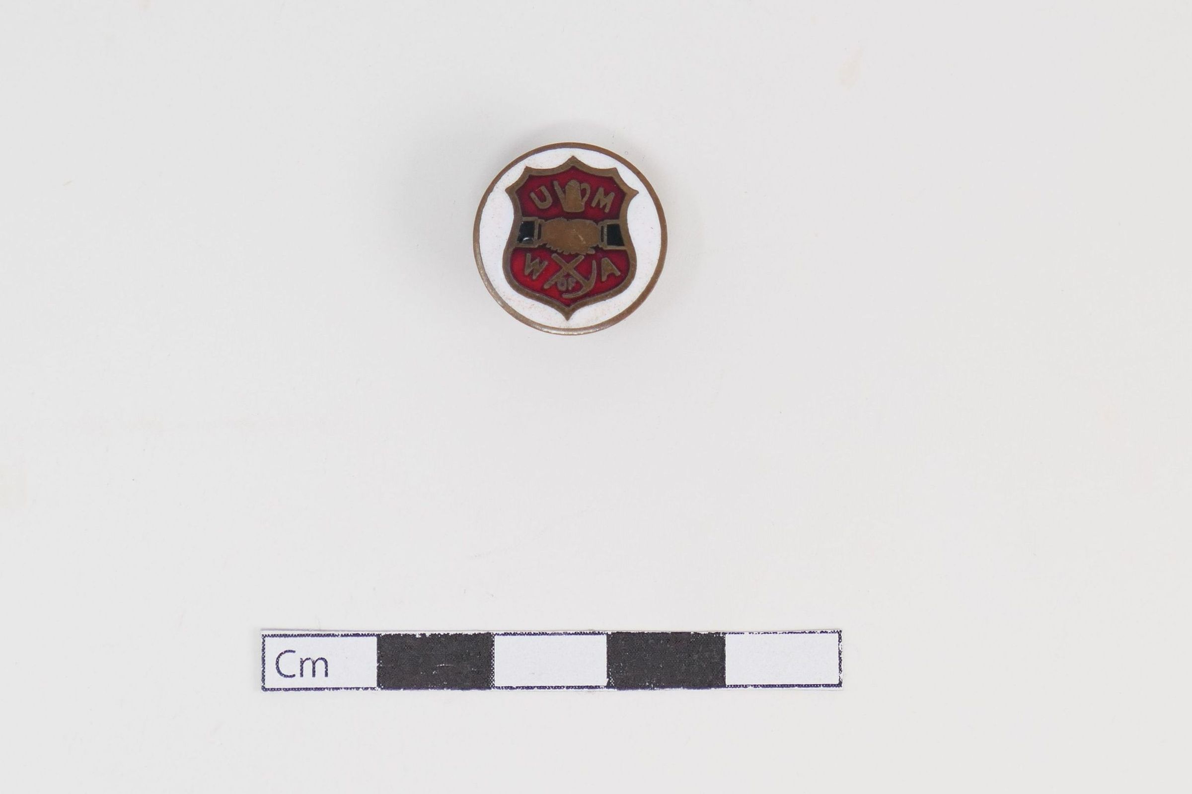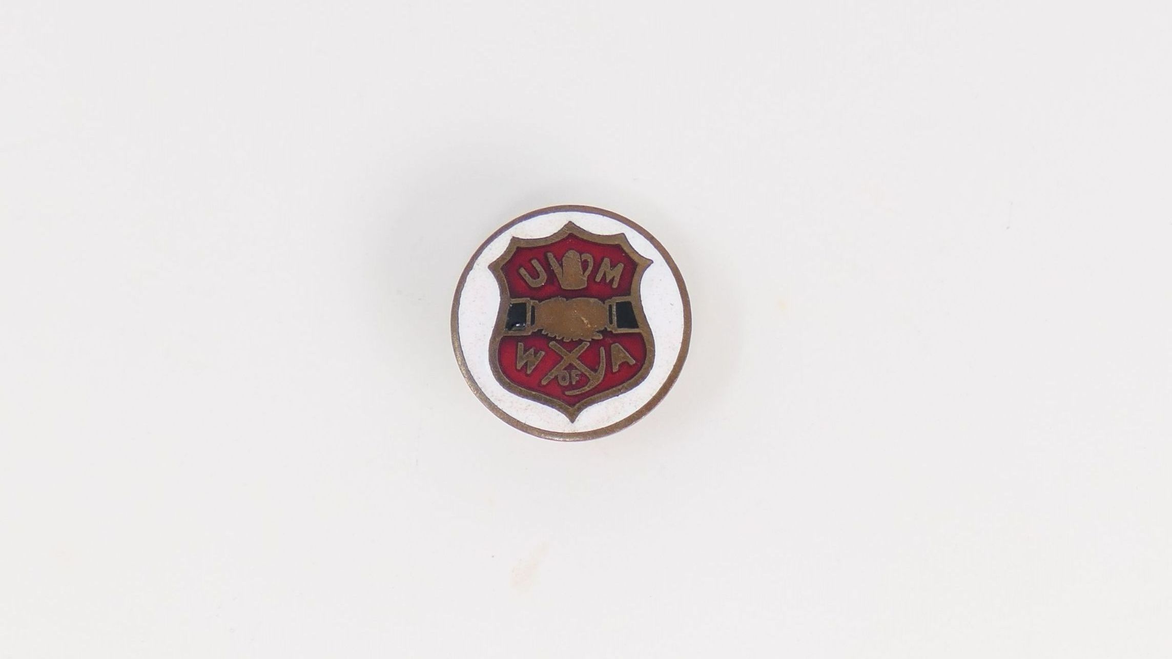 U.M.W.A Lapel pin with a depiction of two hands shaking with an oil lamp above and a pick and shovel below.Collection