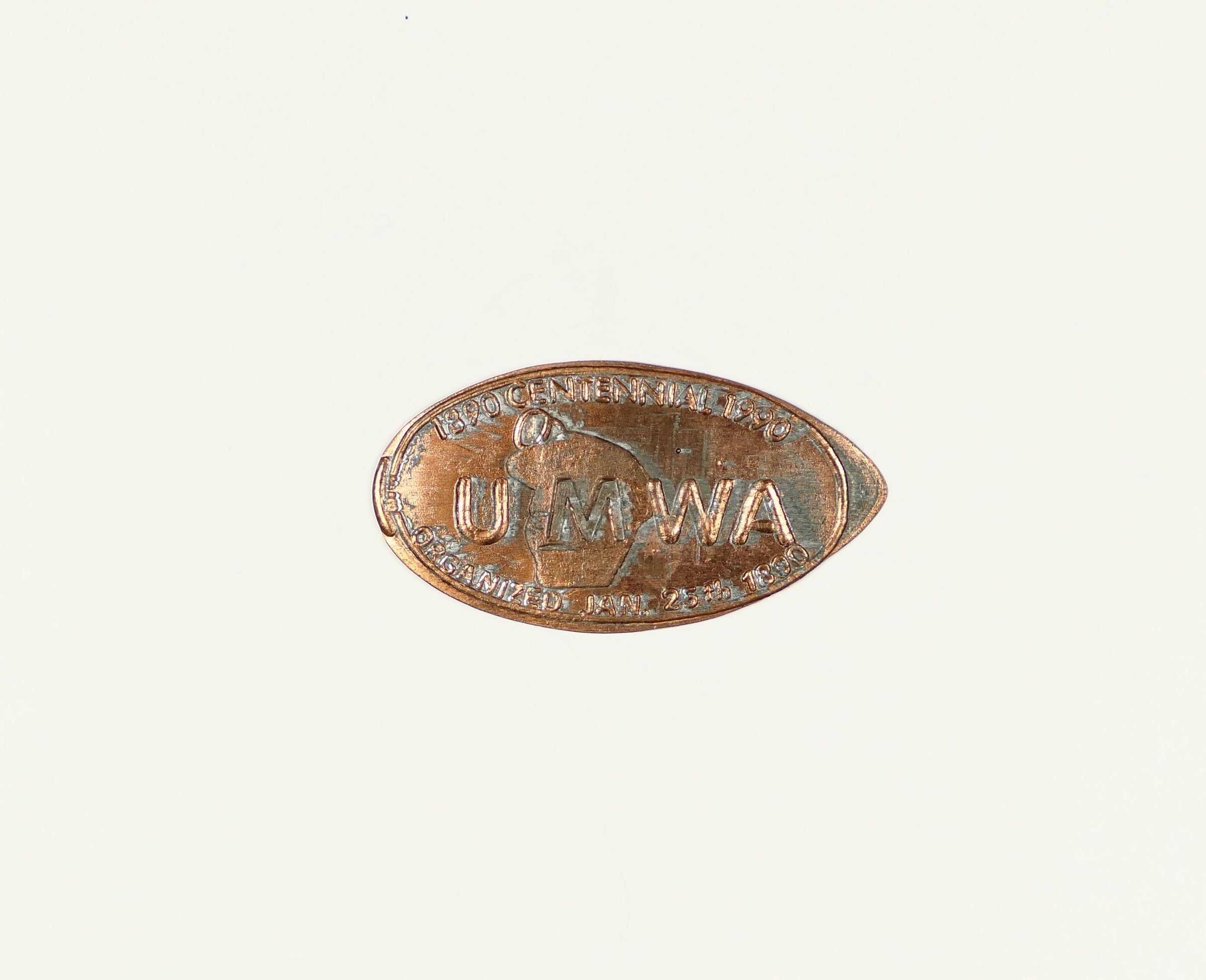 Souvenir elongated penny from United Mine Workers of America 1990 Centennial.Context