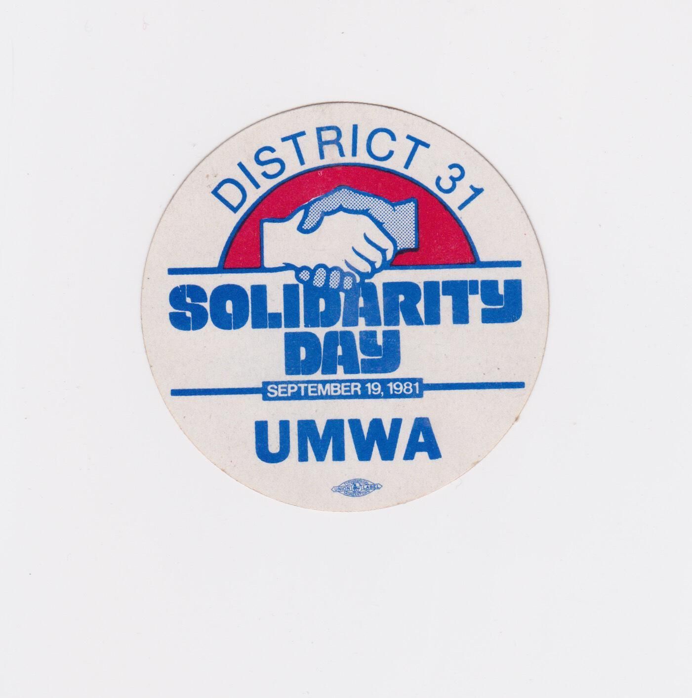 Die-cut paper sticker representing District 31 of the United Mine Workers during the first Solidarity Day march in Washington DC on September 19, 1981. Illustration depicts a handshake between white and dark-skinned hands.Context