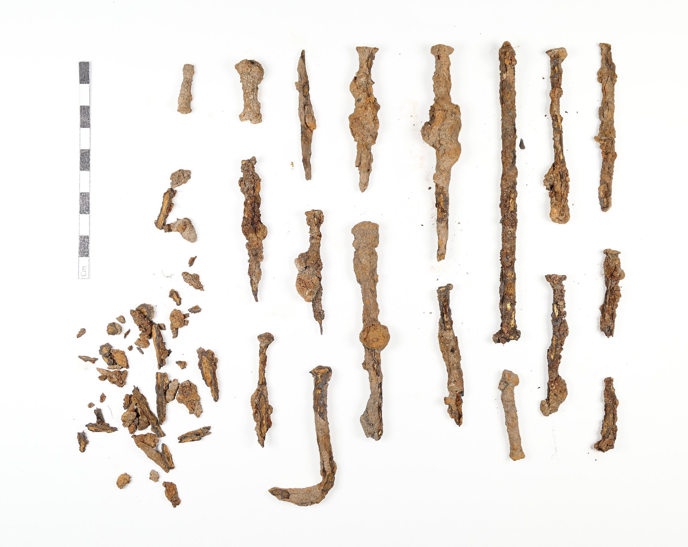approx 24 nails or other hardware + trace pieces of likely-related rusted metal,