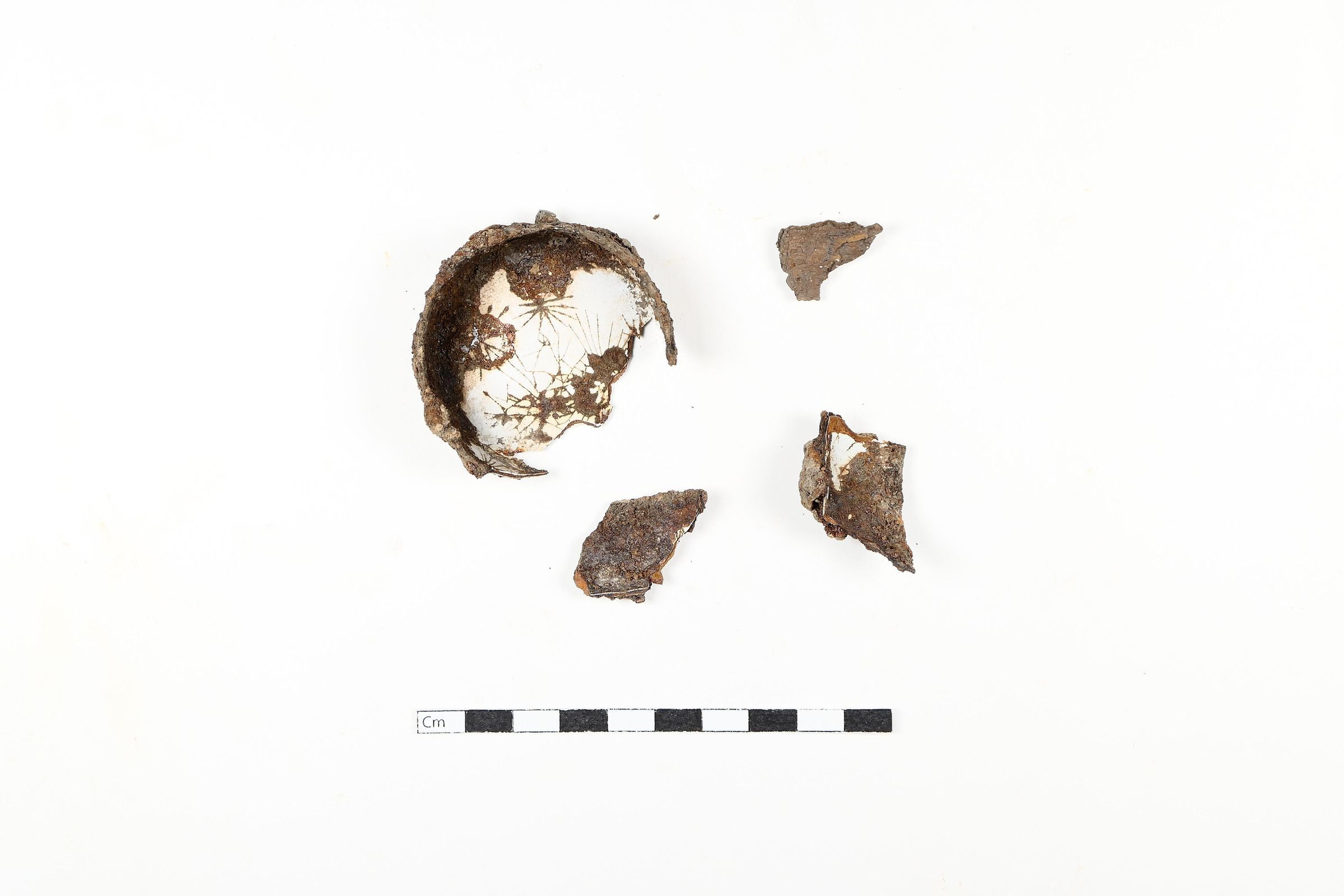 pieces of an enameled metal vessel.Context