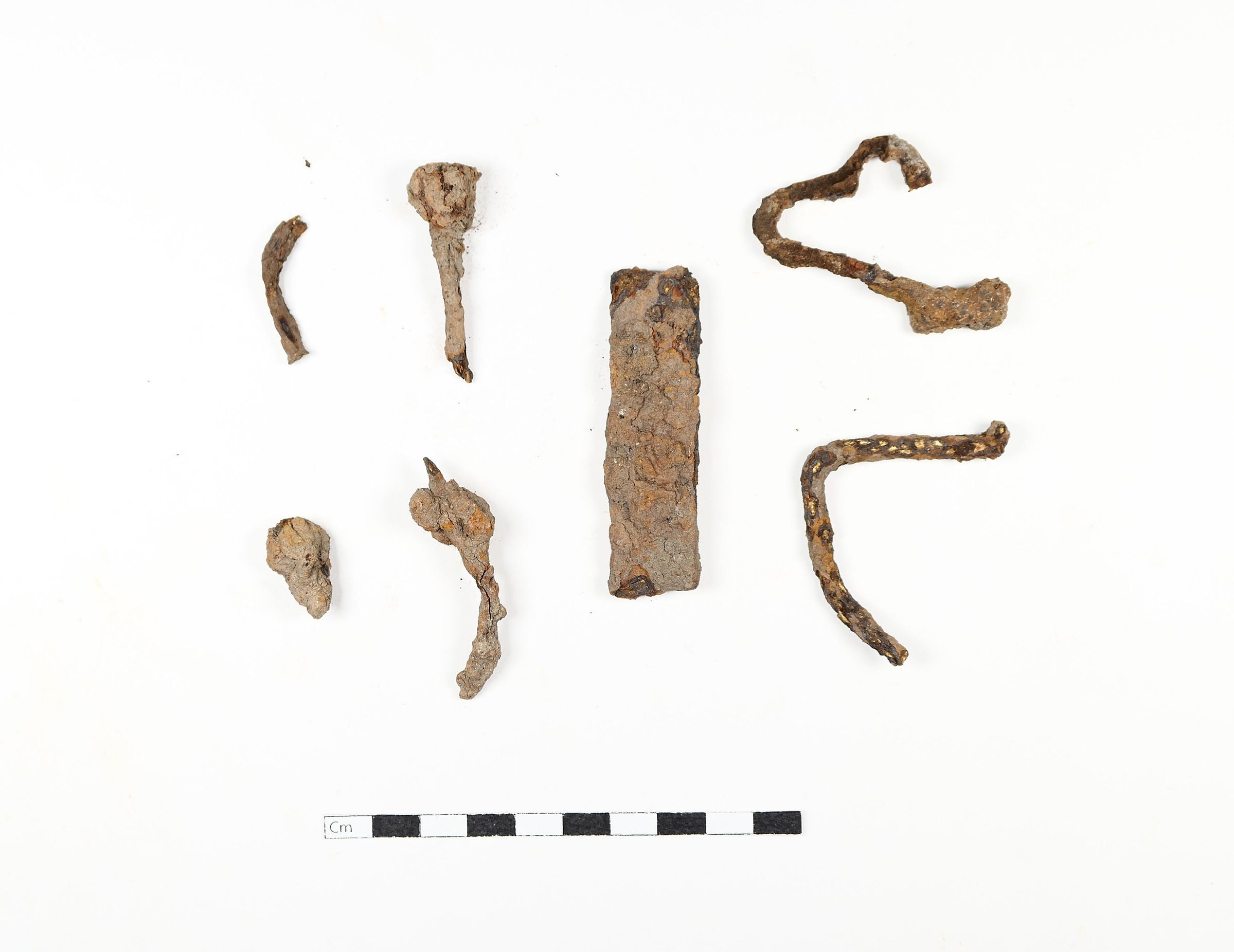 Seven (7) nails and other hardware + trace pieces of likely-related rusted metal