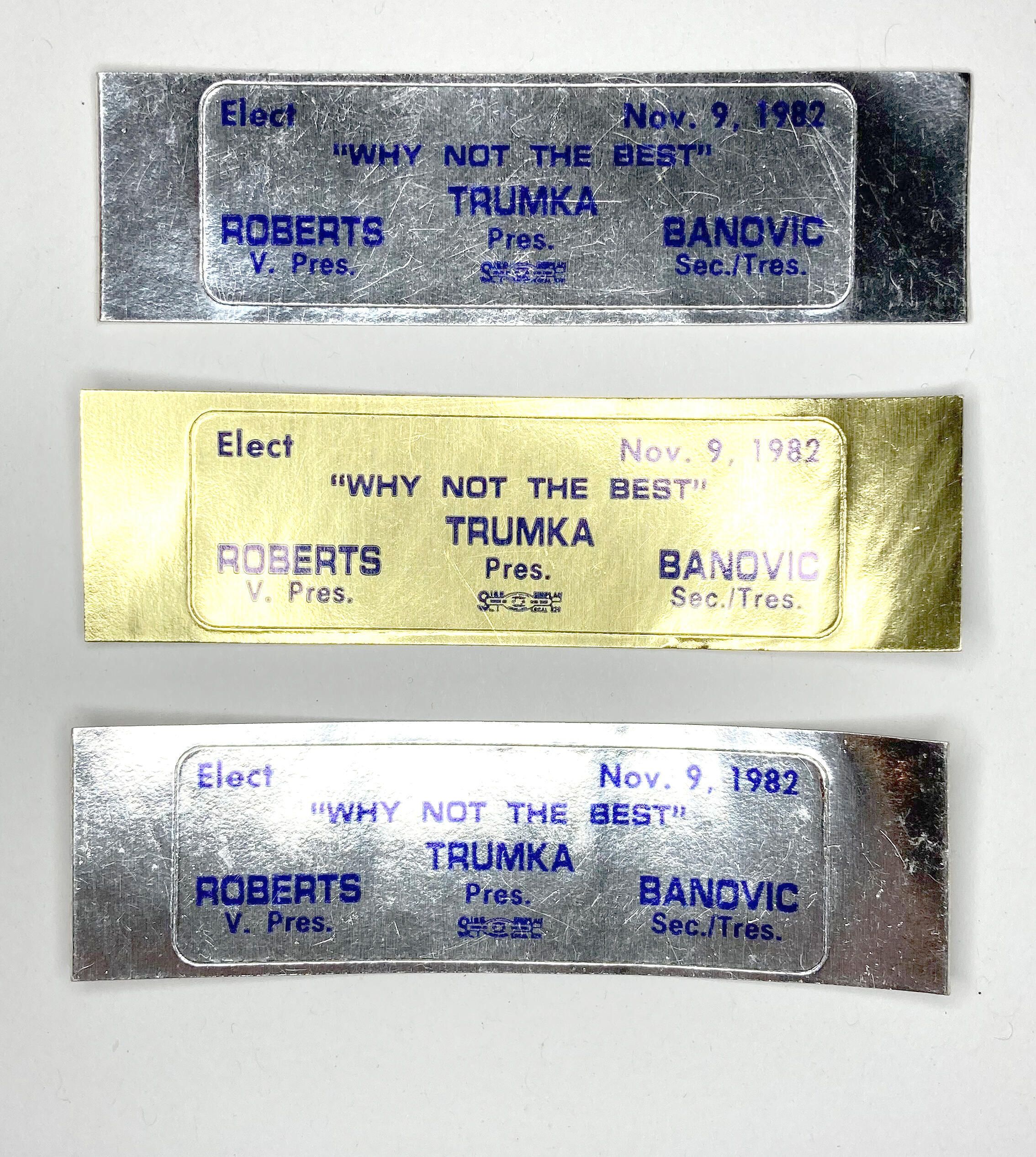 Die-cut chrome foil stickers declaring support for the election of Richard Trumka to President of the United Mine Workers, along with Cecil Roberts (Vice President), and John Banovic (Secretary-Treasurer).Context
