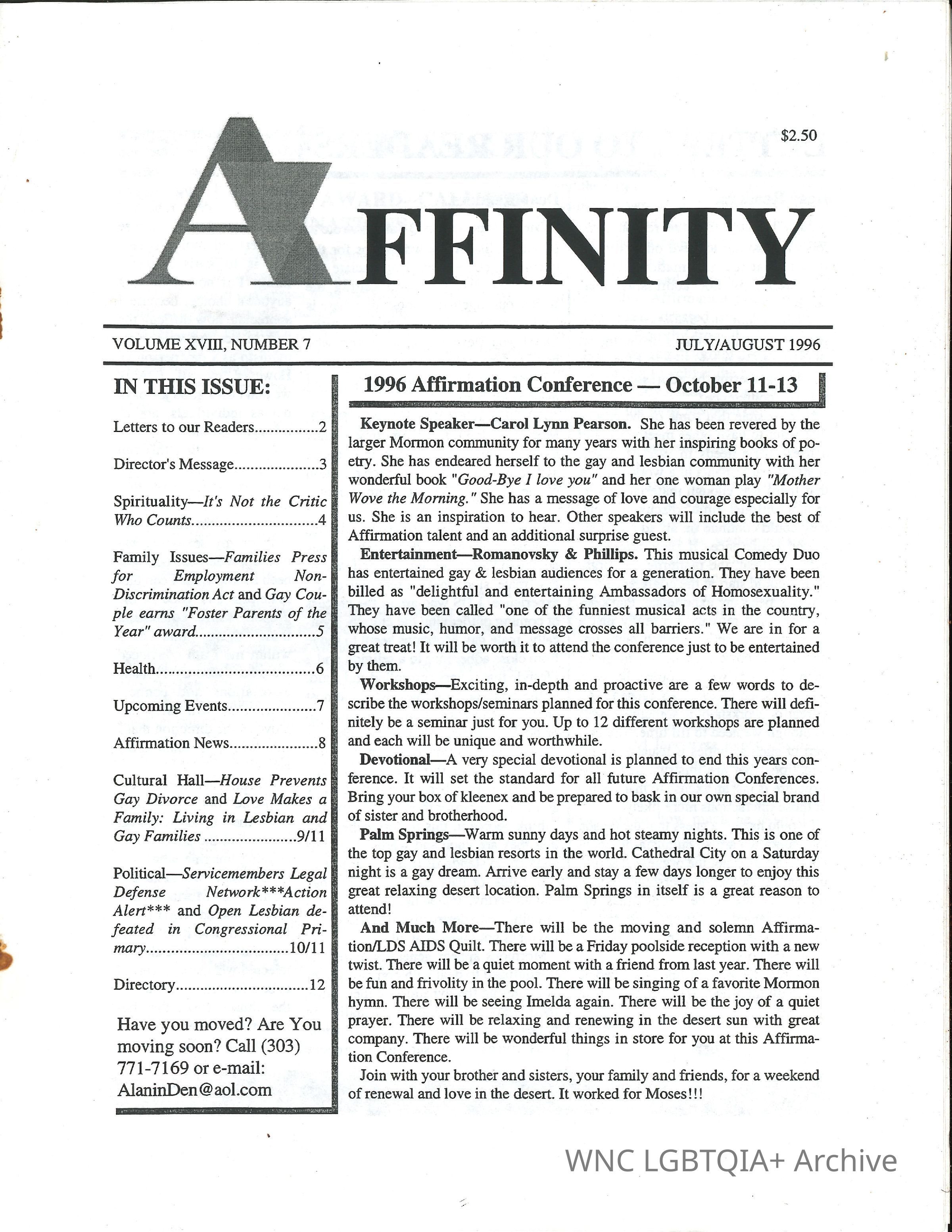 Organizational newsletter of Affirmation for Gay and Lesbian Mormons. 12 pages
