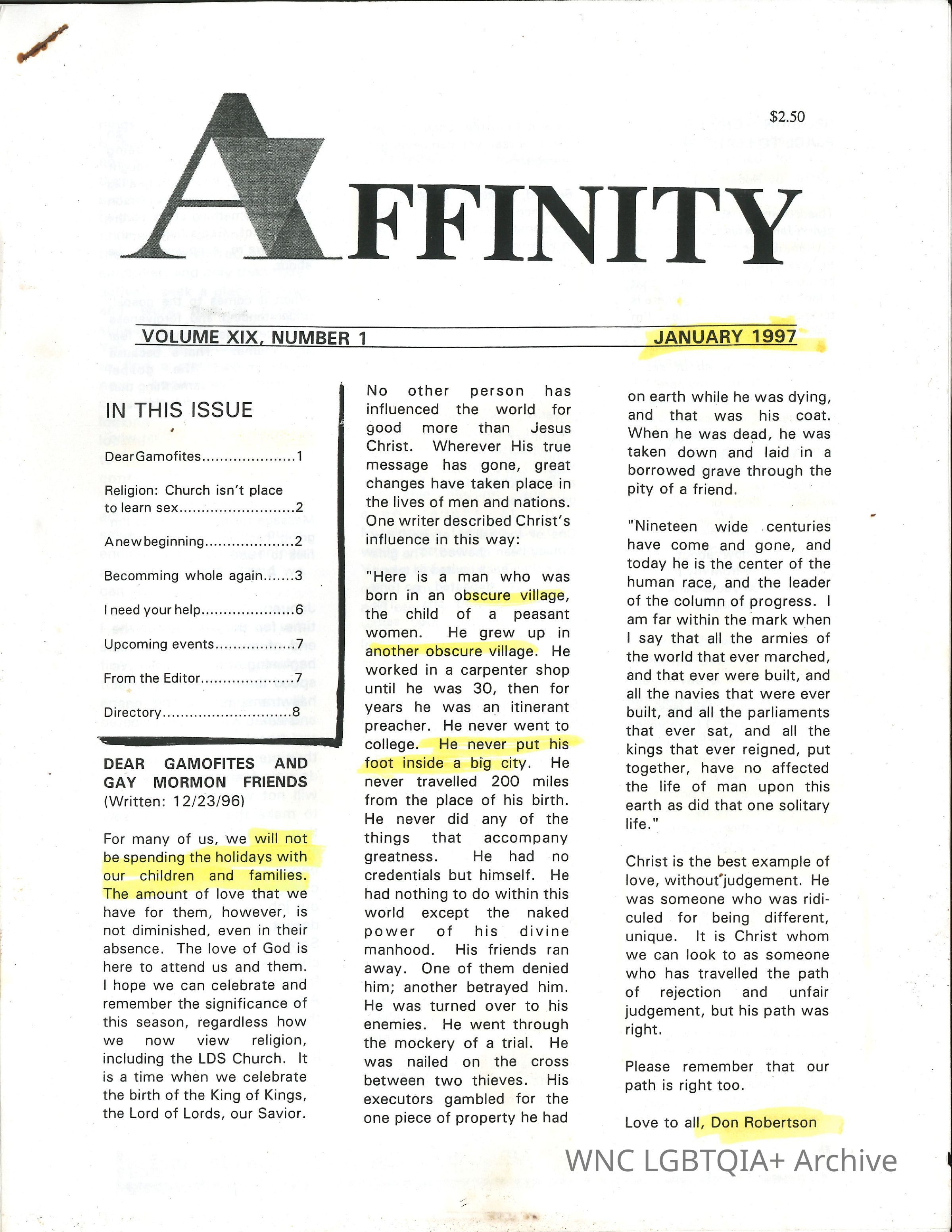Organizational newsletter of Affirmation for Gay and Lesbian Mormons. 8 pages.
