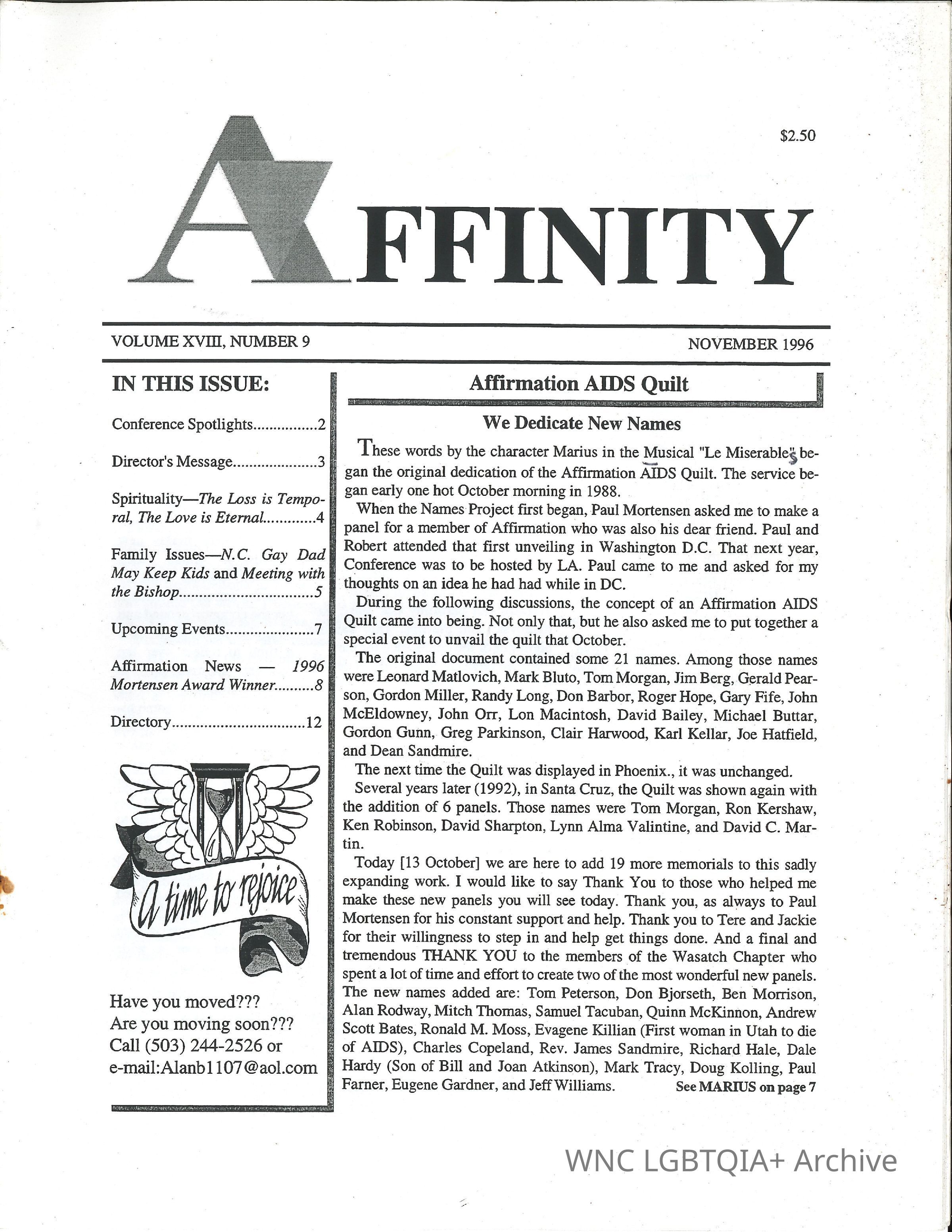 Organizational newsletter of Affirmation for Gay and Lesbian Mormons. 12 pages.